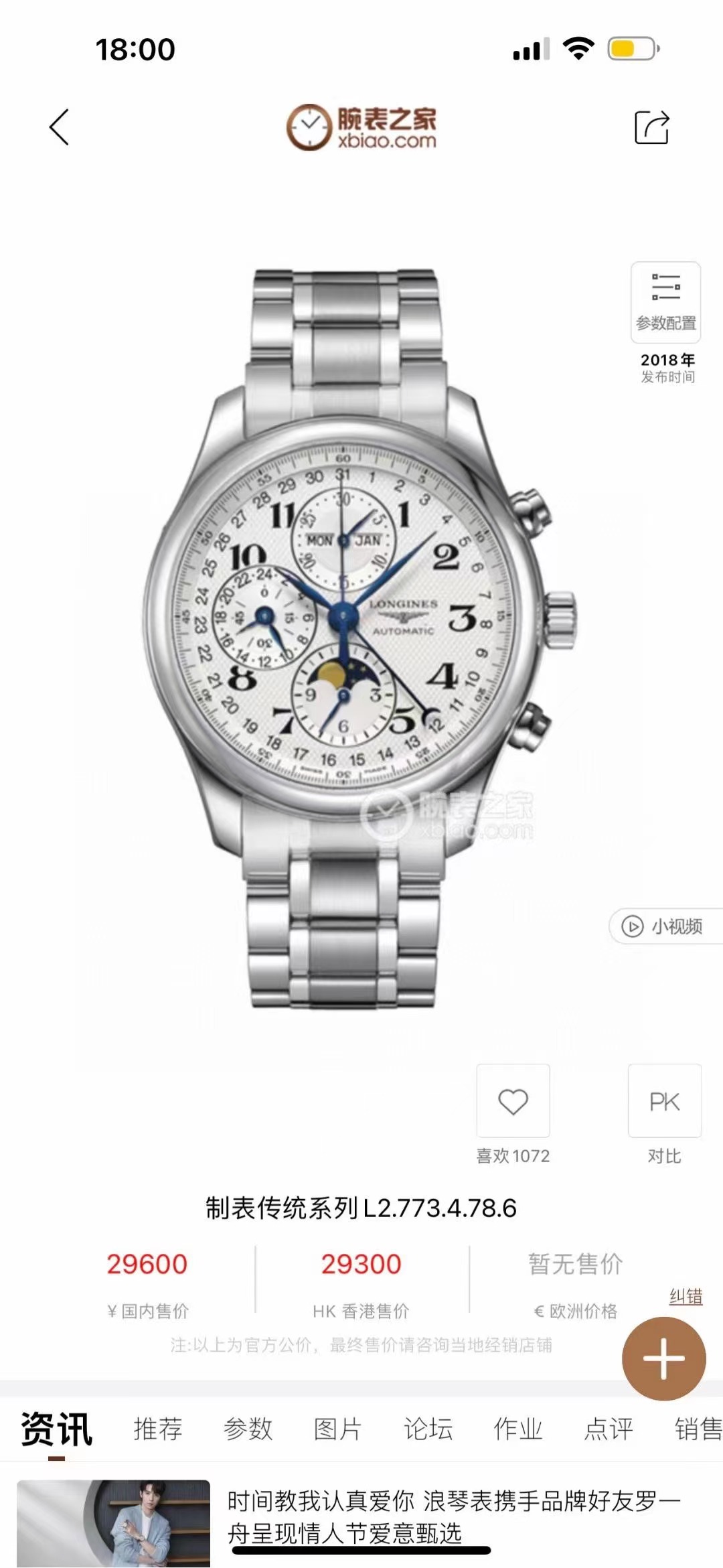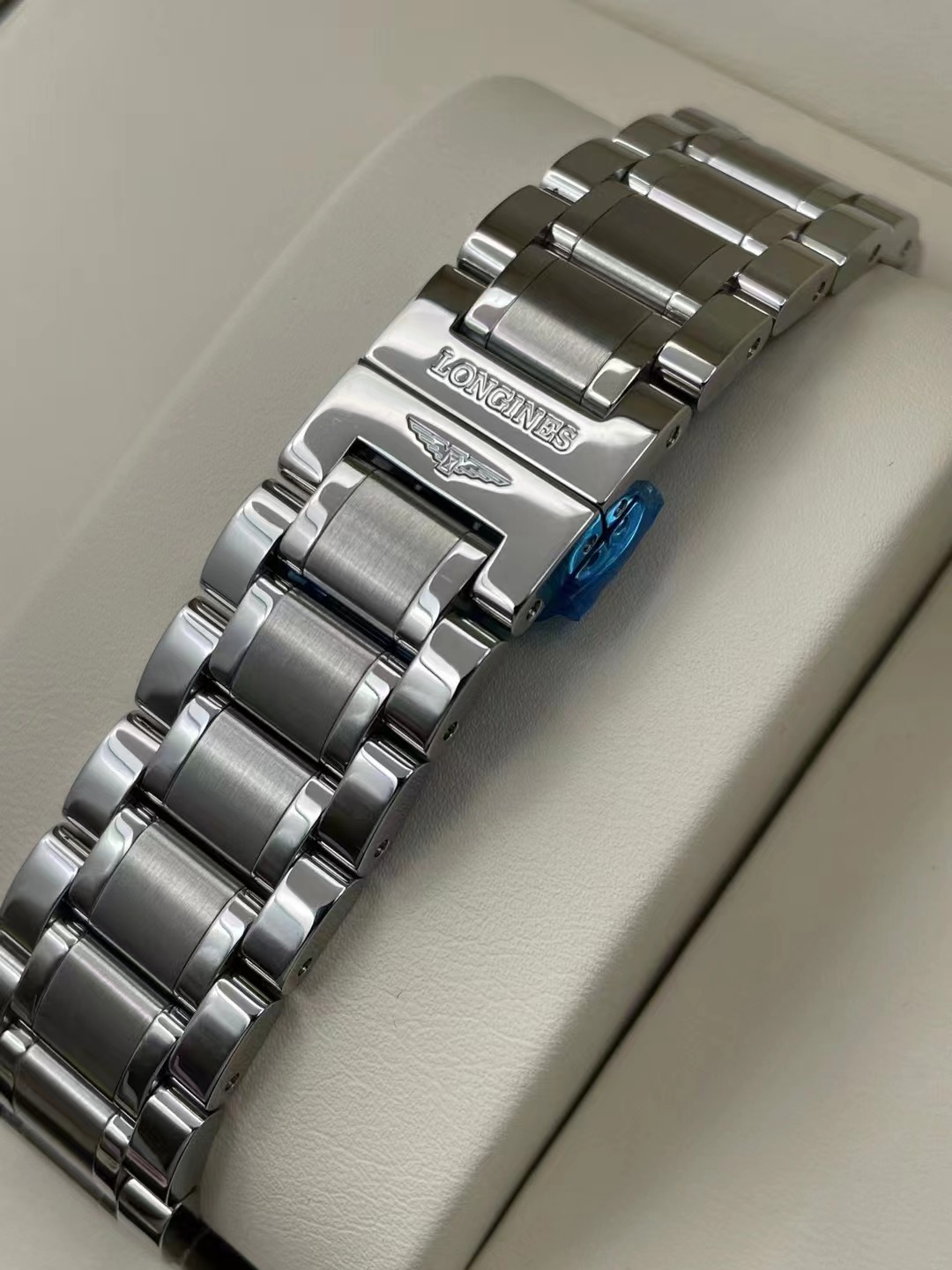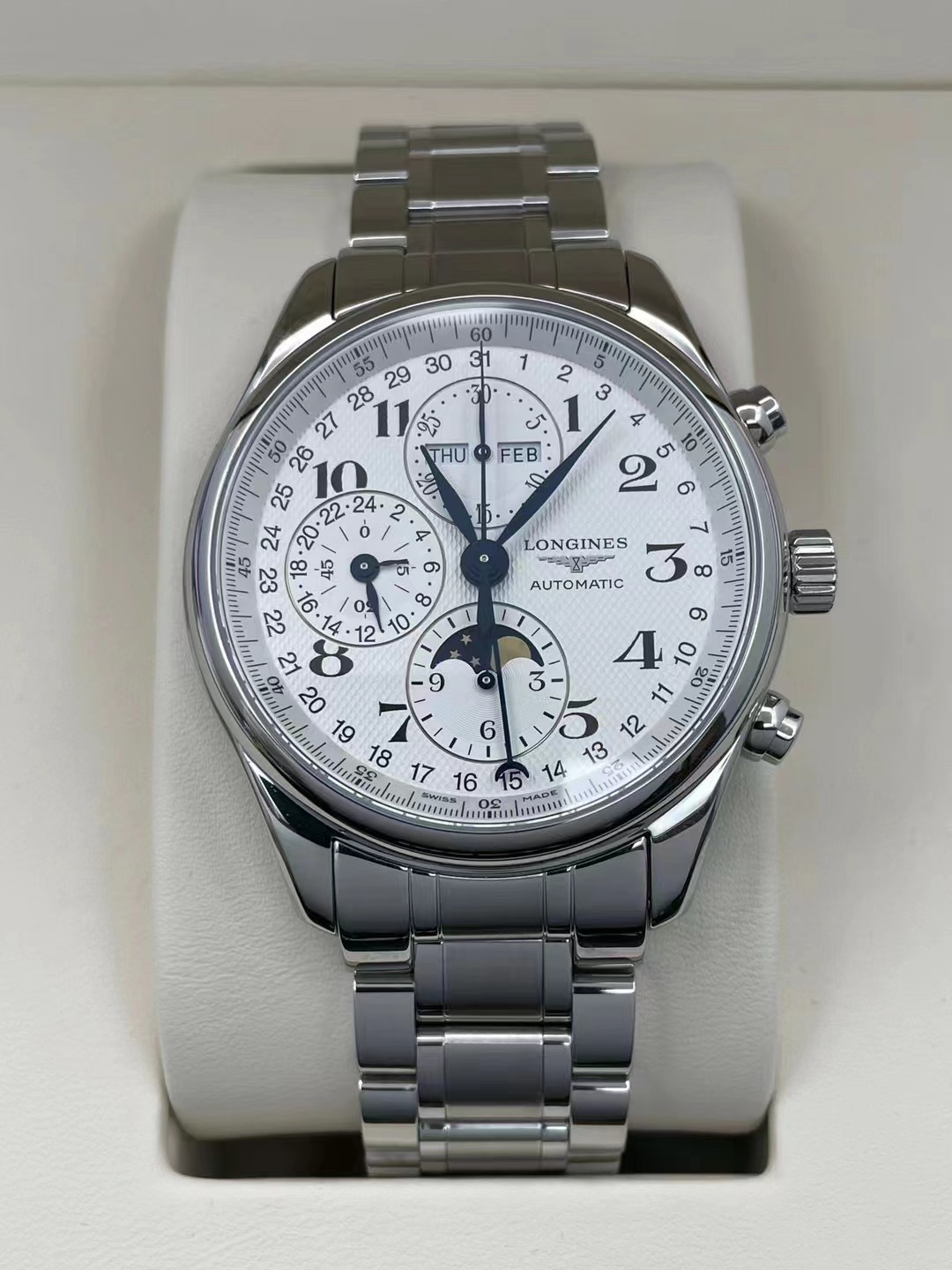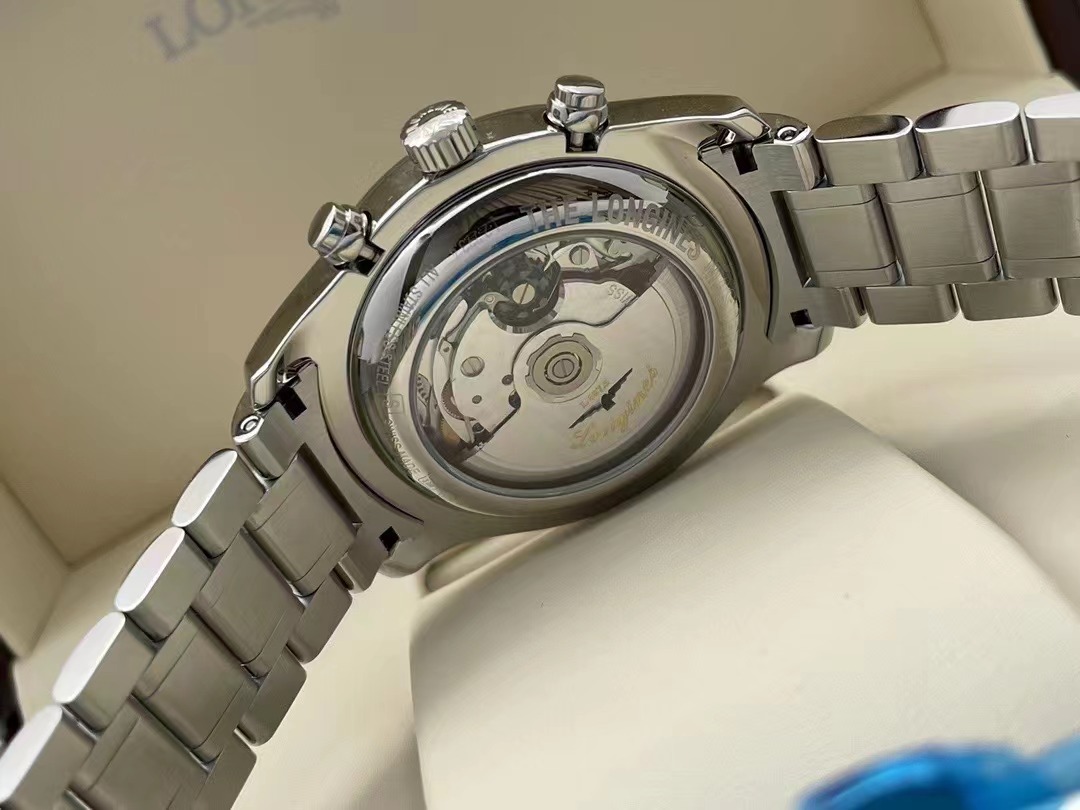 未使用 浪琴名匠机械男表,俗称八针月相,型号L2.773.4.78.6,表径42mm,新款镂空舵机芯,圆形银色表盘,背透,蝴蝶扣