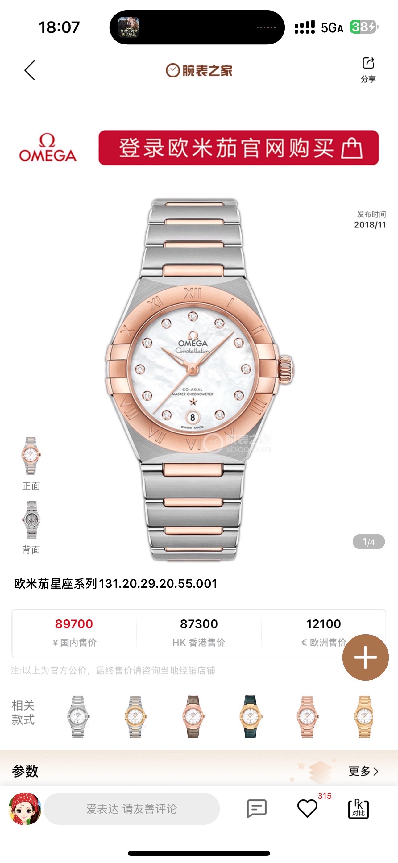 欧米茄/Omega 星座系列 131.20.29.20.55.001 自动上链 精钢‑Sedna 18K金 29 专柜价89700~