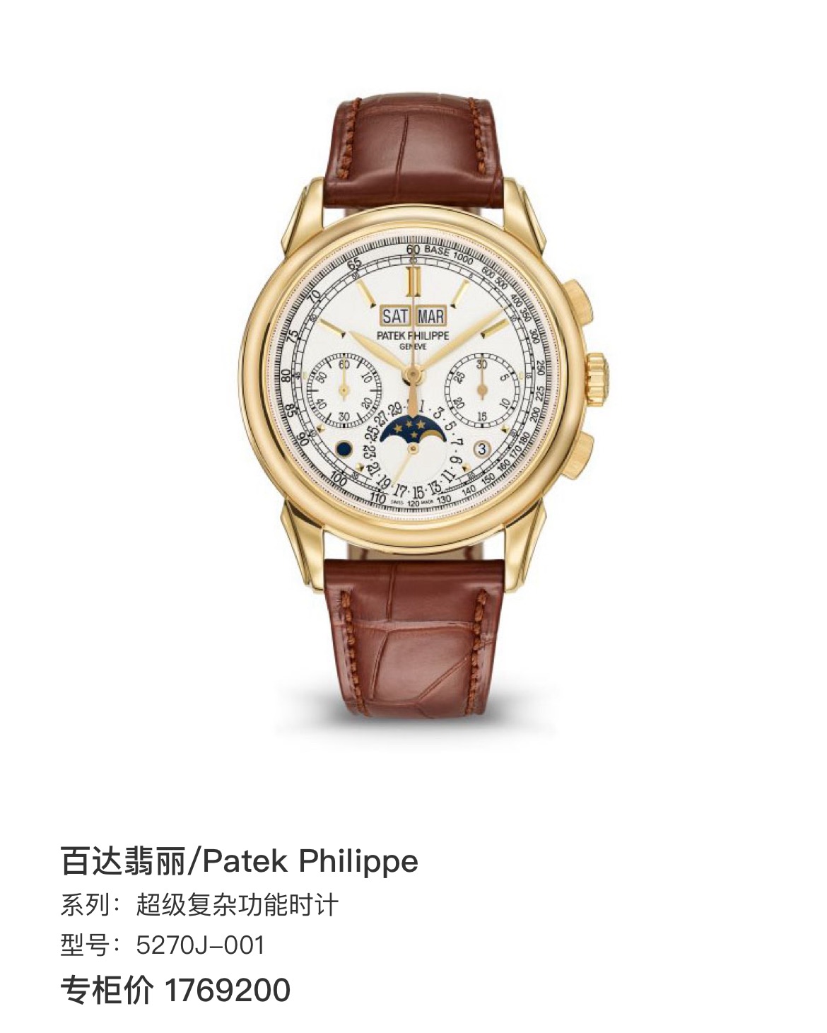 百达翡丽/Patek Philippe 超级复杂功能时计 5270J-001 手动拉玛尼亚经典机芯,18K黄金,表经41毫米,万年历,2020年国行大全套/有发票,专柜价1769200
