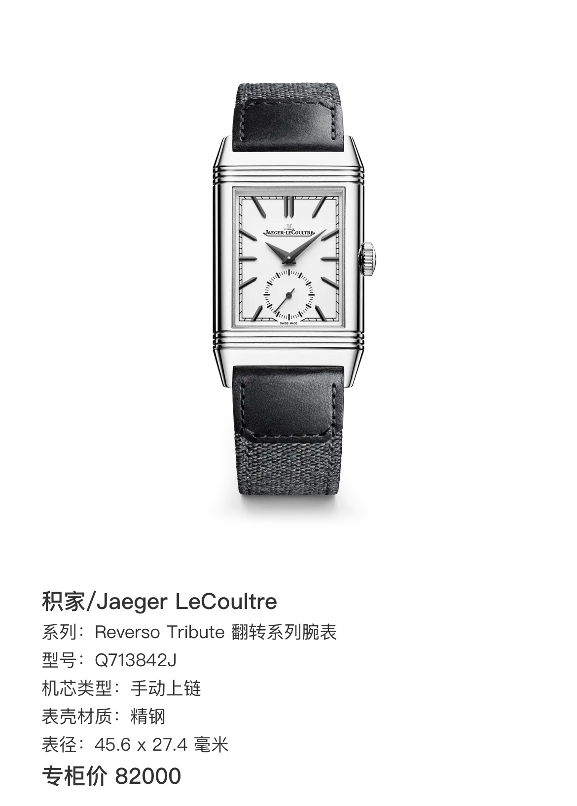 积家/Jaeger LeCoultre Reverso Tribute 翻转系列腕表 190周年庆典款Q713842 手动上链,精钢,表经45.6 x 27.4 毫米,2024年3月全新全套/全膜,已延保8年,专柜价82000
