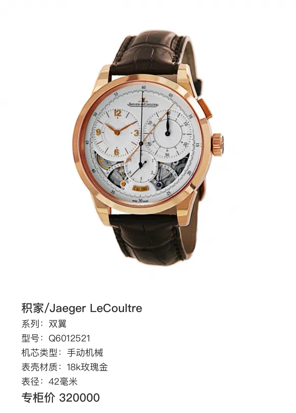 积家/Jaeger LeCoultre 双翼 Q6012521 手动机械,18k玫瑰金,表经42毫米,2018年全套,原始极品状态新.专柜价320000