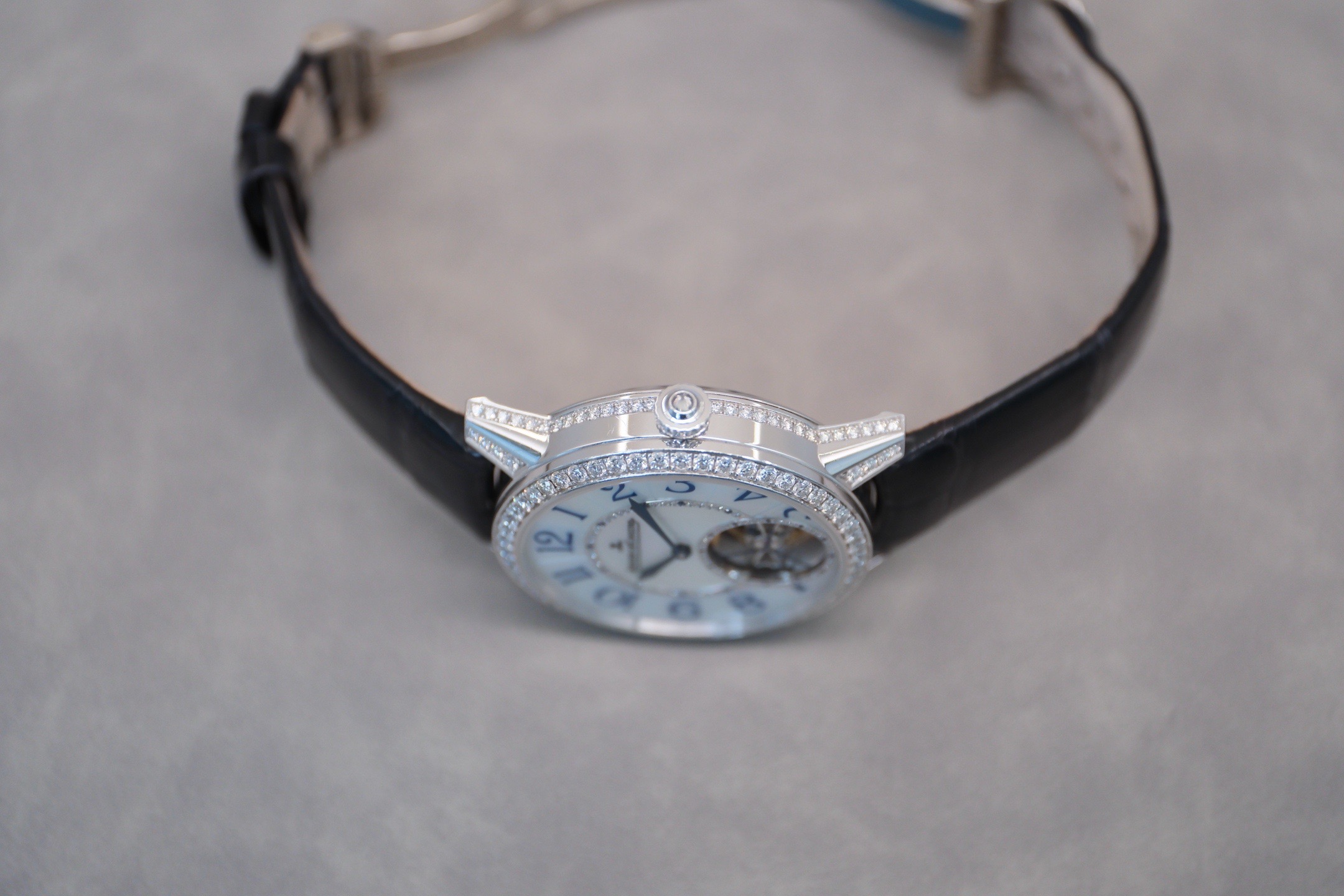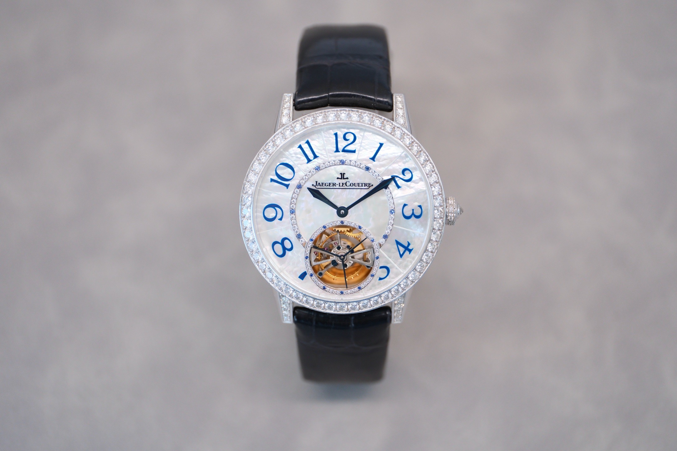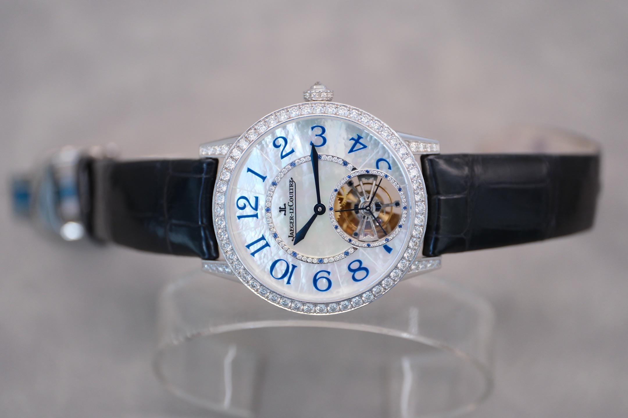 积家/Jaeger LeCoultre 约会 Q3413408 贝母盘 陀飞轮,自动机械,18k白金镶钻,蓝宝石: ~21,钻石:~233颗~2.84 克拉,表经39MM,2016年大全套,专柜价725000