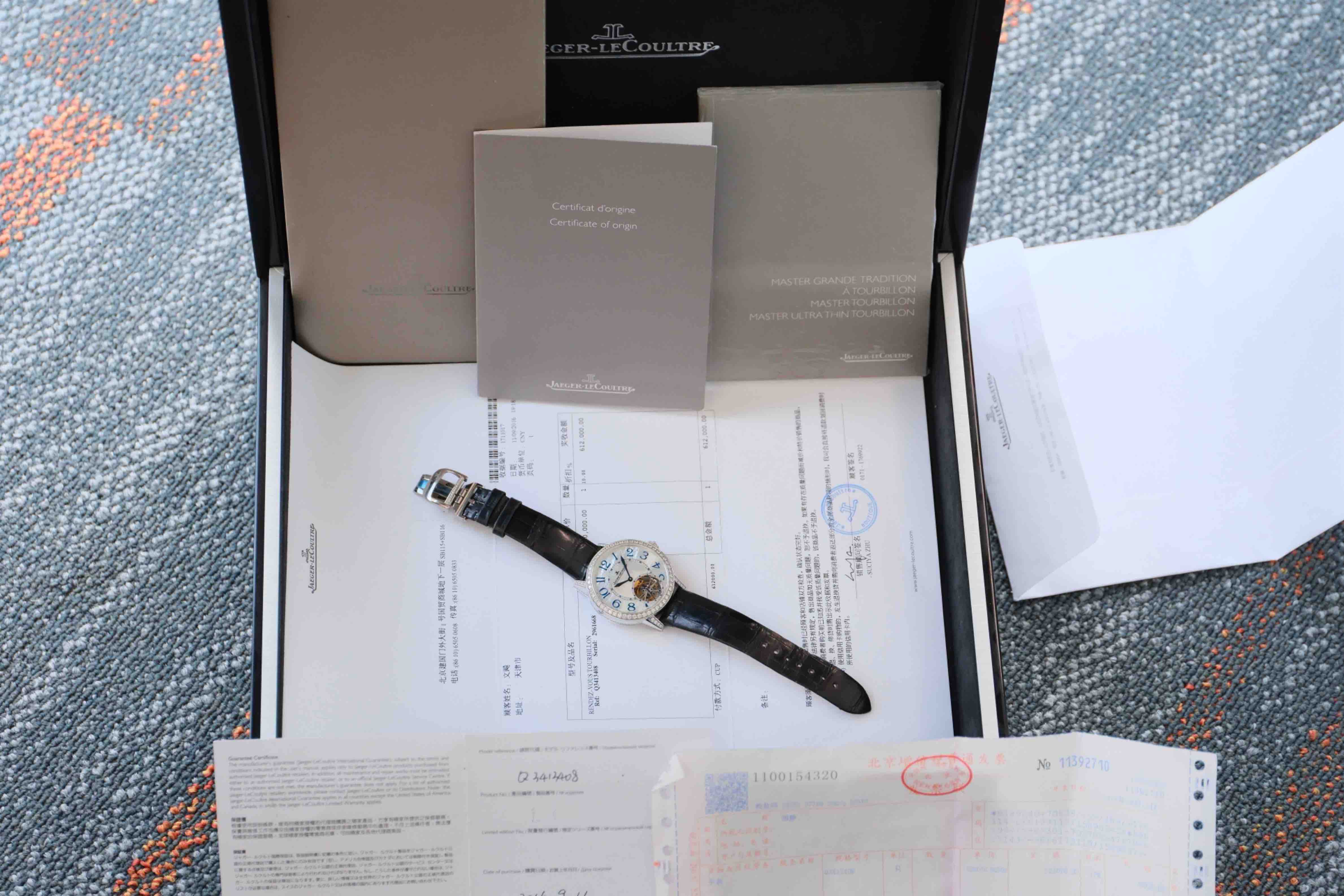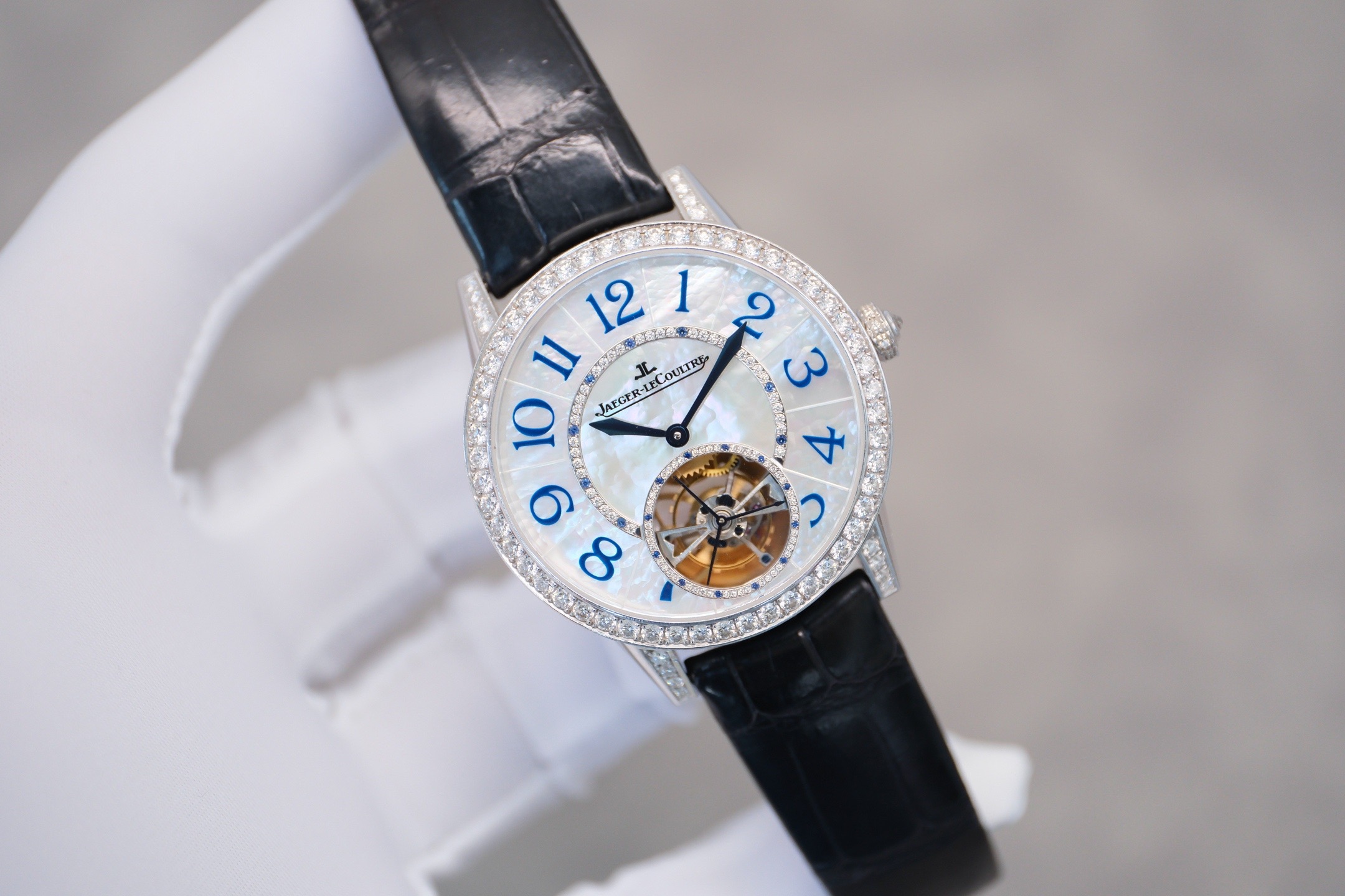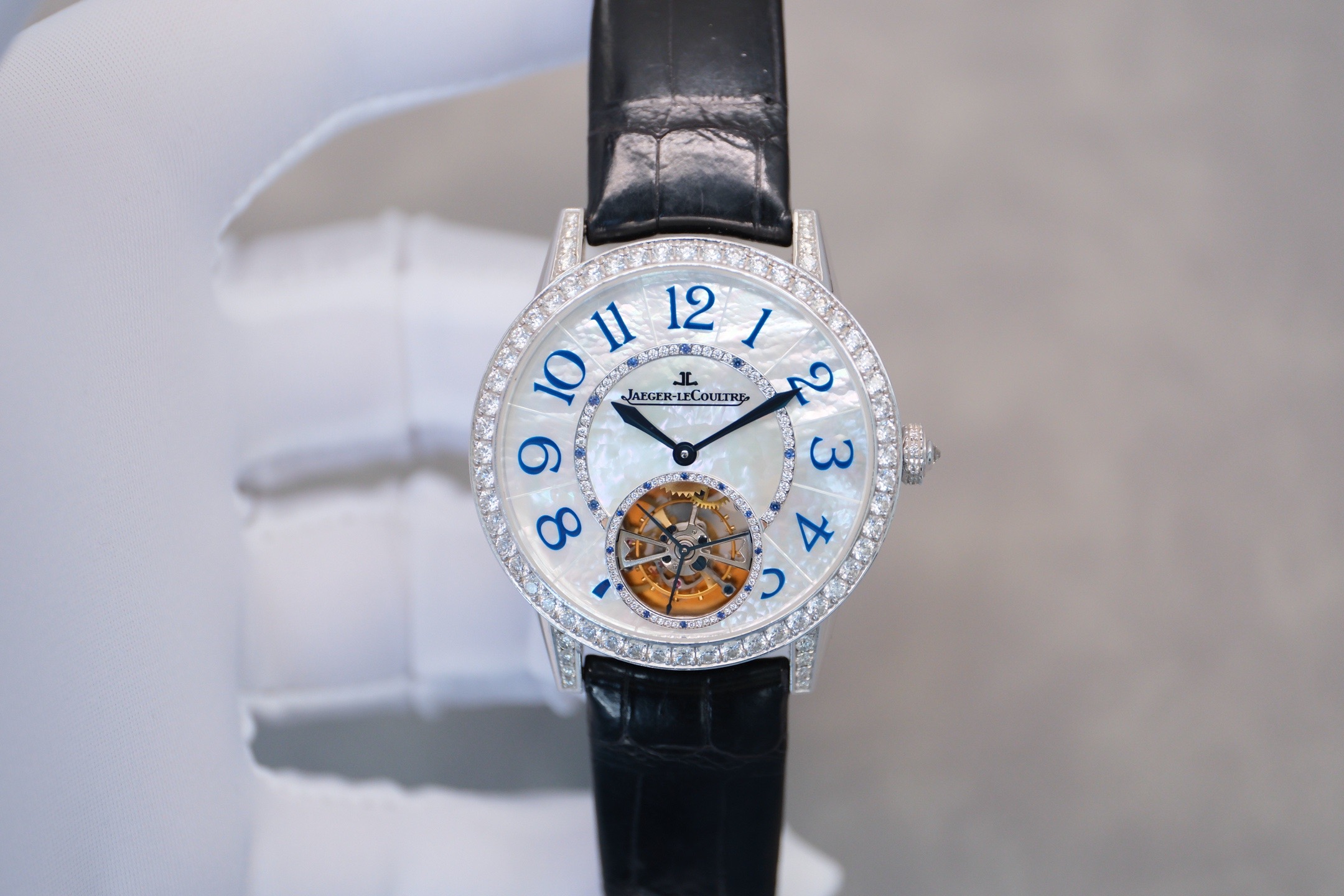 积家/Jaeger LeCoultre 约会 Q3413408 贝母盘 陀飞轮,自动机械,18k白金镶钻,蓝宝石: ~21,钻石:~233颗~2.84 克拉,表经39MM,2016年大全套,专柜价725000
