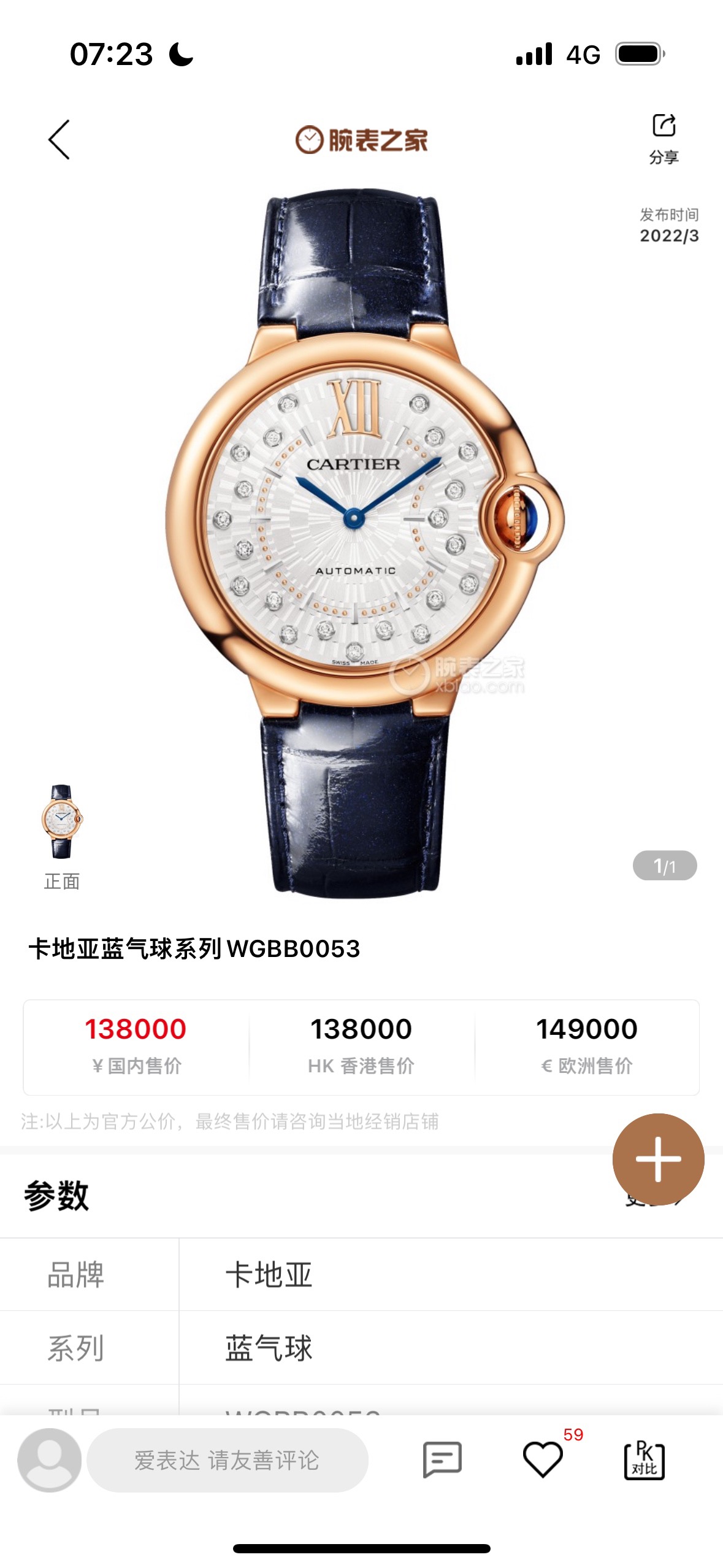 卡地亚蓝气球BALLON BLANCWGBB0053机械女性