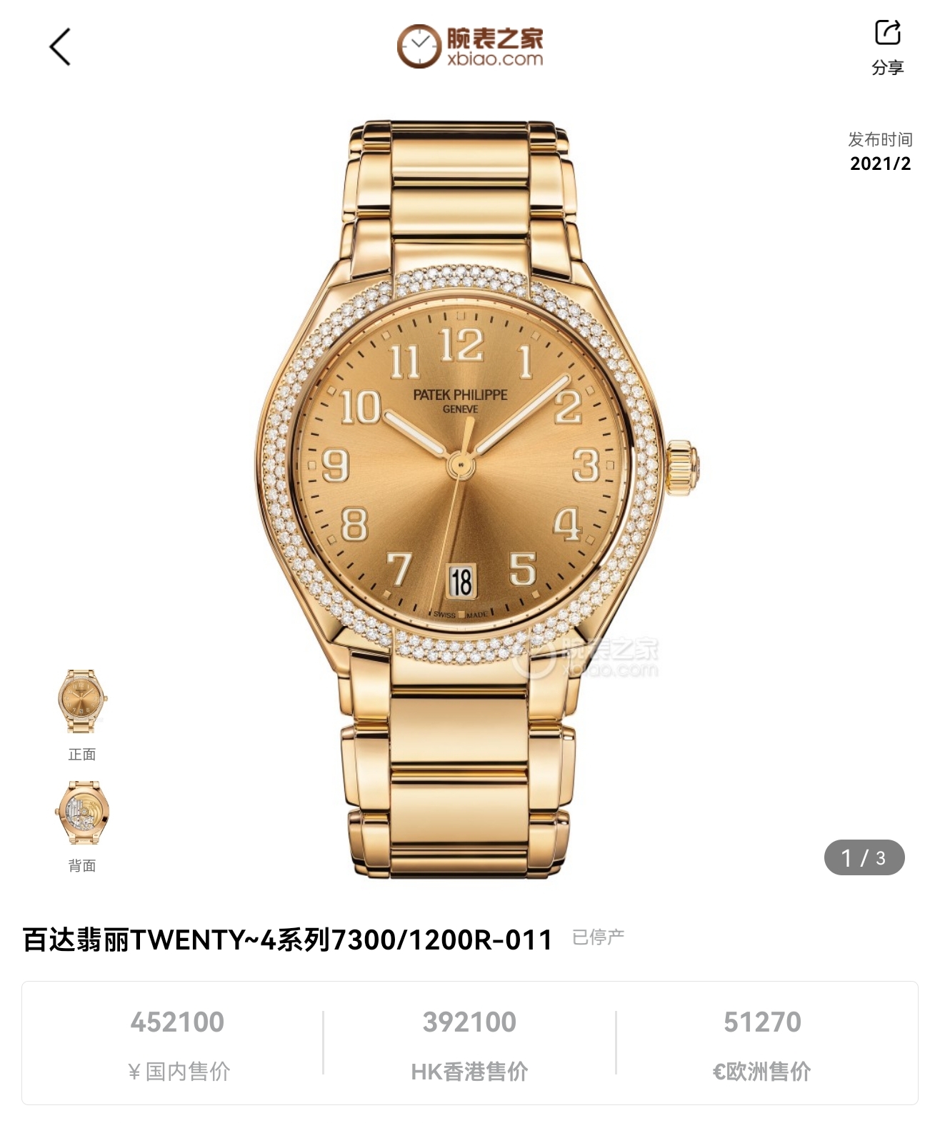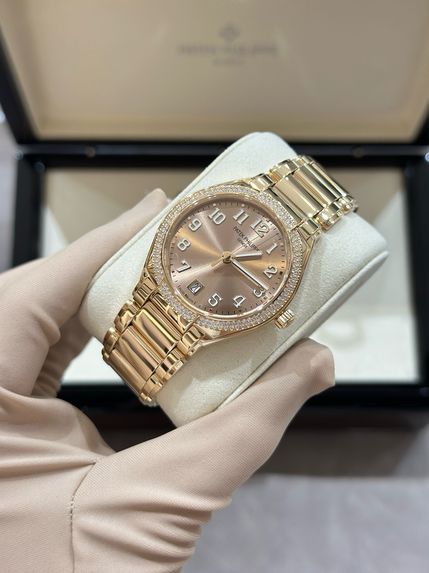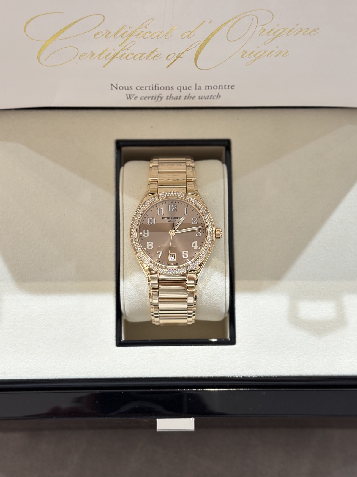 【8月卡7300R香槟】PATEK PHILIPP百达翡丽TWENTY~4系列7300/1200R-011,自动机械女表,18k玫瑰金材质,背透机芯,双排圈钻香槟盘,36mm表径,公价452100,停产款,现货8月未使用全套