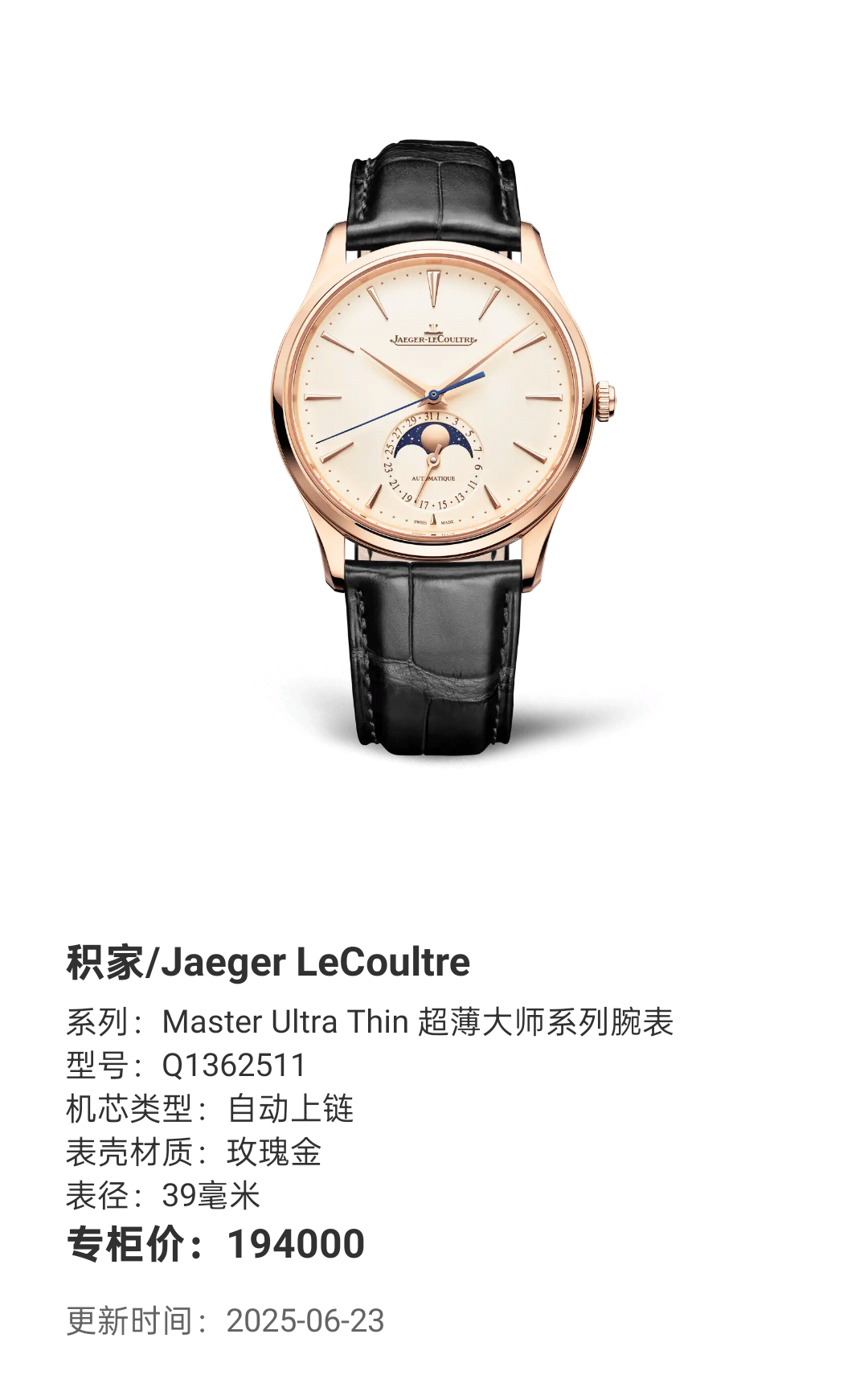 积家/Jaeger LeCoultre Master Ultra Thin 超薄大师系列腕表 Q1362511 自动上链 玫瑰金 39毫米 专柜价194000~