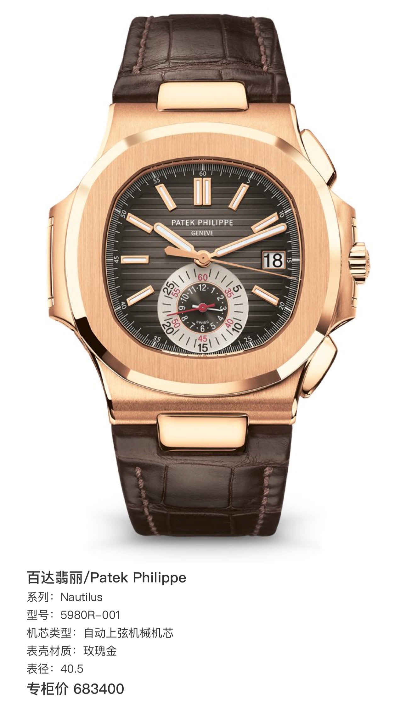 百达翡丽5980R-001 自动上弦机械机芯 玫瑰金 40.5 专柜价683400