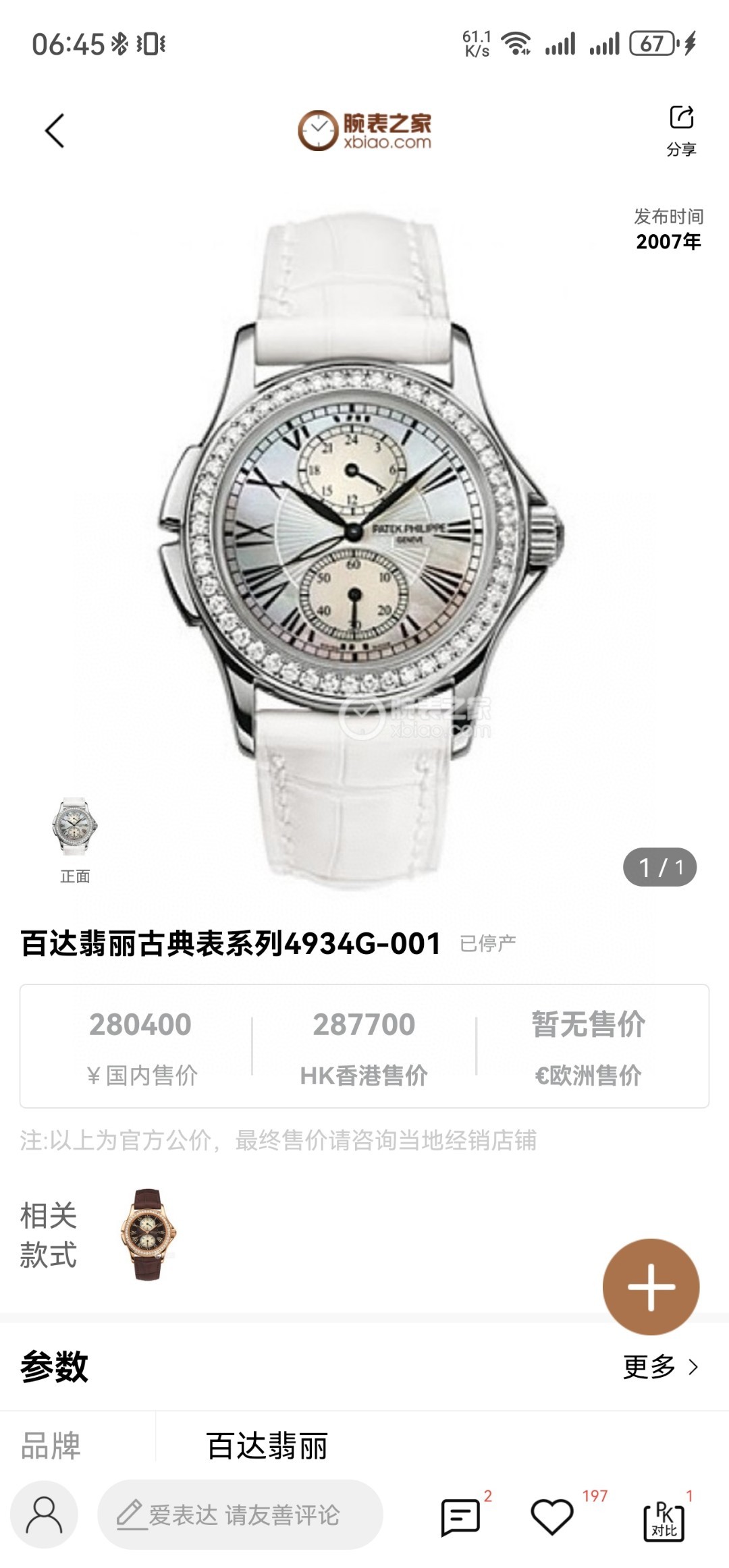 公价280400百达翡丽古典表系列 型号4934G-001手动机械35mm表径 18k白金 材质 双时区 显示功能 10年保卡