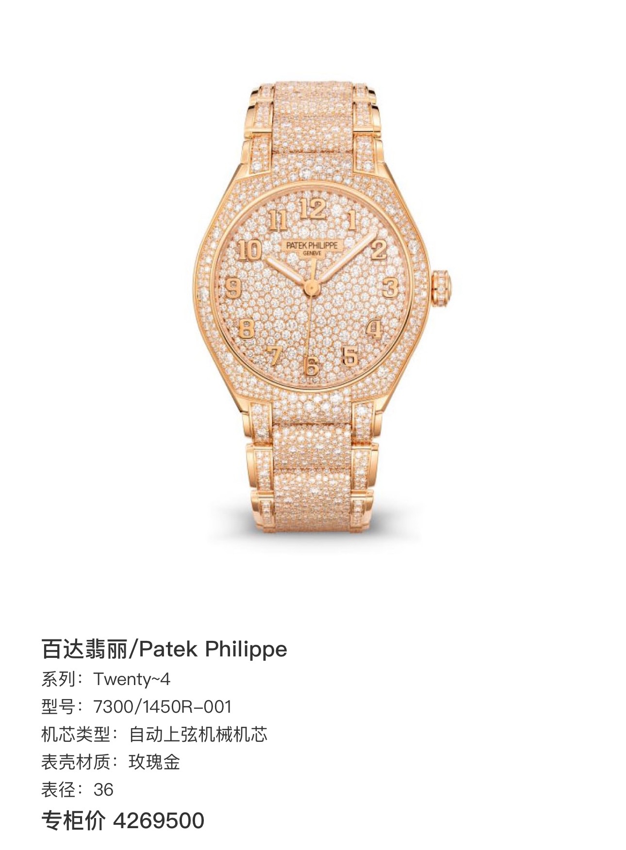 百达翡丽7300/1450R-001 自动上弦机械机芯 玫瑰金 36 专柜价4269500