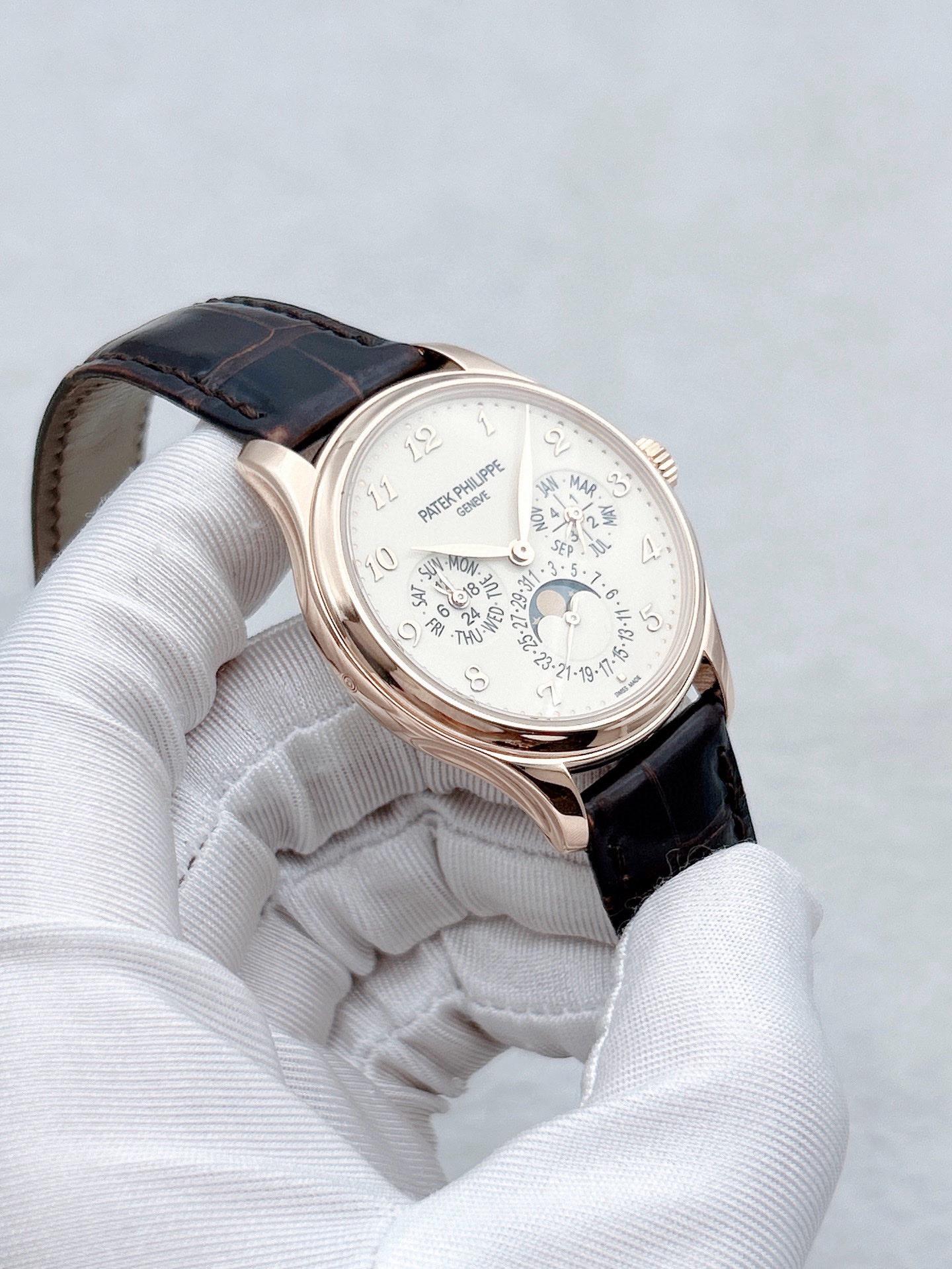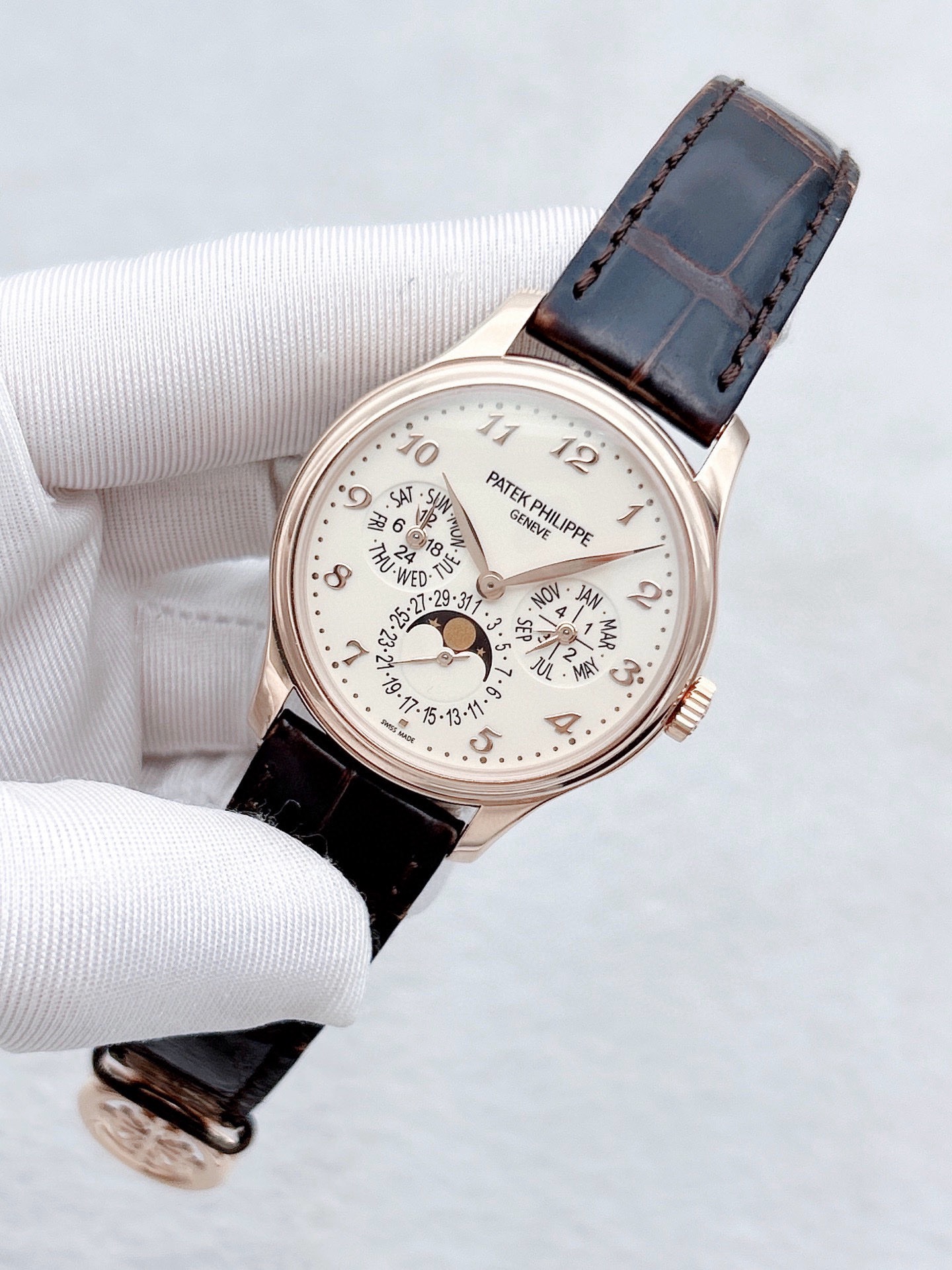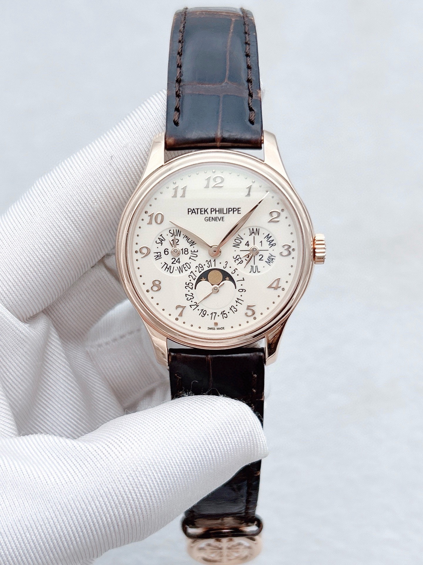 百达翡丽超级复杂功能时计系列5327R-001玫瑰金白盘表径39mm 背透万年历 日期/星期显示 月份显示 月相显示 双时区显示
