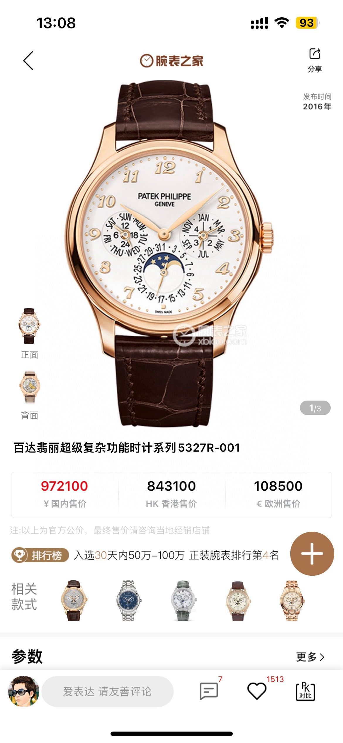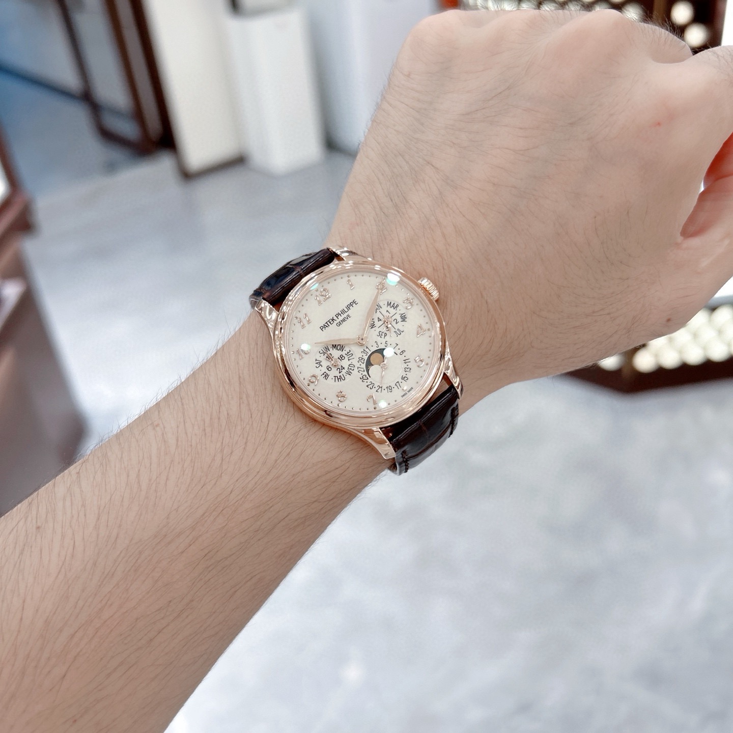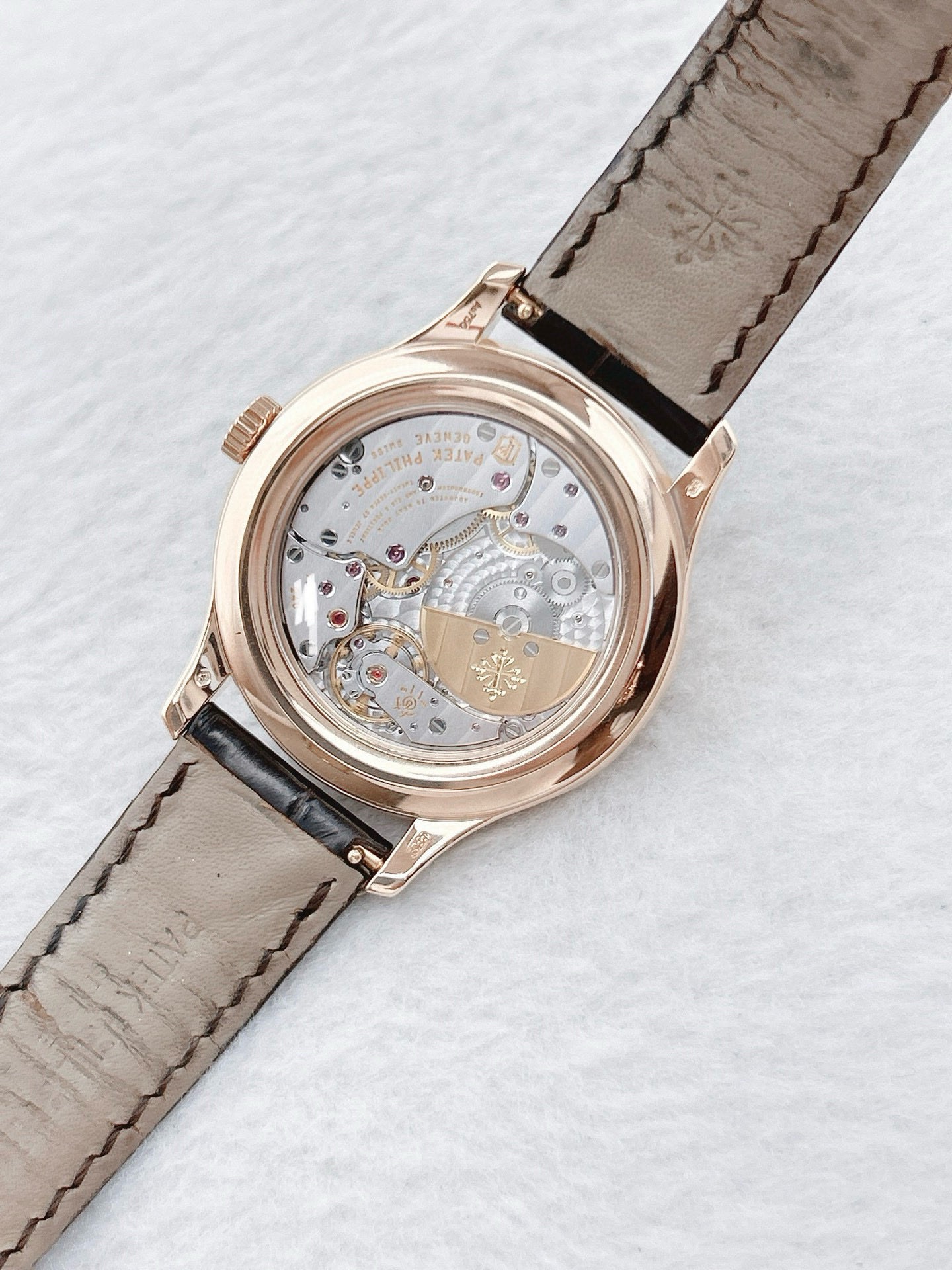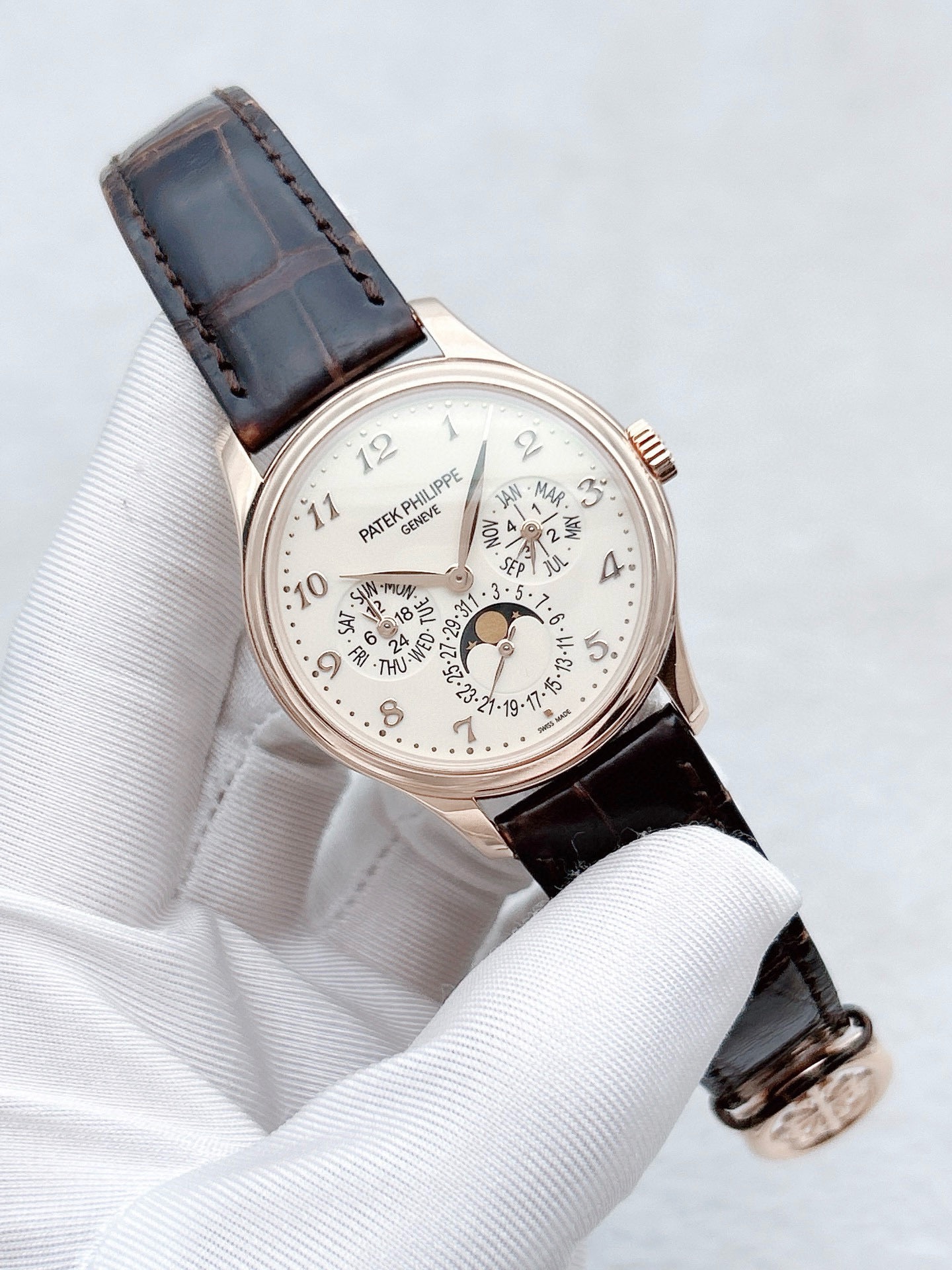 百达翡丽超级复杂功能时计系列5327R-001玫瑰金白盘表径39mm 背透万年历 日期/星期显示 月份显示 月相显示 双时区显示