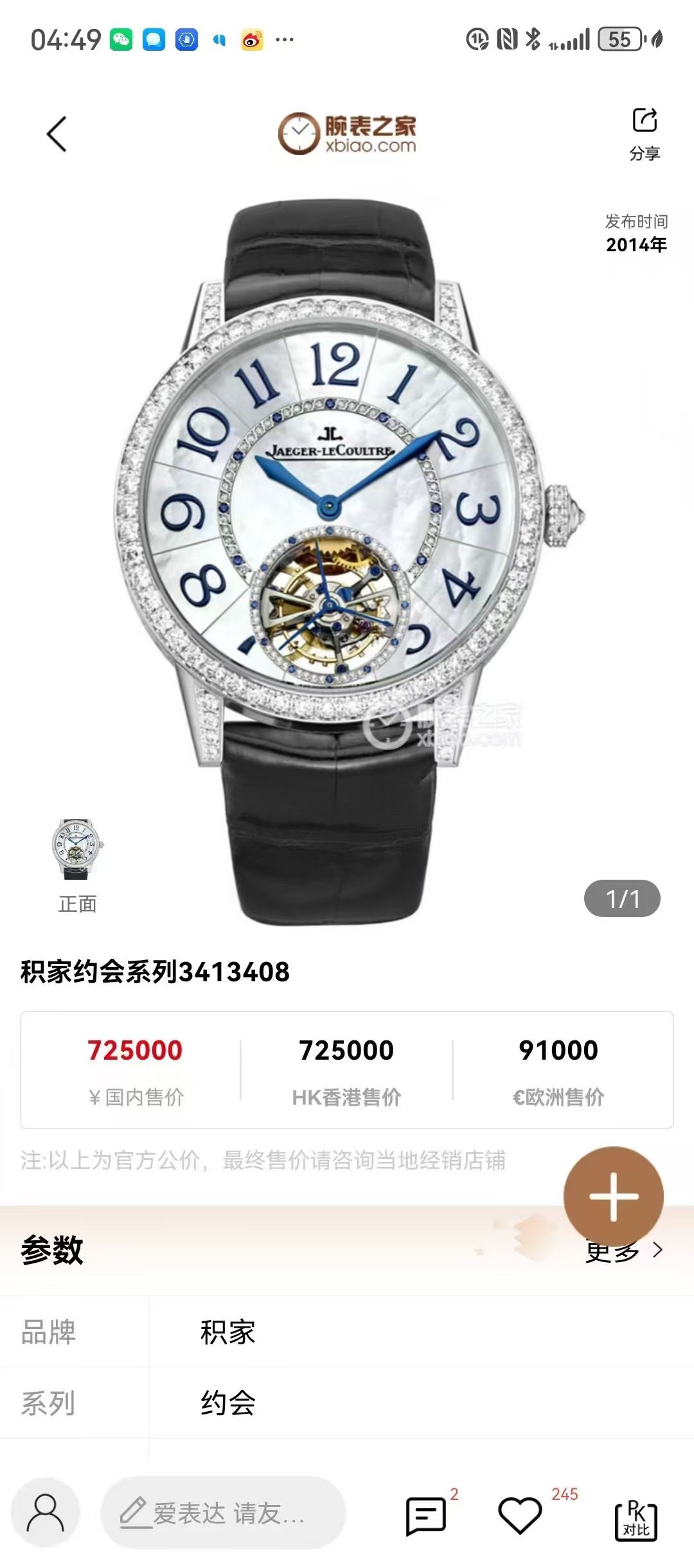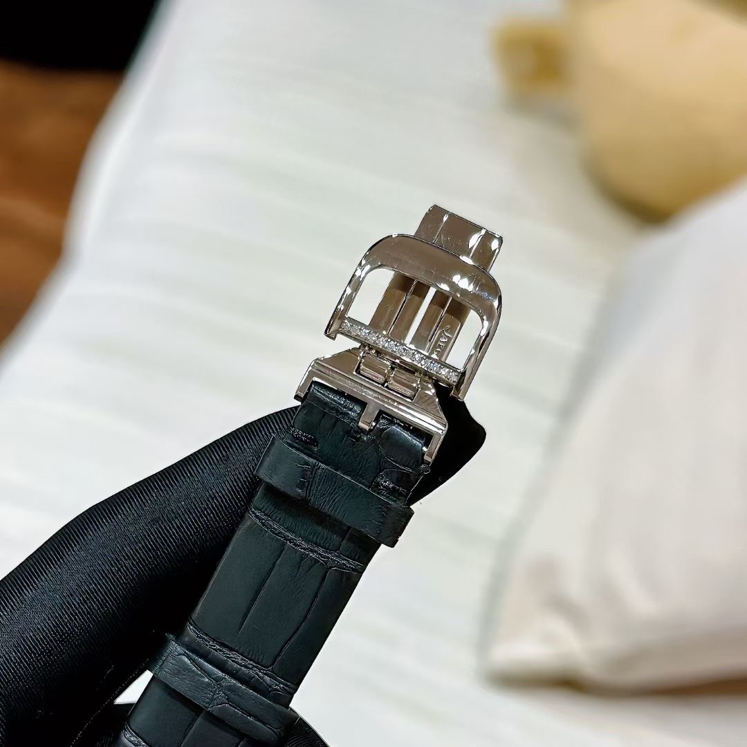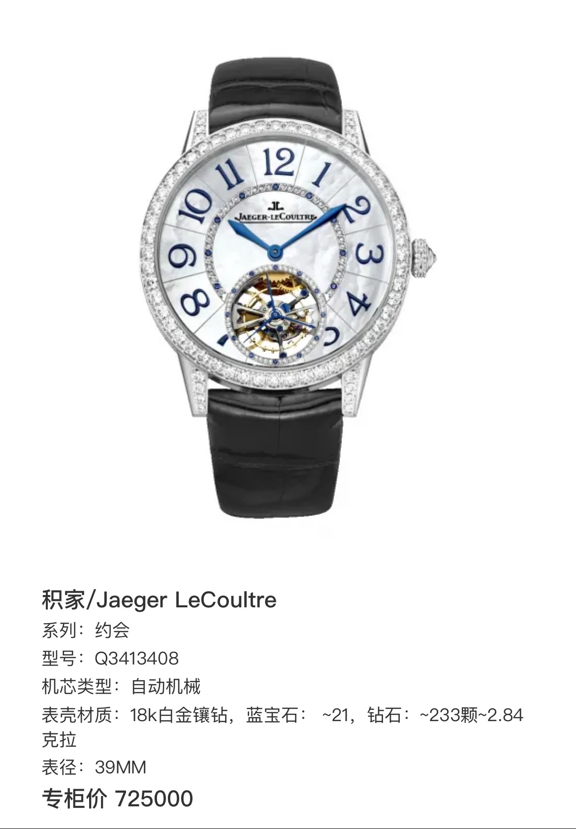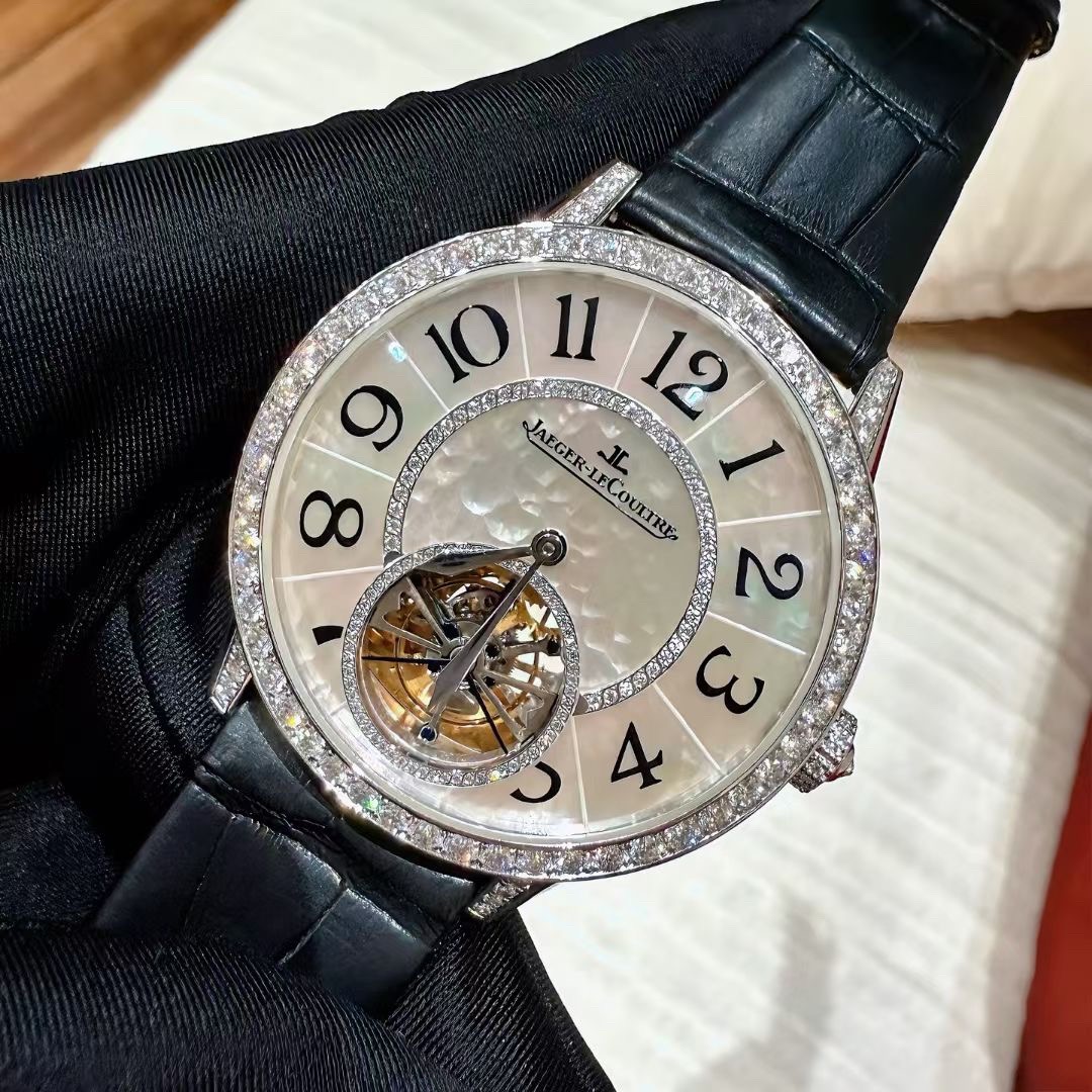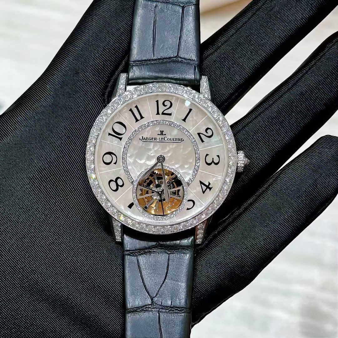 39毫米口径18k白金表壳材质 陀飞轮功能 外圈原镶钻贝母表盘 蓝色阿拉伯数字刻度