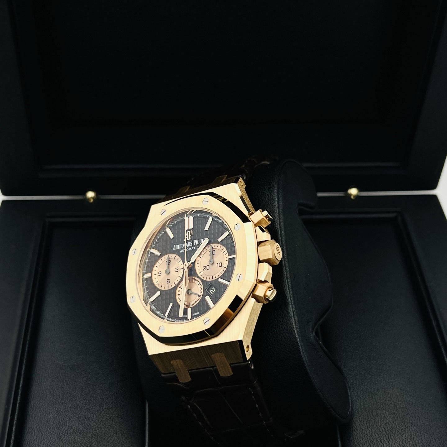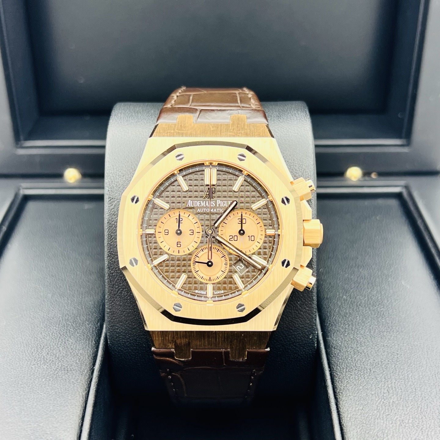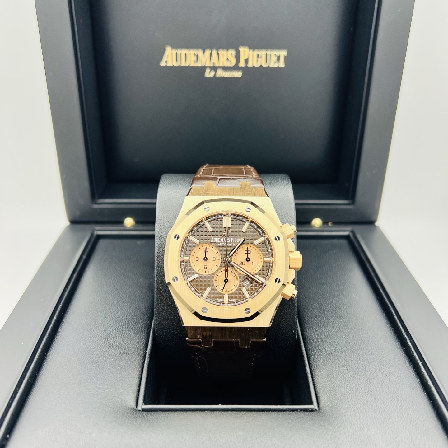 爱彼 皇家橡树系列26331OR 表径41毫米 18K玫瑰金材质 少见咖色大型格纹表盘 折叠扣 日期显示 三眼计时功能 2021年全套库存未使用