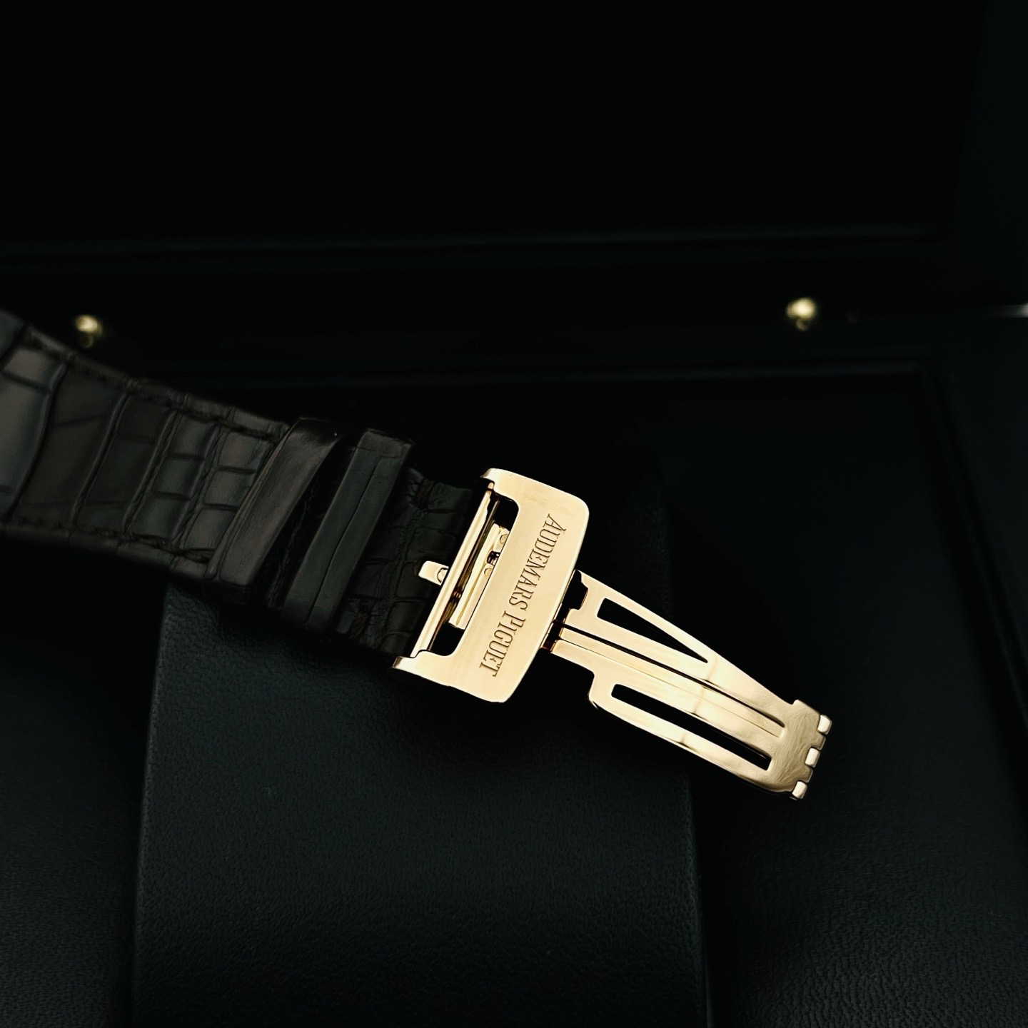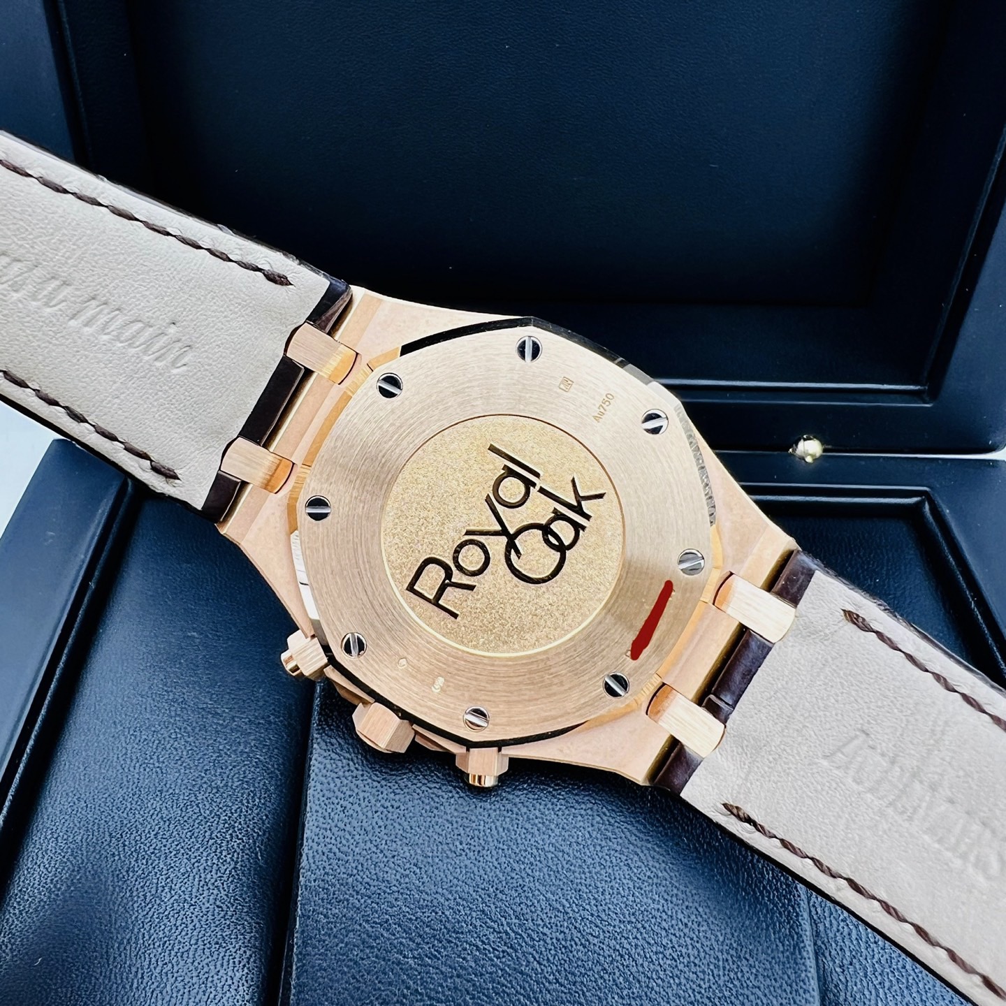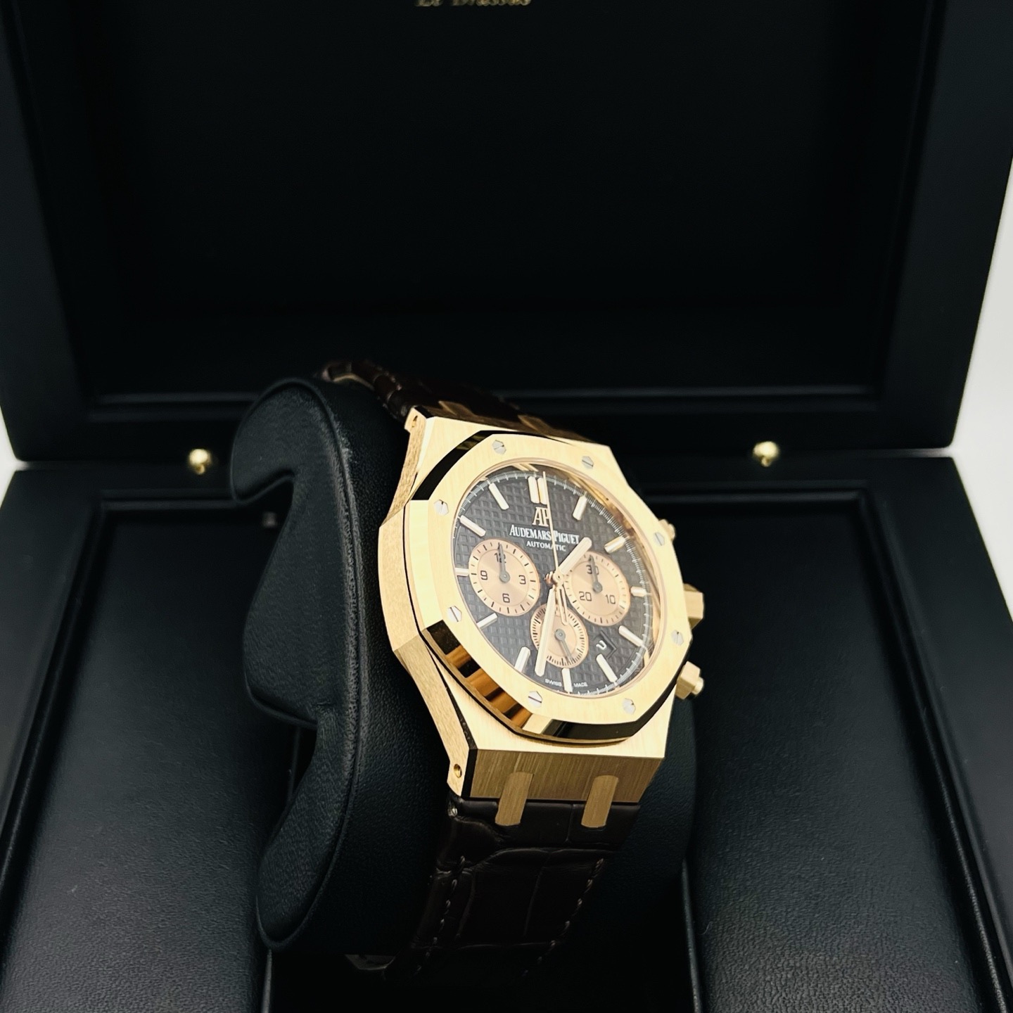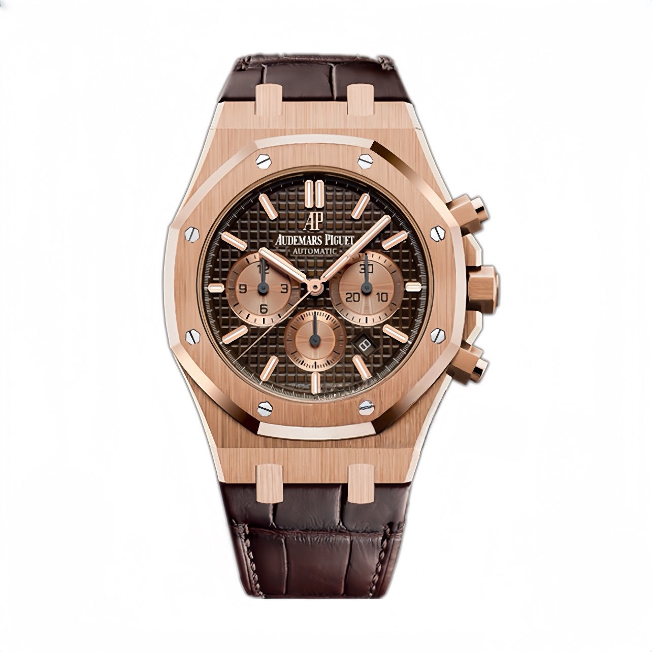 爱彼 皇家橡树系列26331OR 表径41毫米 18K玫瑰金材质 少见咖色大型格纹表盘 折叠扣 日期显示 三眼计时功能 2021年全套库存未使用