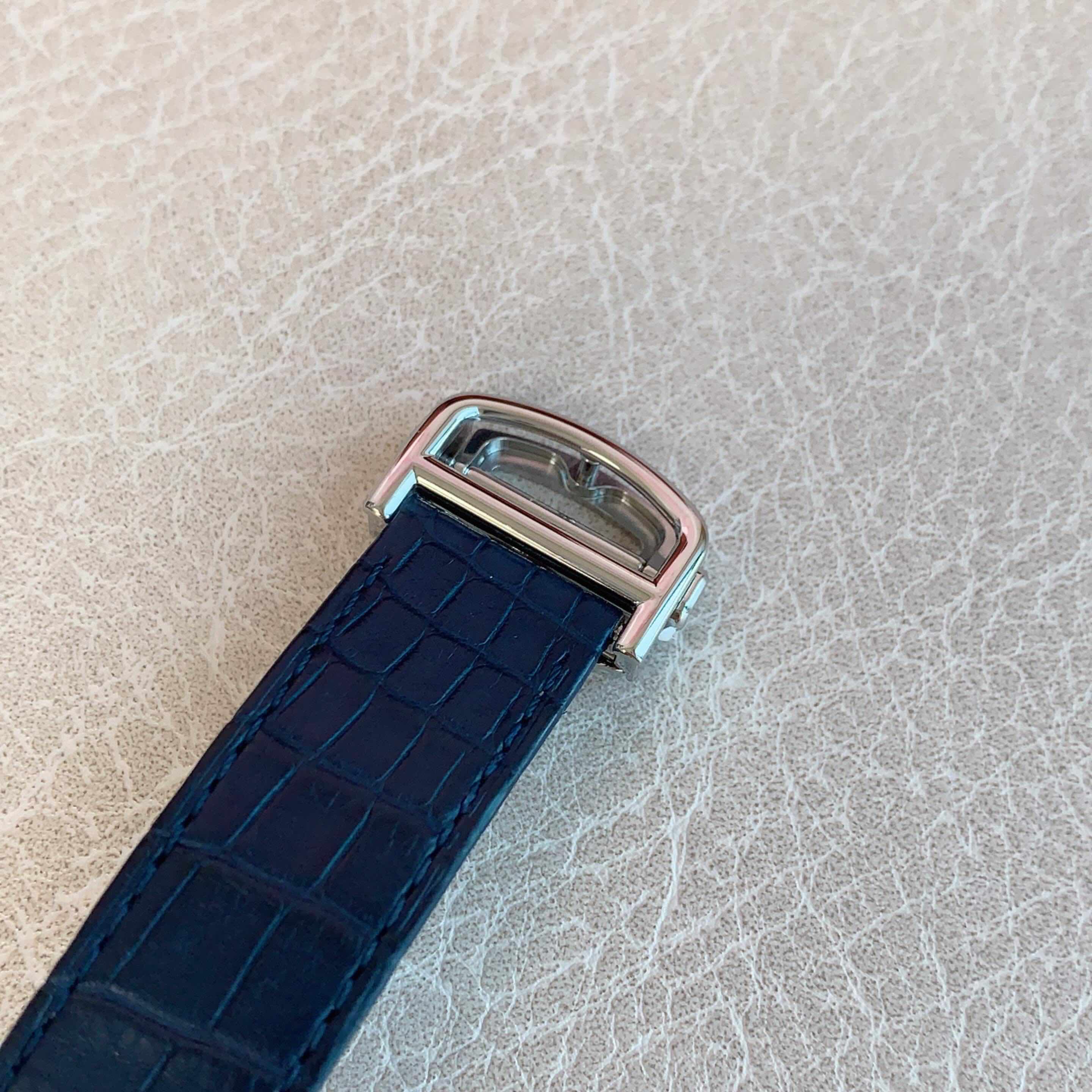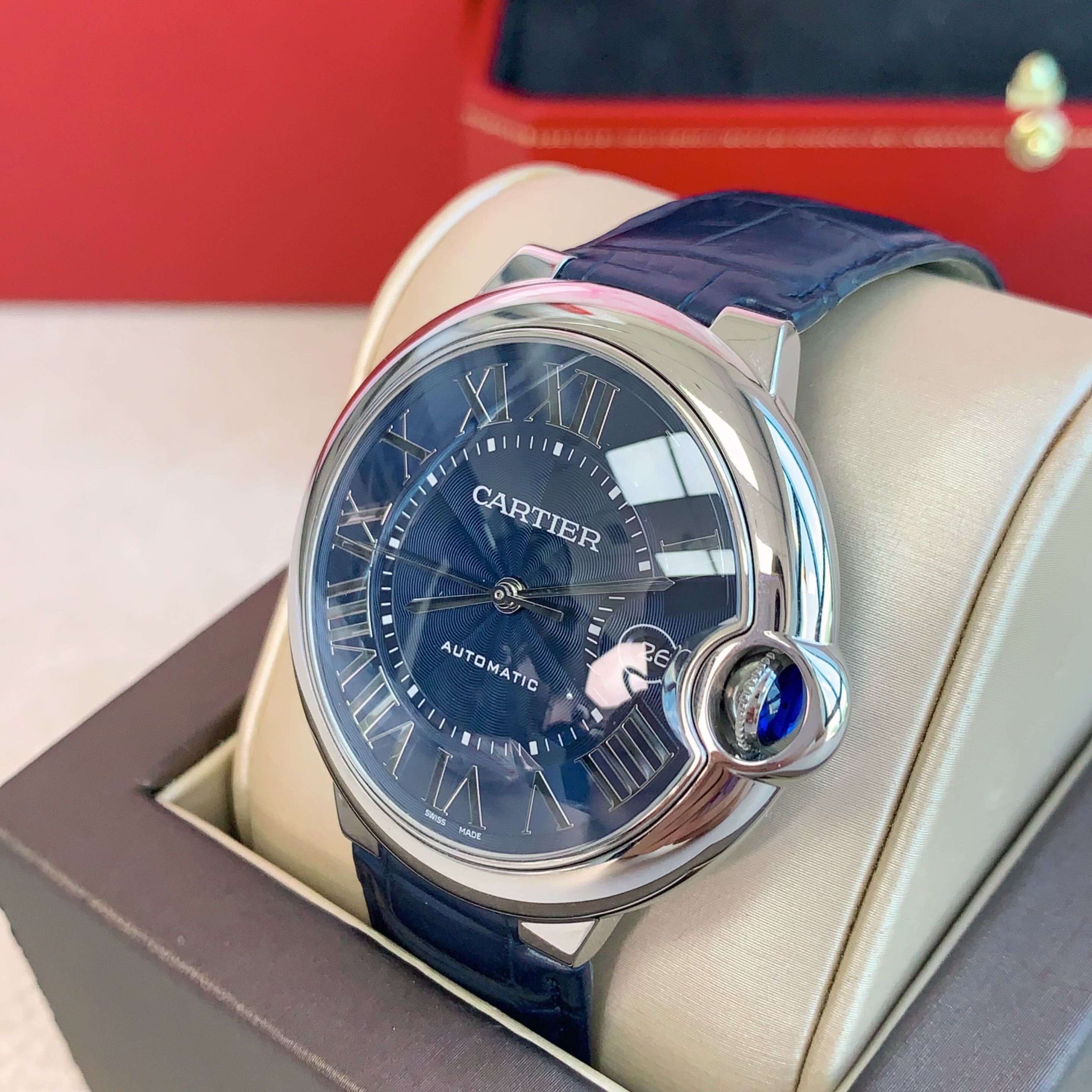 全套卡地亚蓝气球WSBB0027,1847MC自动机械机芯,表径:42mm,表壳厚度:13mm,精钢表壳,凹槽式表冠镶嵌一颗凸圆形合成尖晶石,蓝色扭索雕纹表盘。剑形指针,蓝宝石水晶镜面,蓝色鳄鱼皮表带,可替换式精钢折叠表扣。3时位置设日历显示窗。 柜柜价55000。