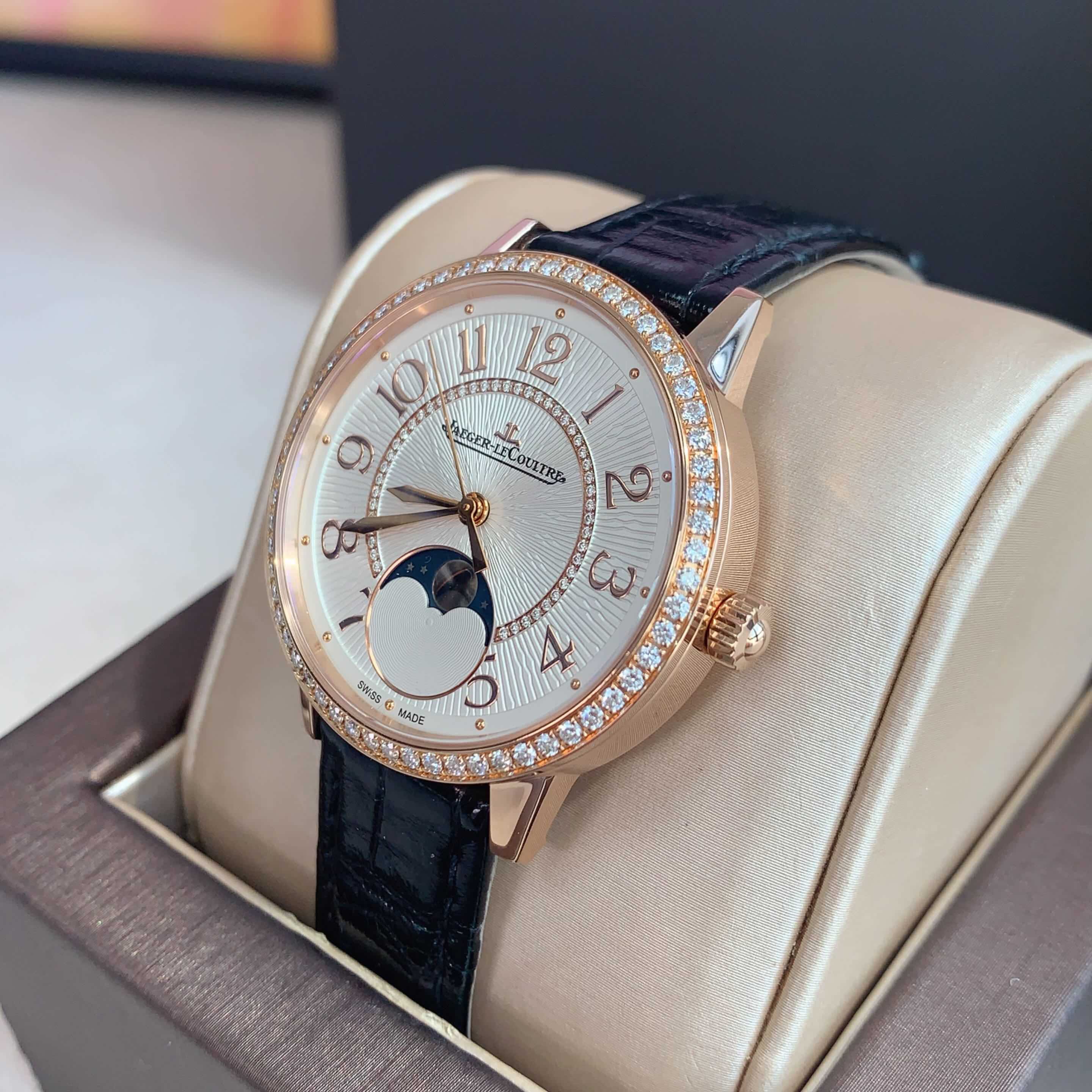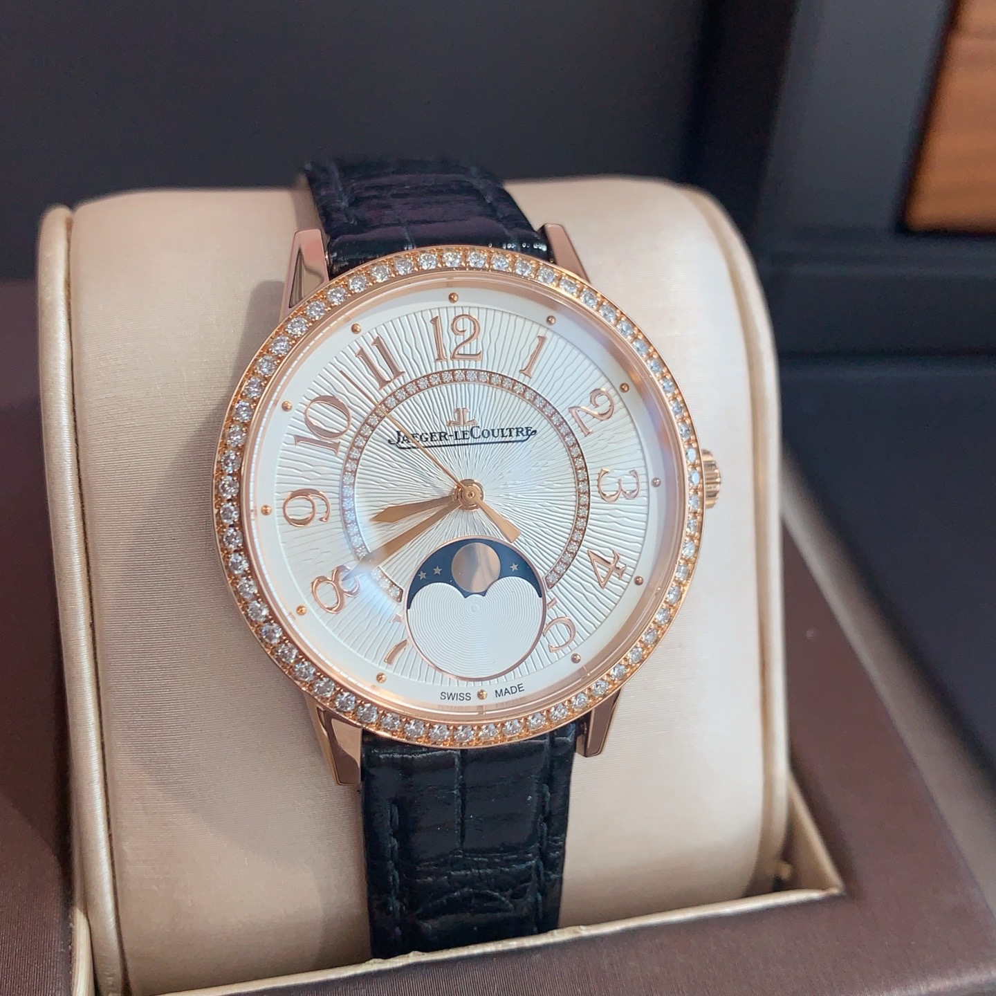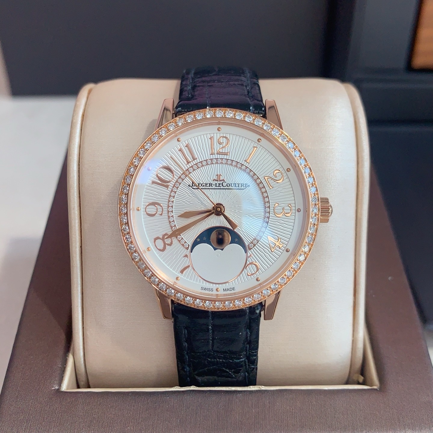 全套积家约会系列3572430,自动机械机芯:925A/1,表径:34mm,表壳厚度:9.56mm,玫瑰金表壳,扭索饰纹表盘,内表盘和谐对称的点缀了47颗美钻,玫瑰金表圈,镶嵌60颗明亮式切割钻石,鳄鱼皮表带,柜柜价220000。