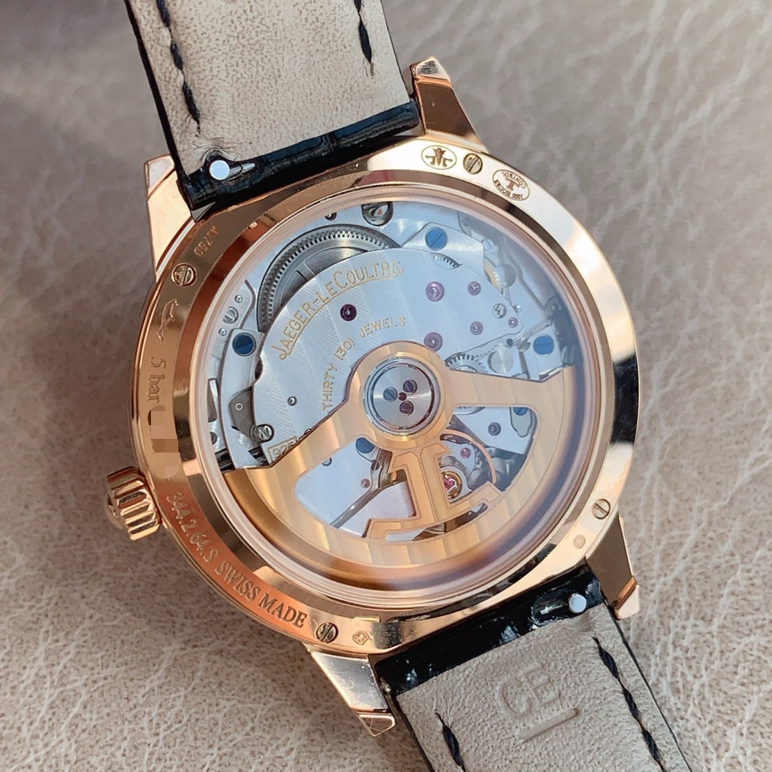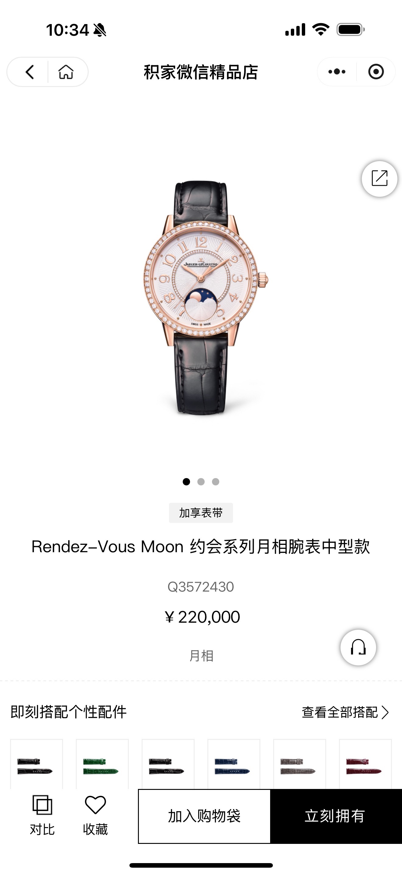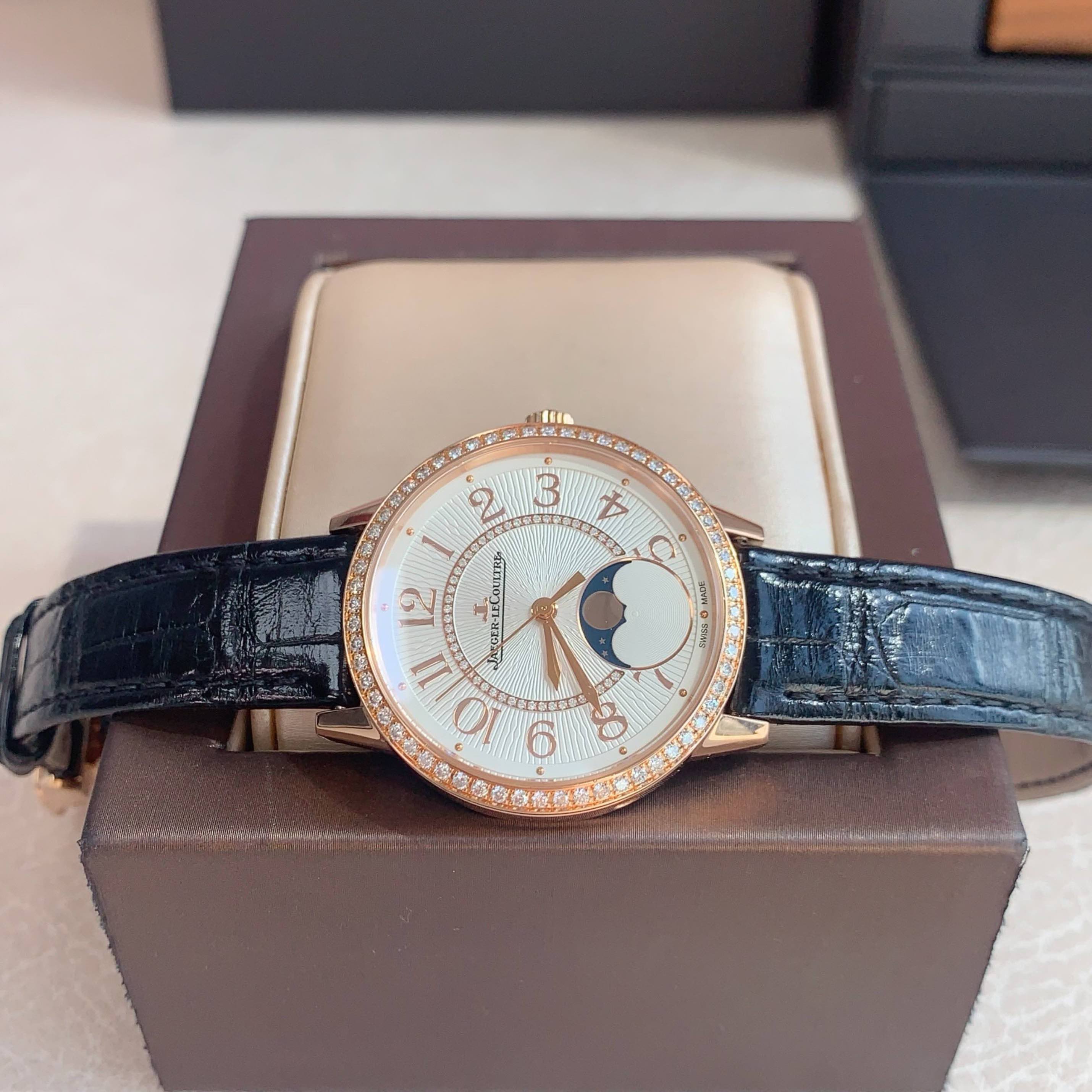 全套积家约会系列3572430,自动机械机芯:925A/1,表径:34mm,表壳厚度:9.56mm,玫瑰金表壳,扭索饰纹表盘,内表盘和谐对称的点缀了47颗美钻,玫瑰金表圈,镶嵌60颗明亮式切割钻石,鳄鱼皮表带,柜柜价220000。
