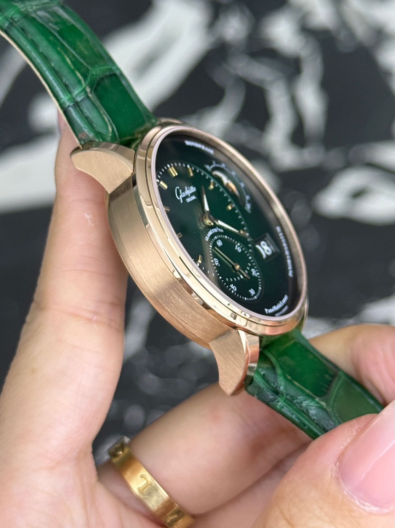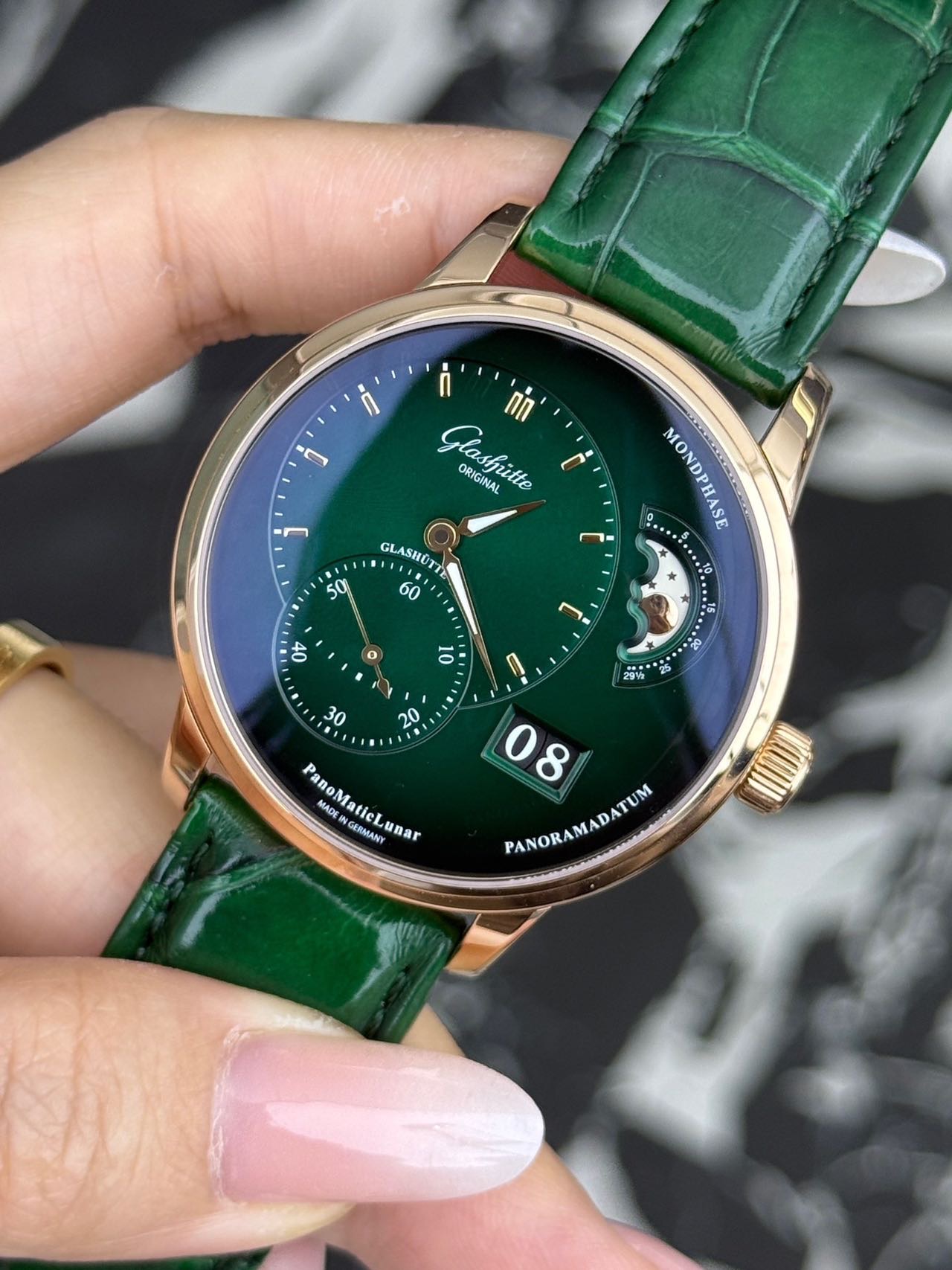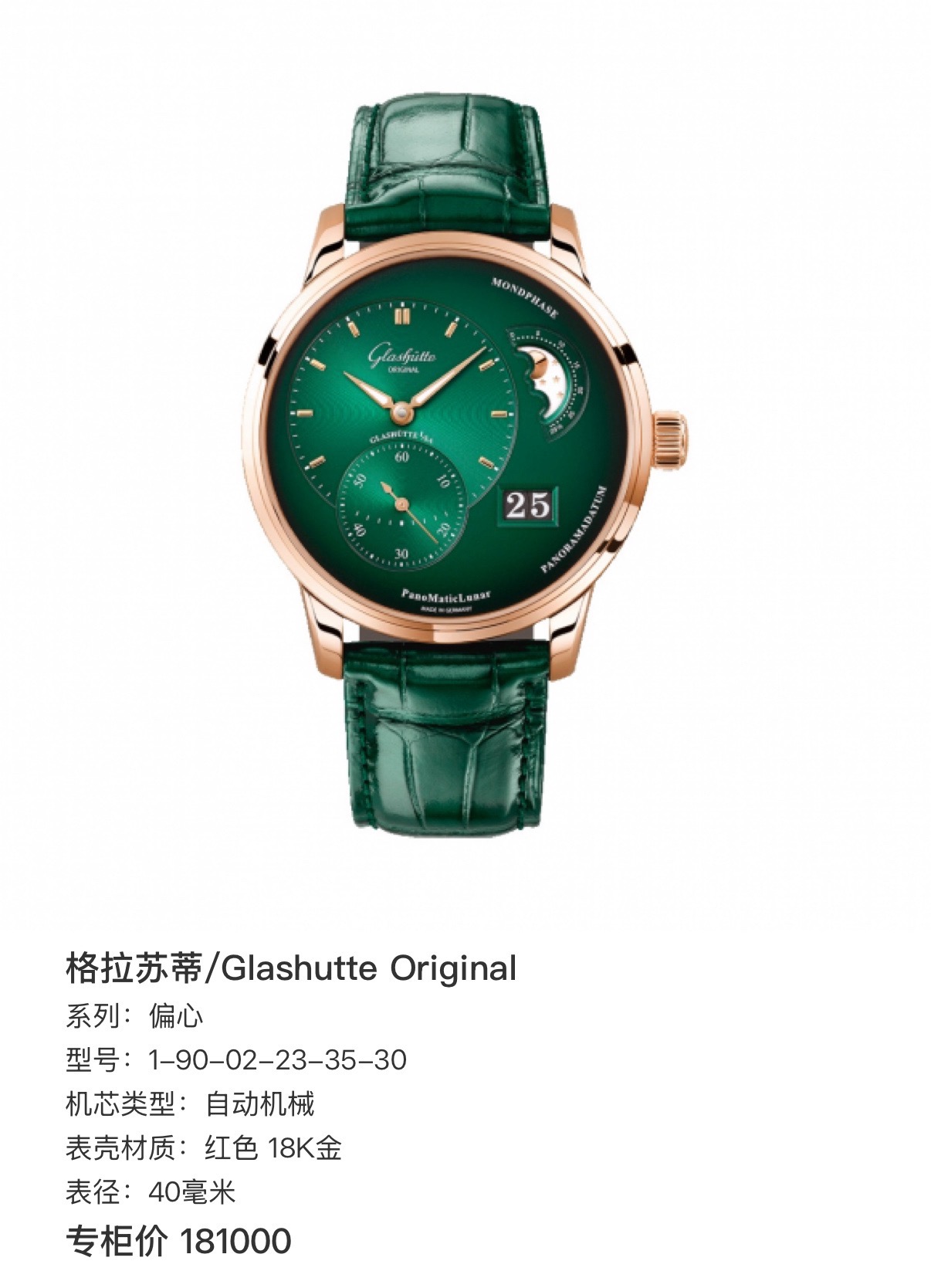 24年全套 格拉苏蒂原创偏心系列 1-90-02-23-35-30 稀缺新款玫瑰金绿盘偏心月相,整表由18K玫瑰金材质打造优雅大气,新款橄榄绿表盘,3/4区域时间显示,玫瑰金刻度指针,夜光指示,独立小秒针,偏心大月相,大日历显示,搭载背透自产90-02双鹅颈微调自动上链机芯,纯金折叠扣!