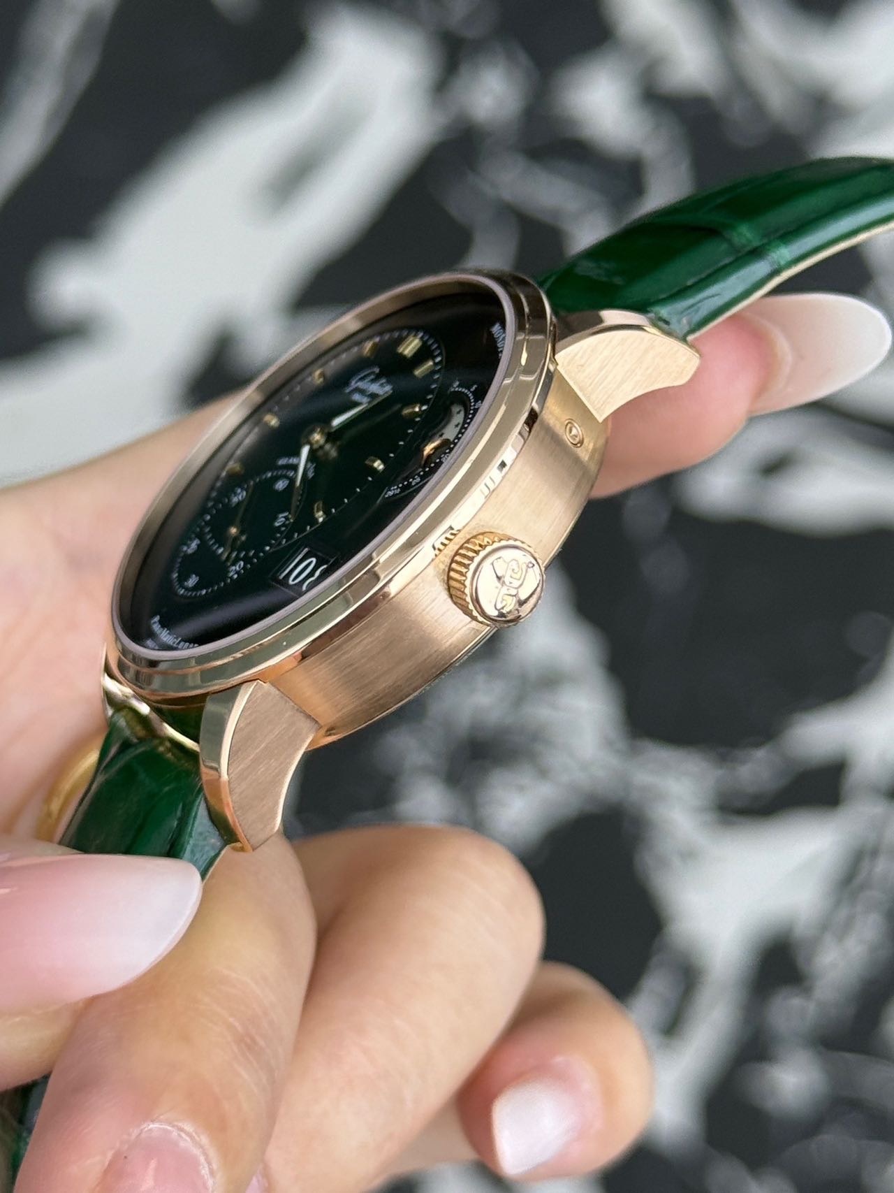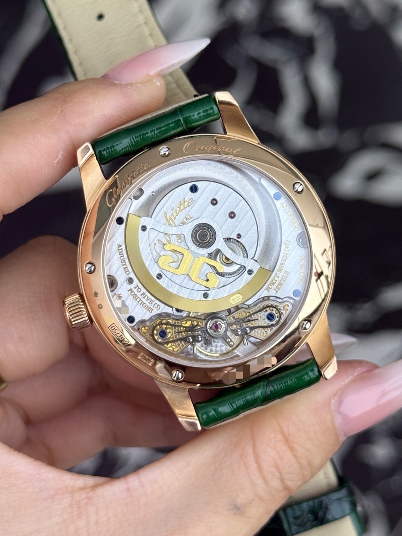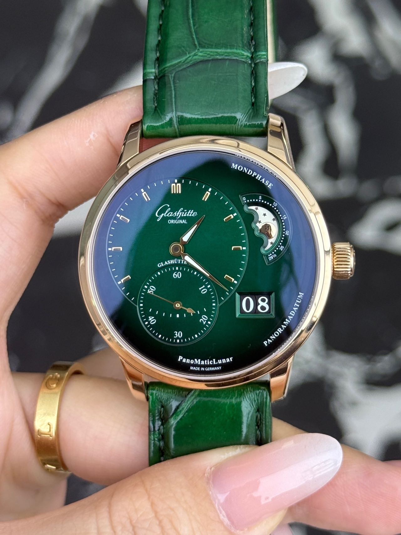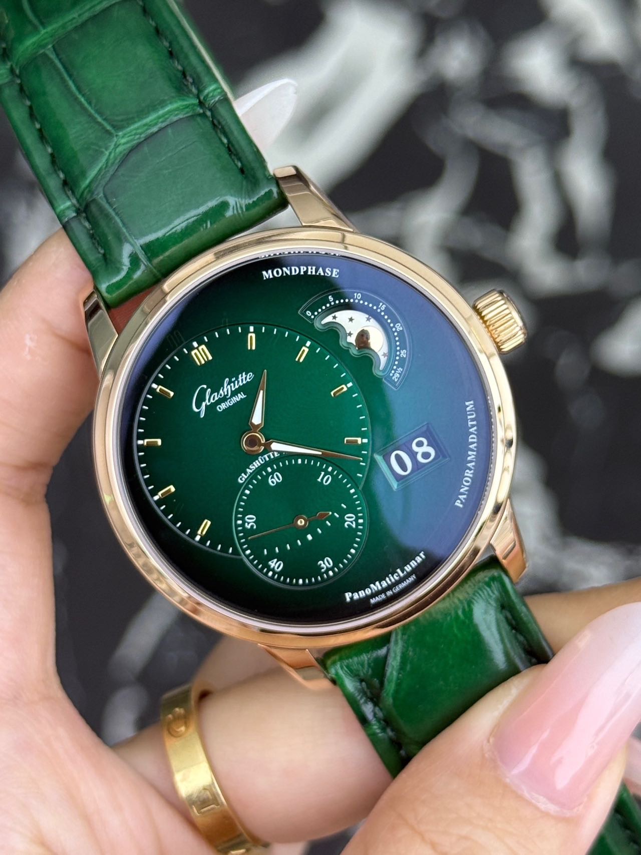24年全套 格拉苏蒂原创偏心系列 1-90-02-23-35-30 稀缺新款玫瑰金绿盘偏心月相,整表由18K玫瑰金材质打造优雅大气,新款橄榄绿表盘,3/4区域时间显示,玫瑰金刻度指针,夜光指示,独立小秒针,偏心大月相,大日历显示,搭载背透自产90-02双鹅颈微调自动上链机芯,纯金折叠扣!