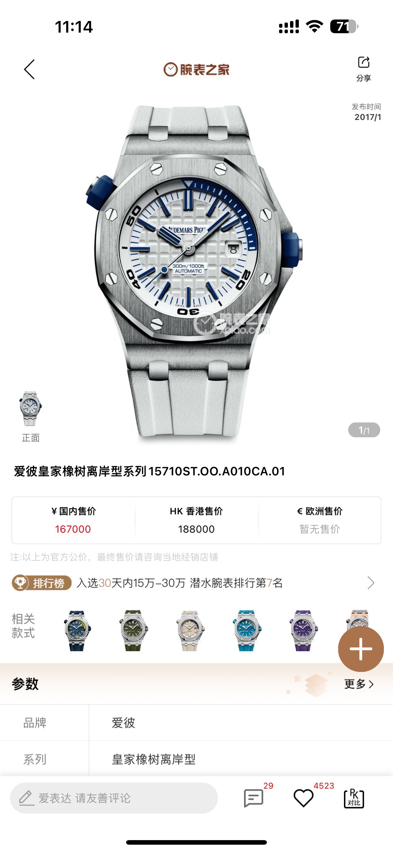 Ap爱彼皇家橡树15710st四分之一蓝自动机械 42表径,背透机芯,300米防水,现货好价11.9w