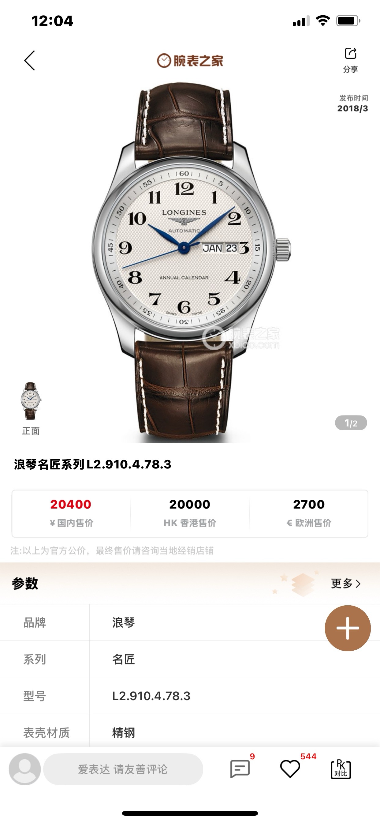 浪琴 “年历显示” 新款镂空机芯 总重80.03克 表带后配