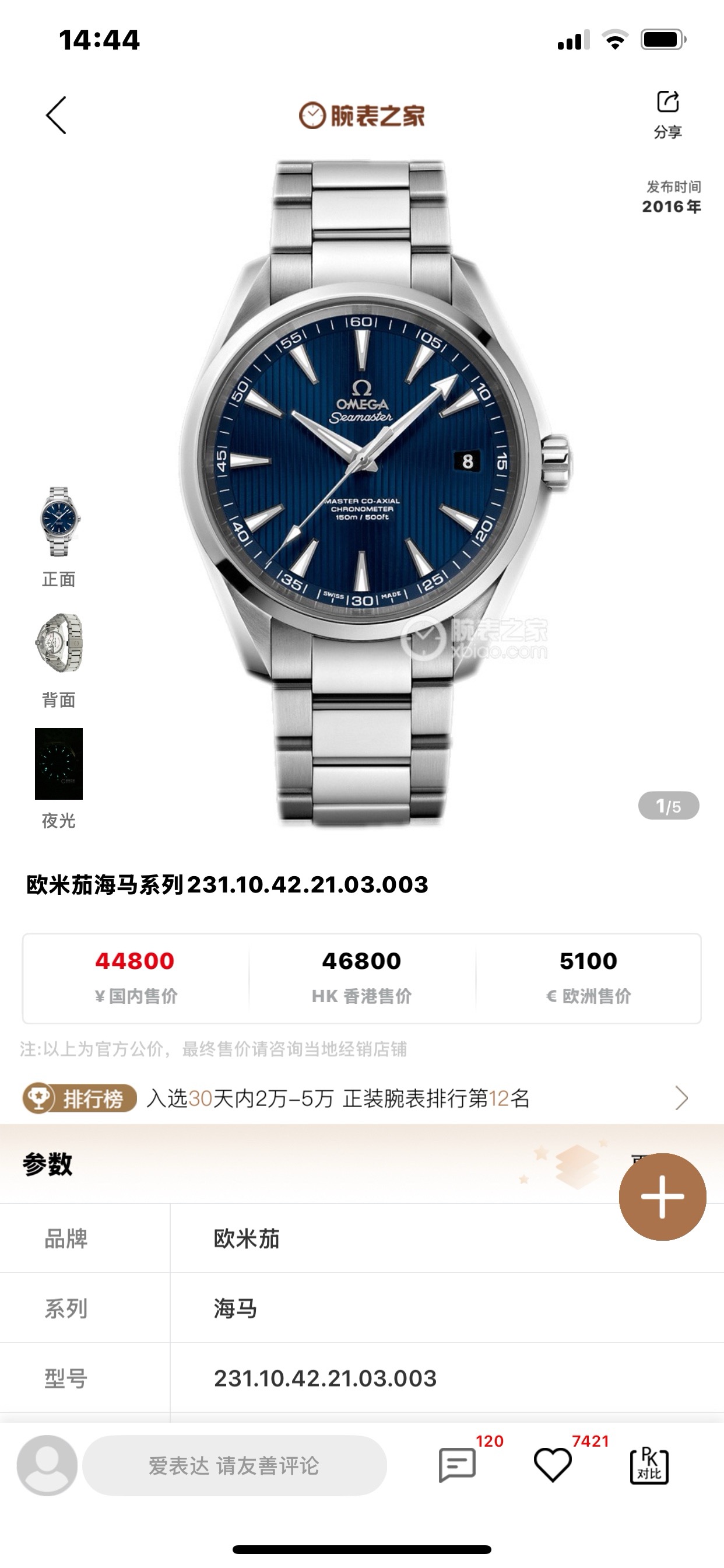 欧米茄海马 海马AT8500蓝盘 231.10.42.21.03.003机械男性