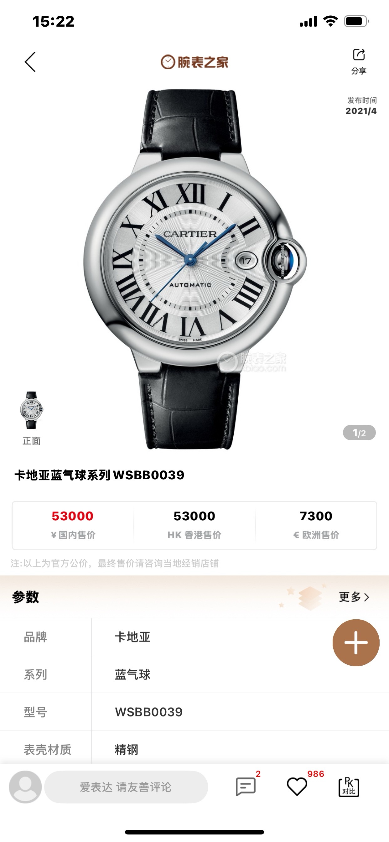 卡地亚蓝气球BALLON BLANCWSBB0039机械男性