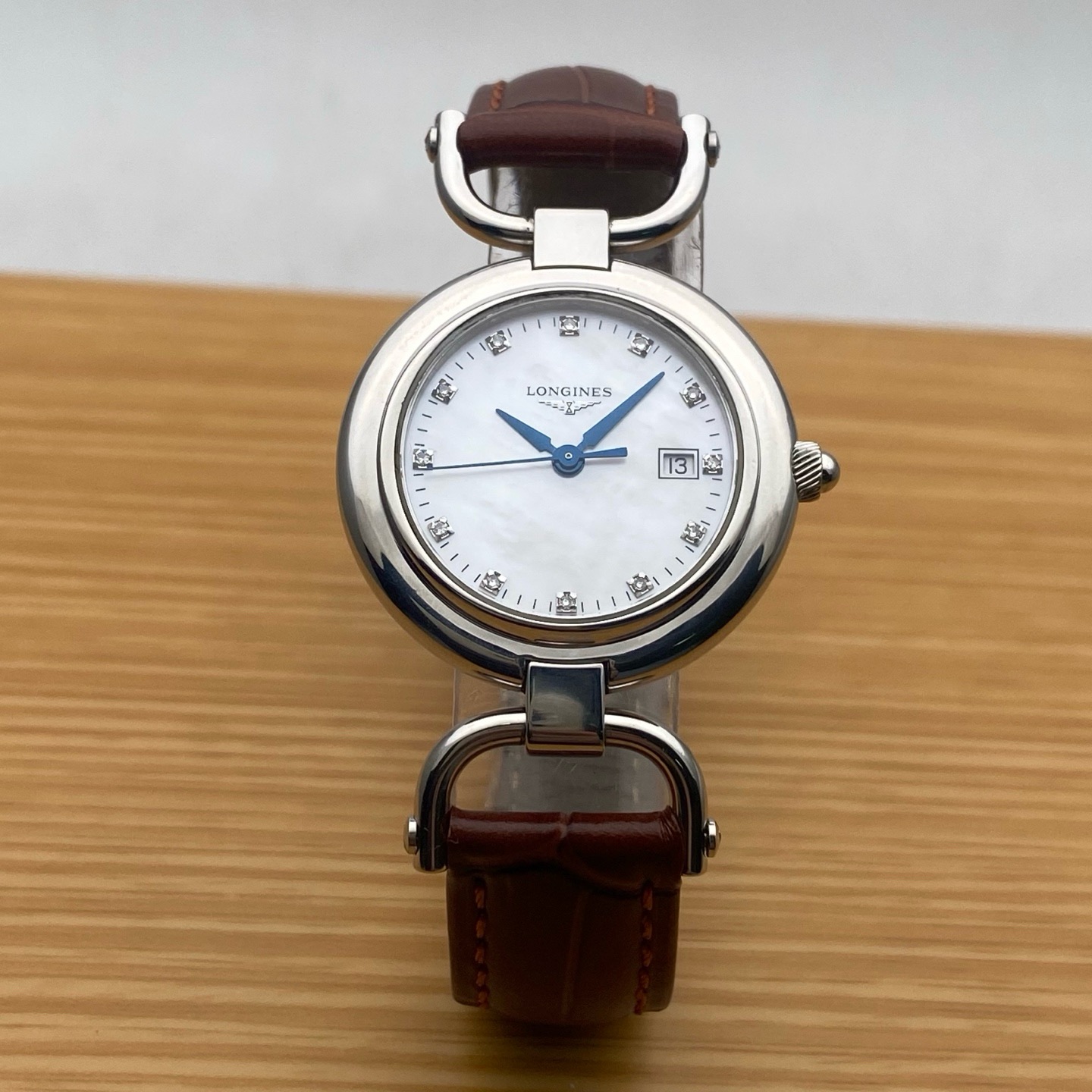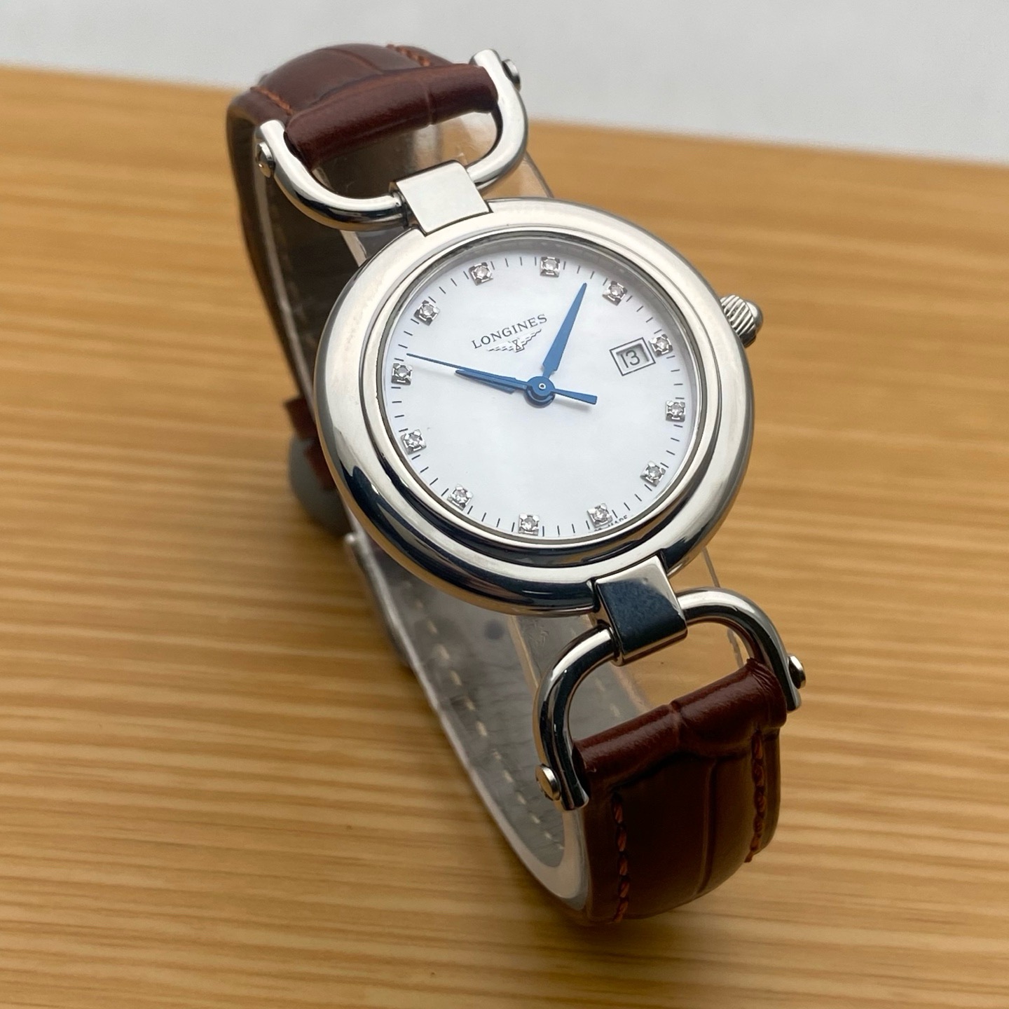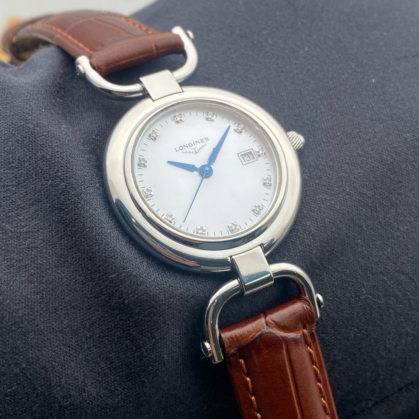 表盘材质:珍珠母贝,钻石时标,蓝钢指针,表盘镶嵌12颗顶级韦塞尔顿VS级钻石,总重0.055克拉。