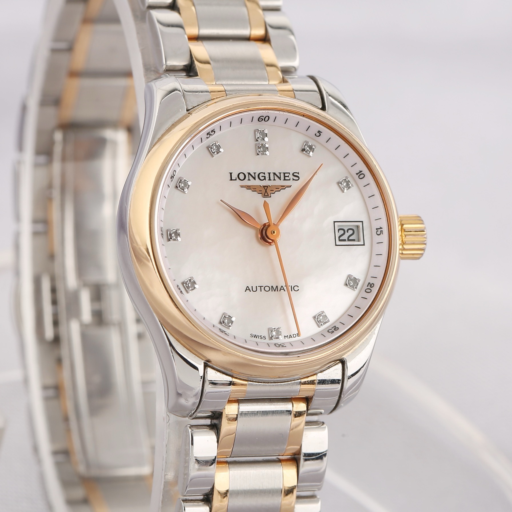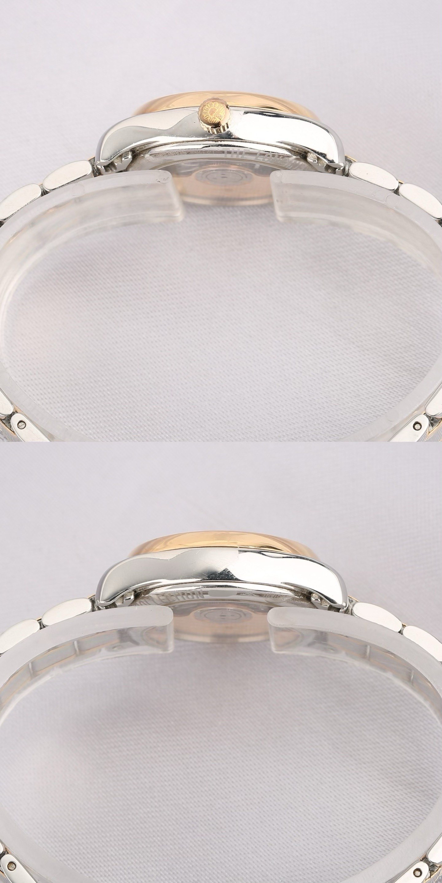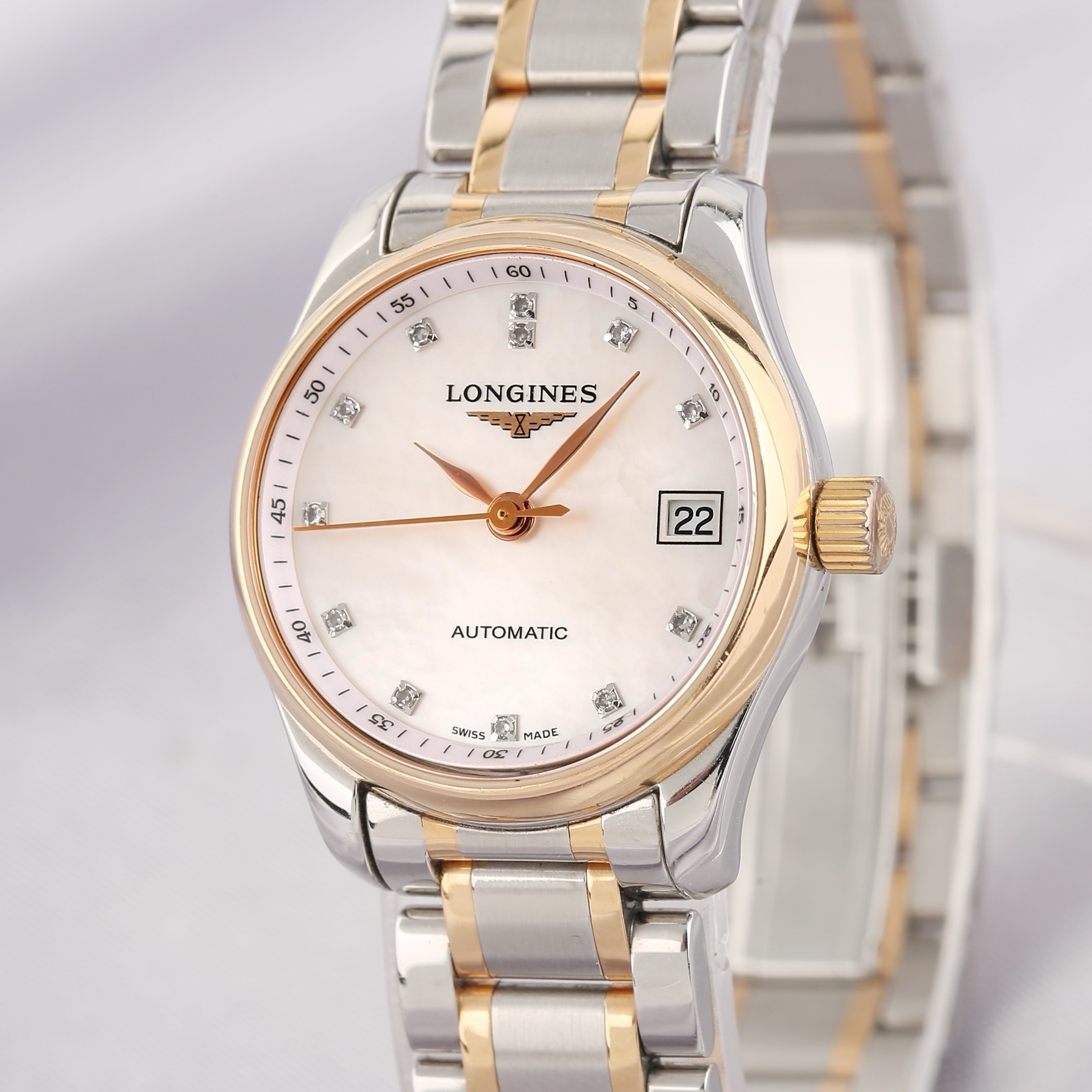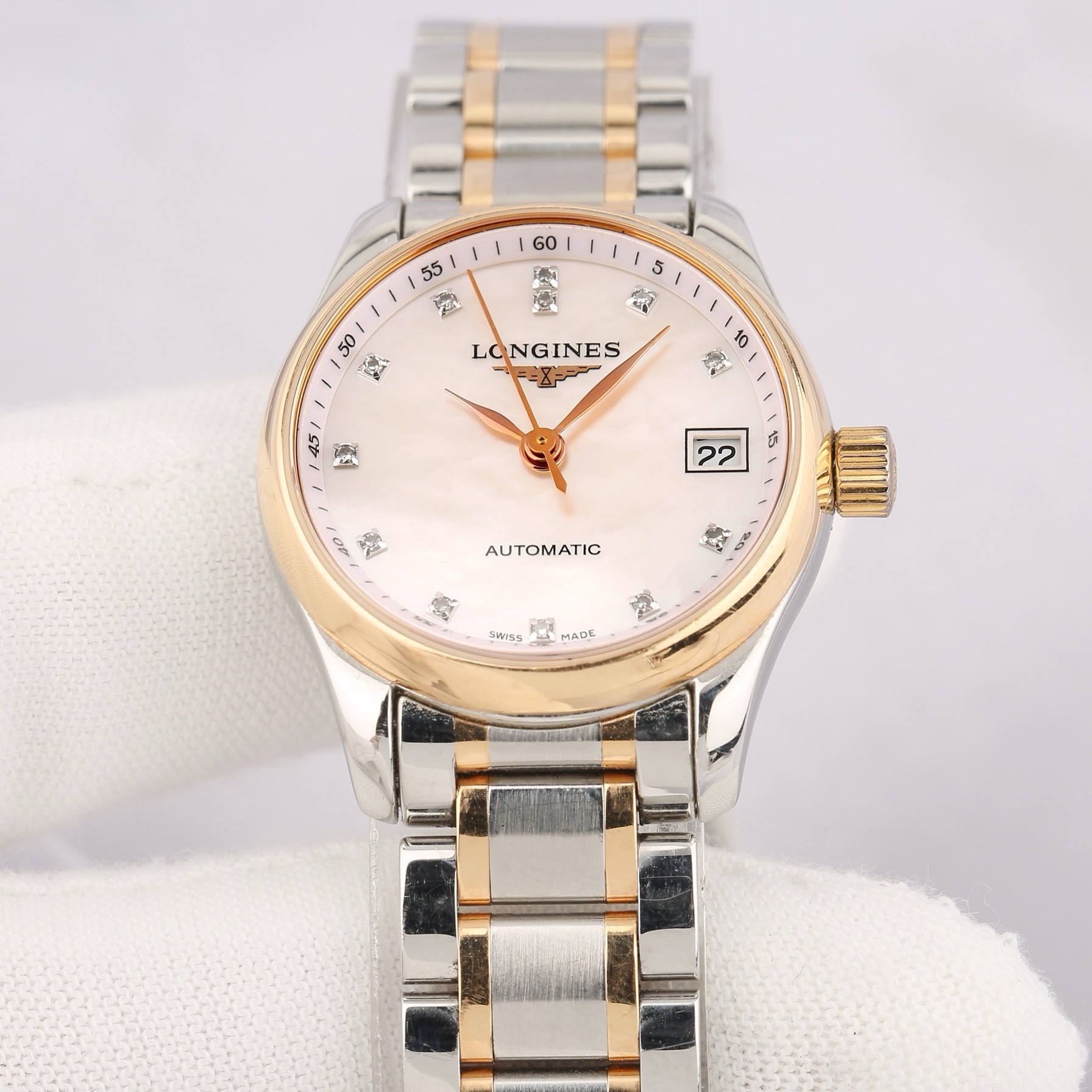 表盘材质:白色珍珠母贝,镶嵌12颗顶级韦塞尔顿VS-SI级钻石,总重0.034克拉;