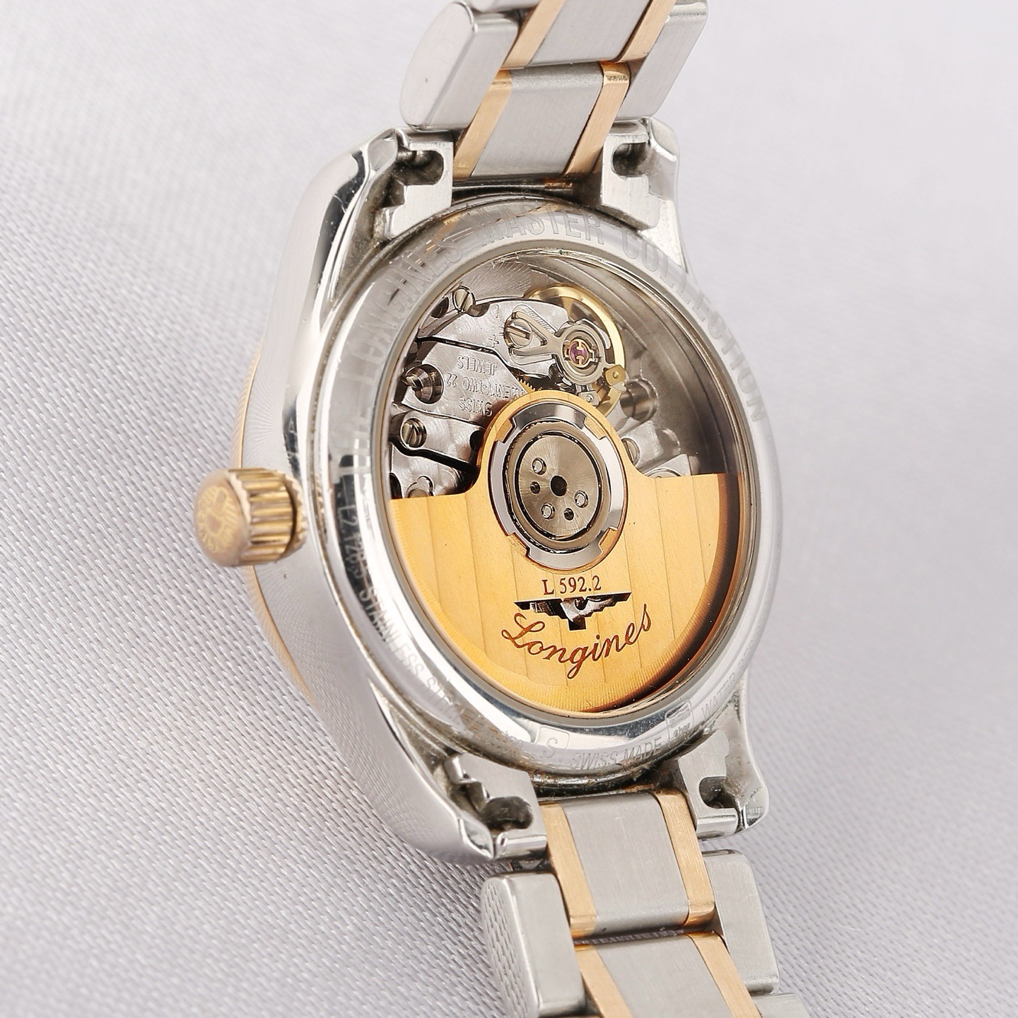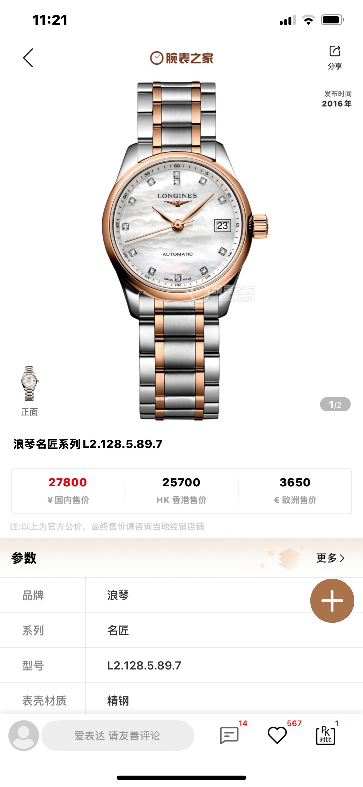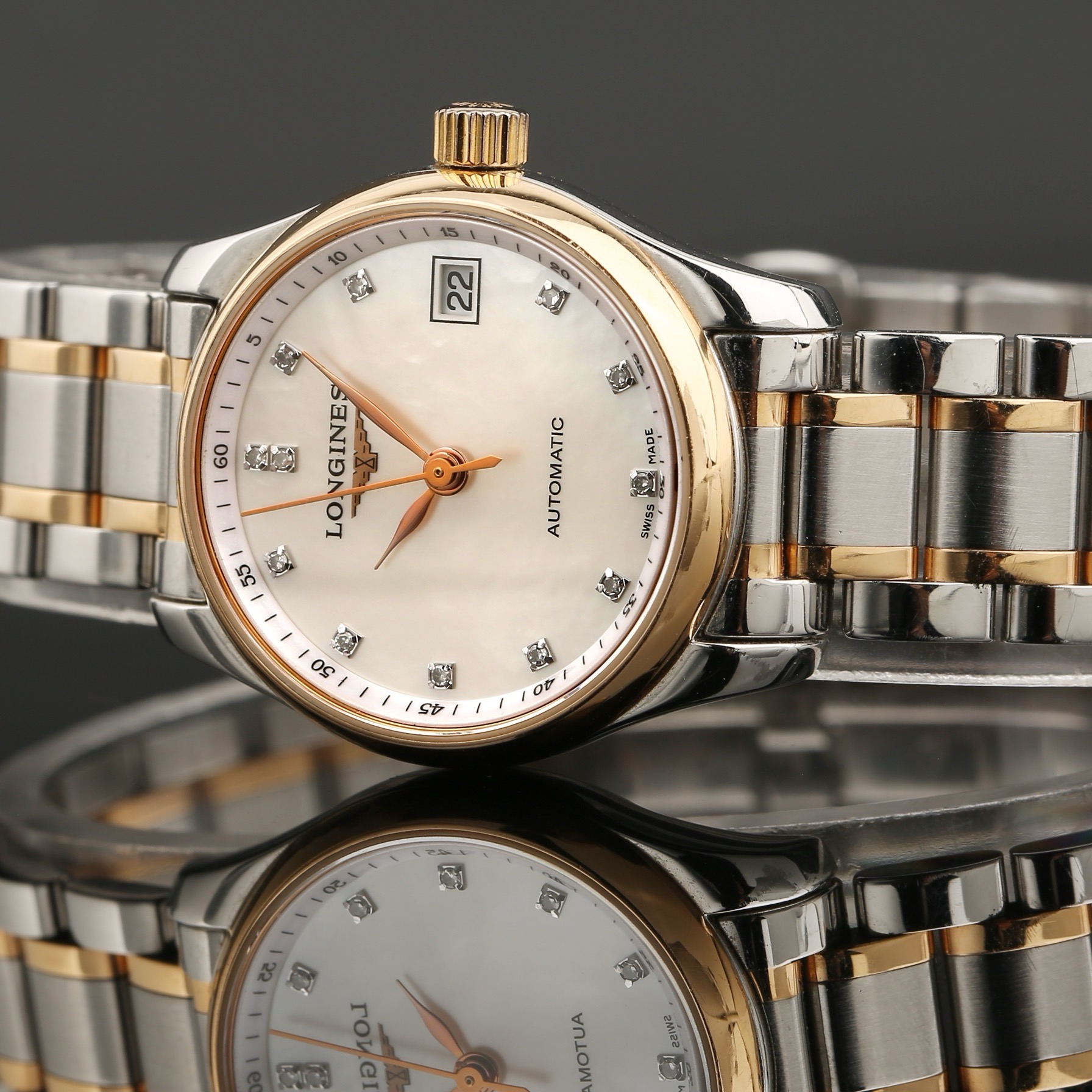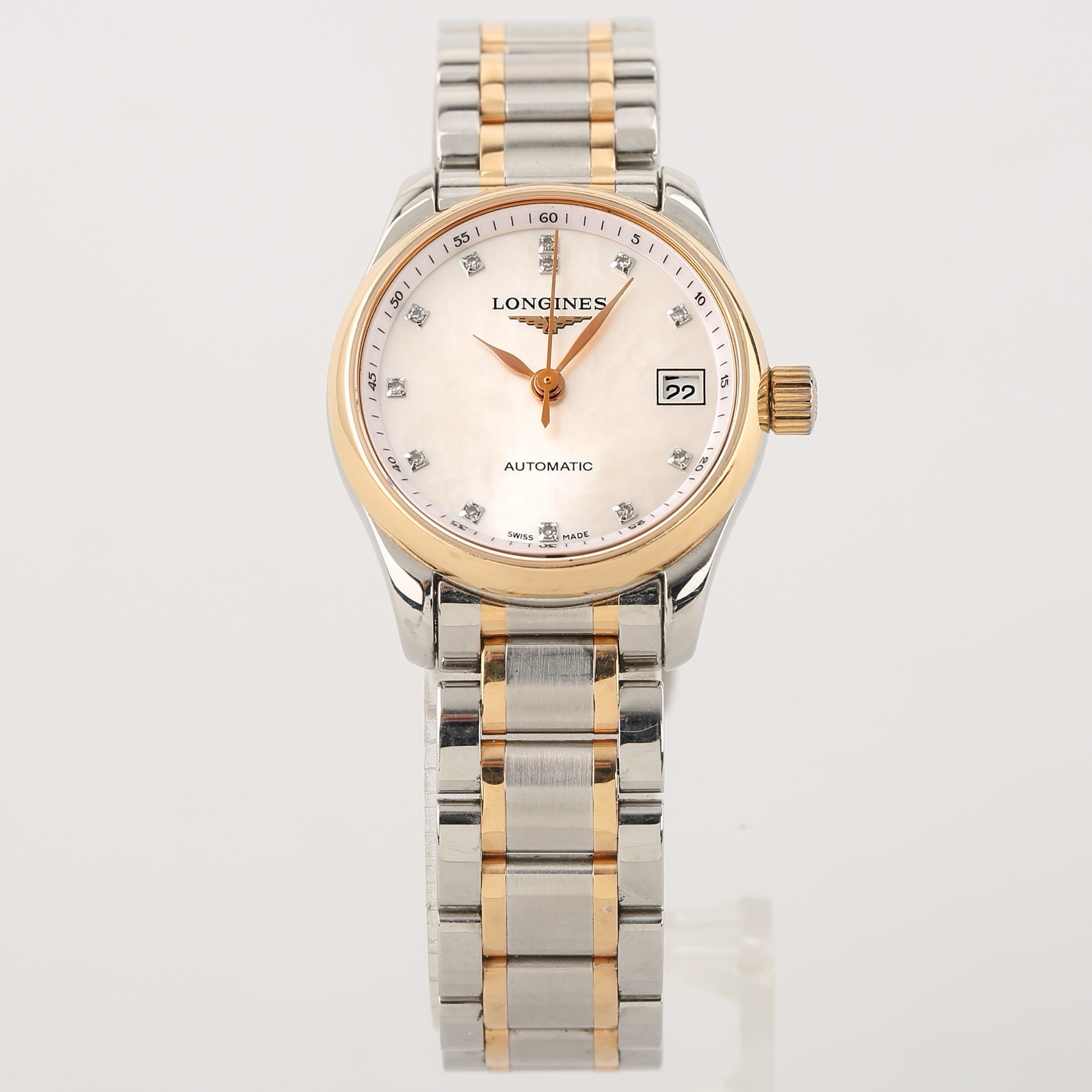 表盘材质:白色珍珠母贝,镶嵌12颗顶级韦塞尔顿VS-SI级钻石,总重0.034克拉;