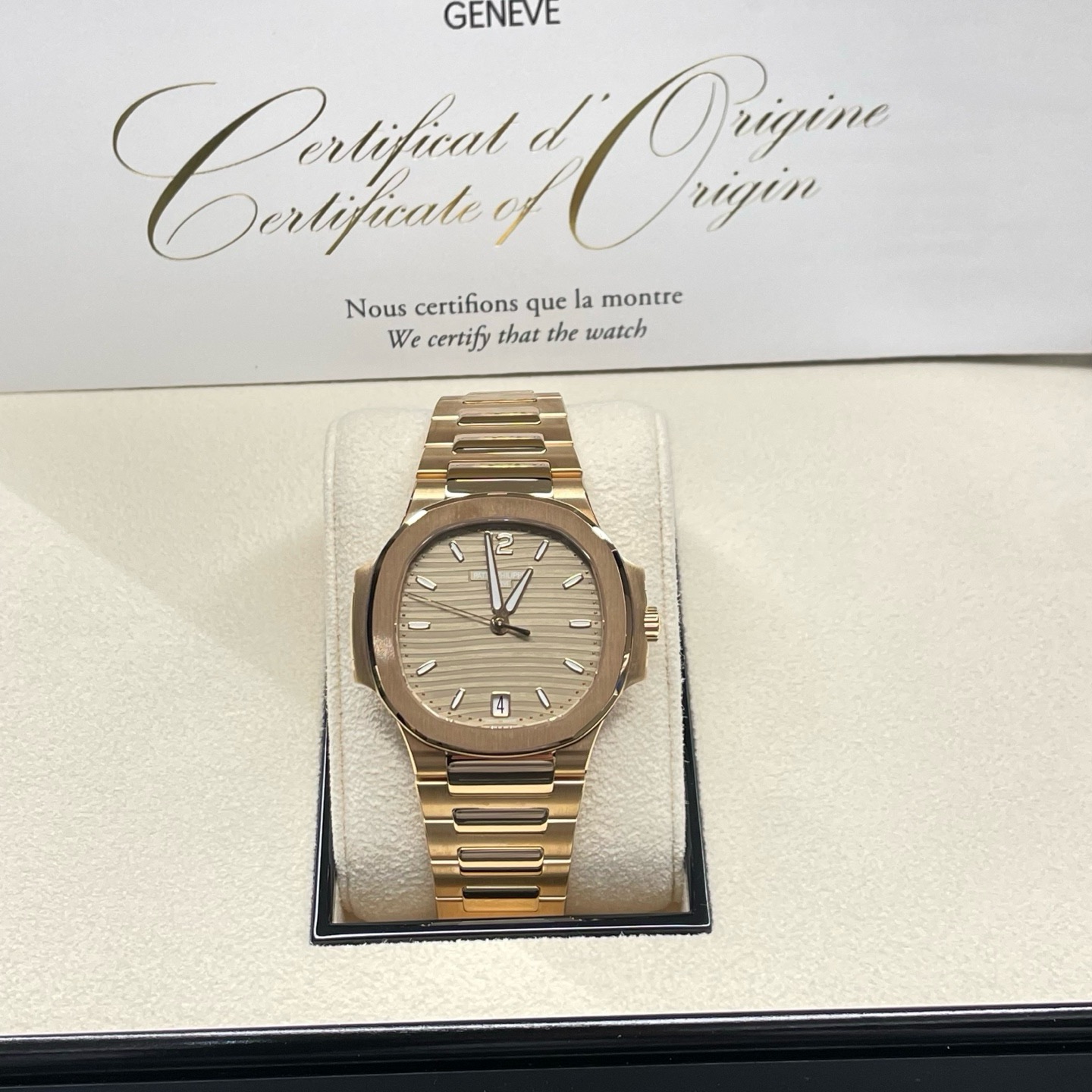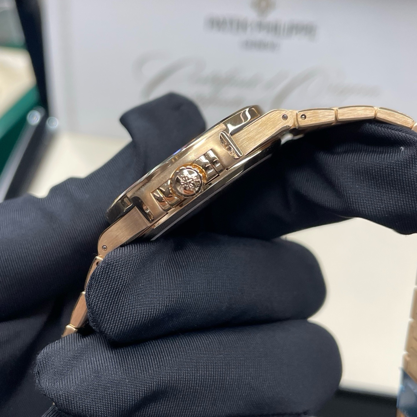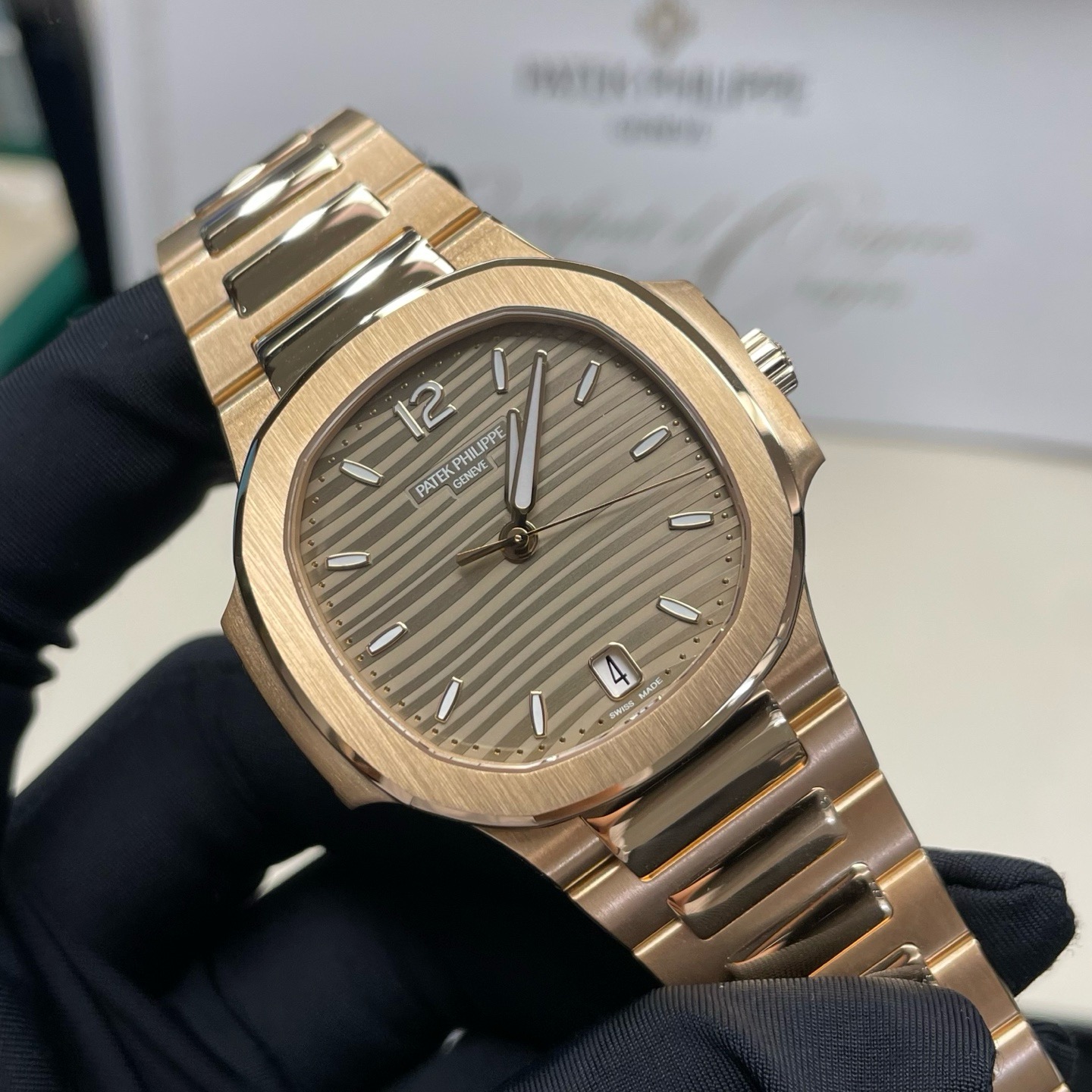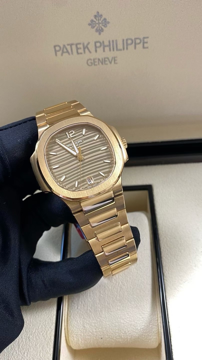 百达翡丽7118/1R-010鹦鹉螺35mm全玫金香槟盘条刻,未使用22年9月全套,参考公价549900,现好价