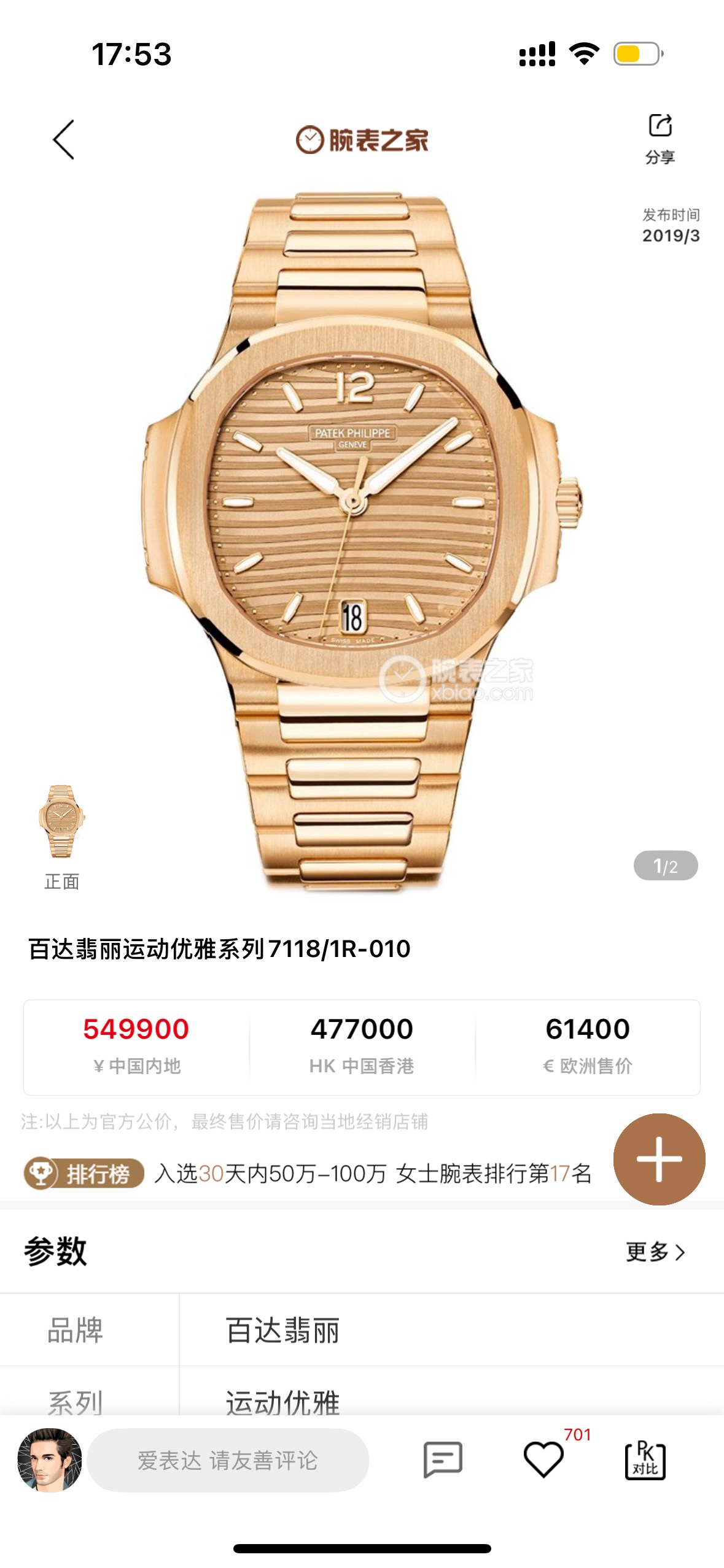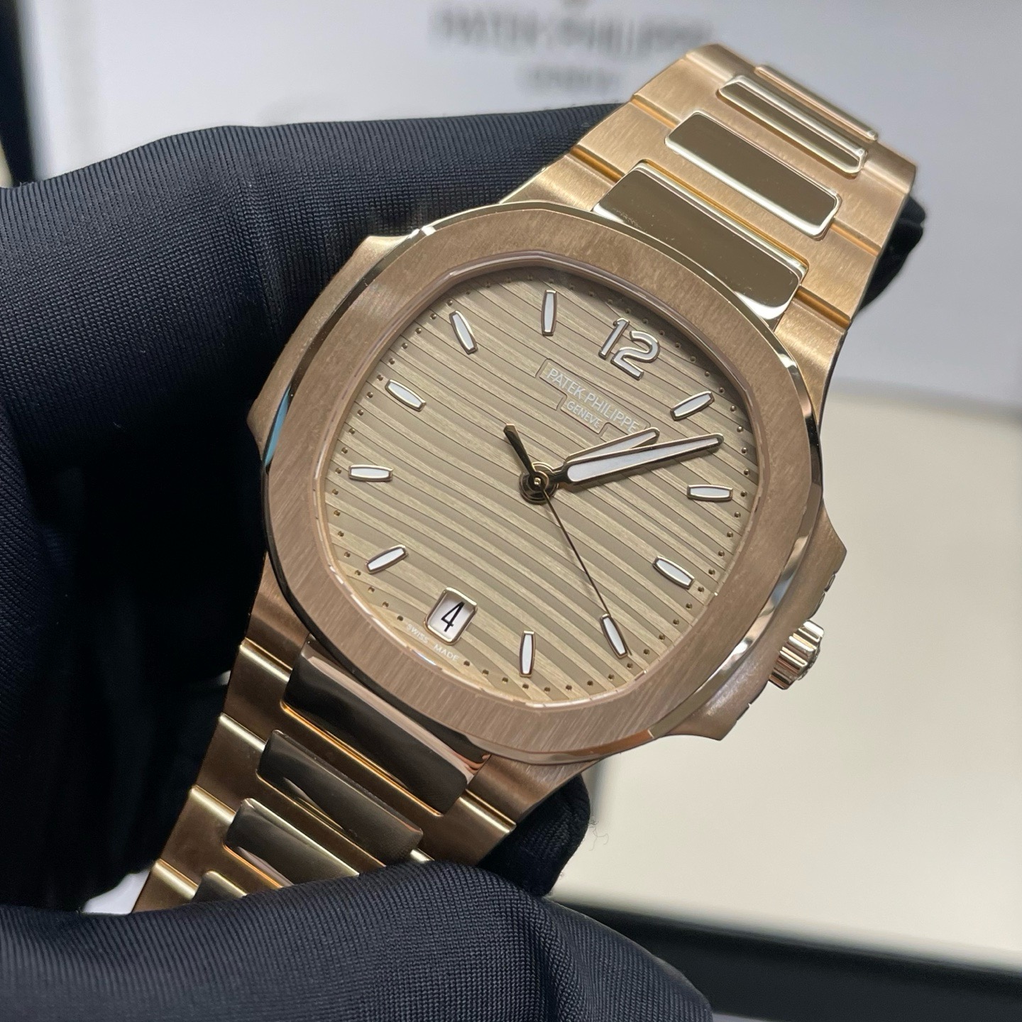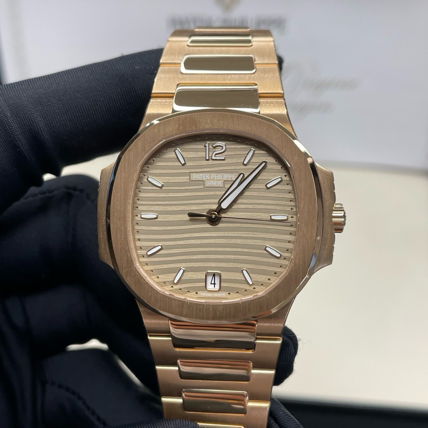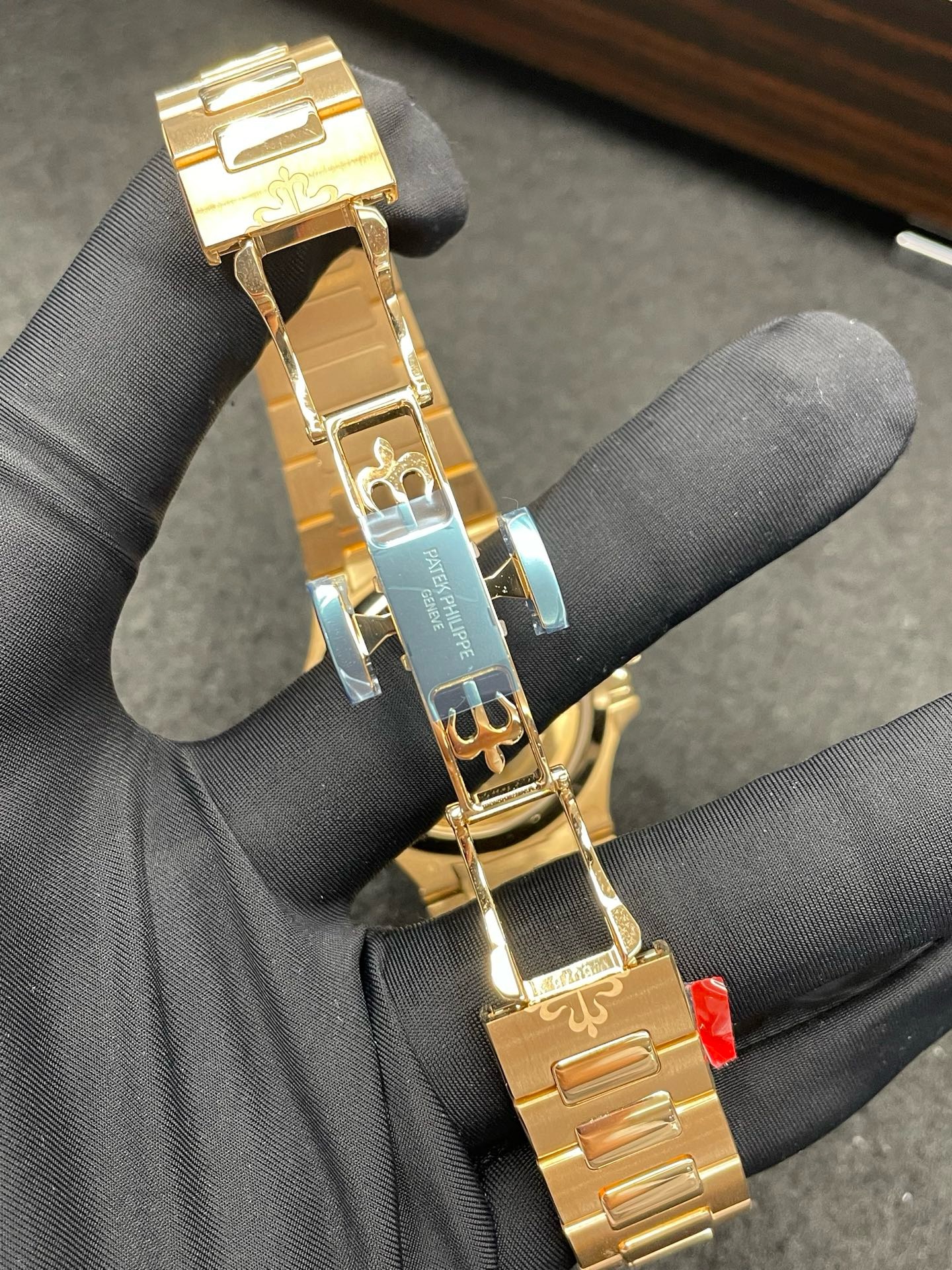百达翡丽7118/1R-010鹦鹉螺35mm全玫金香槟盘条刻,未使用22年9月全套,参考公价549900,现好价