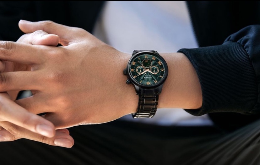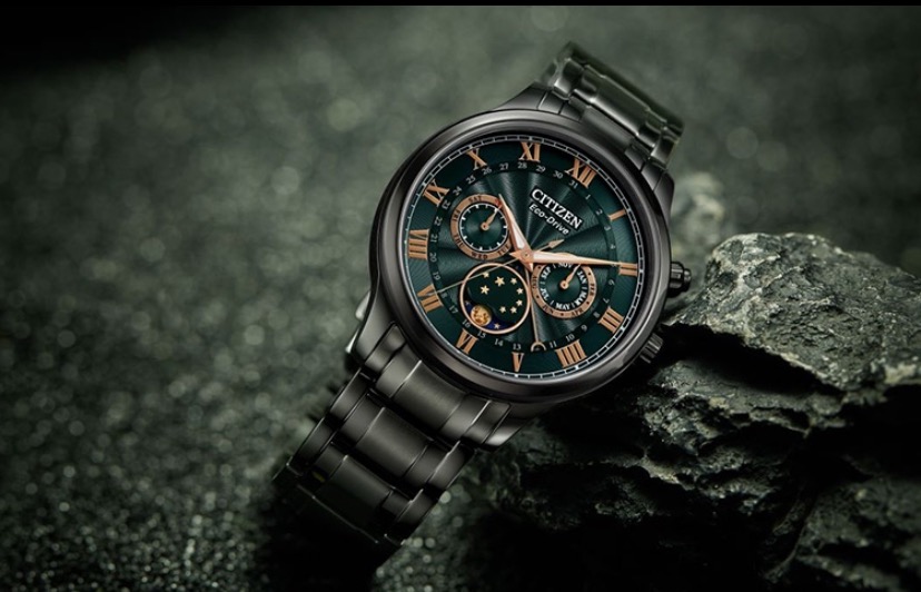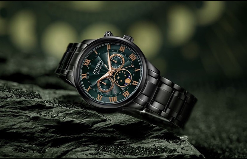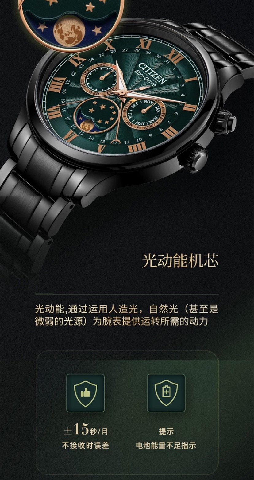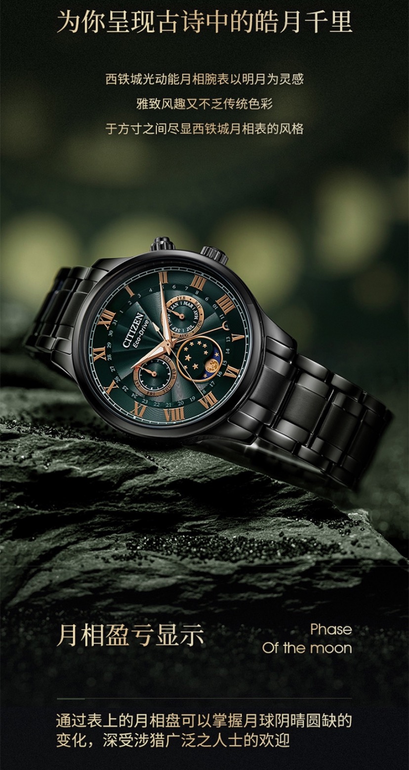 CITIZEN西铁城 光动能系列 月相盈亏显示不锈钢覆BIP三眼表盘防水 光能石英机芯 不锈钢表带 日韩表 男表 绿色表盘 AP1055-87X 专柜售价3900 全新全套全国联保近期保卡