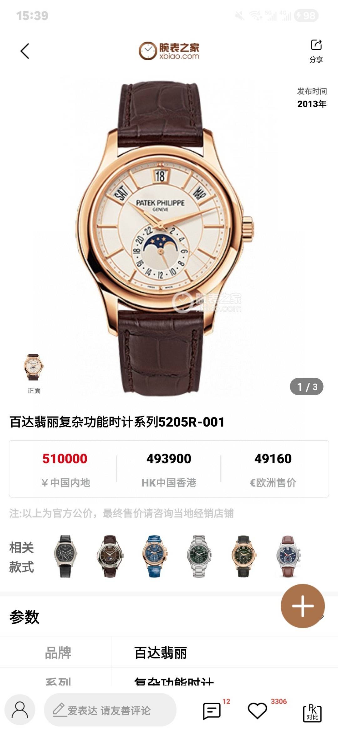 公价 510000 百达翡丽 复杂功能时计系列 型号5205R 自动机械 表径40mm 18k玫瑰金材质 日期 星期 月份 年历 月相显示功能 18 年全套 价格️议 欢迎转发操作!!!