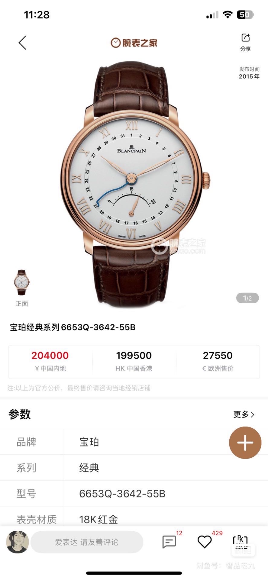 宝珀经典Villeret6653Q-3642-55B机械男性