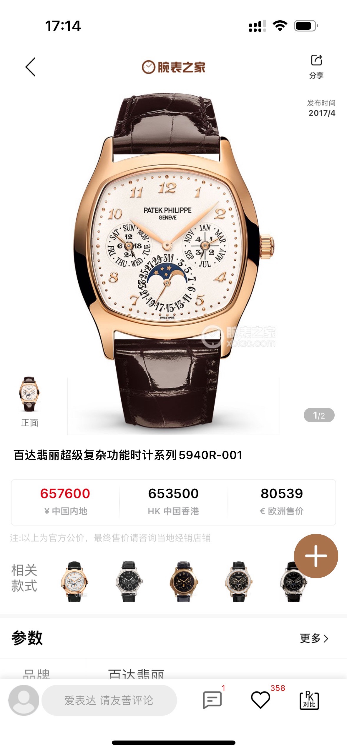 库存品未使用21年全套,表径37✖️44.6毫米,采用240q机芯,动储48小时,防水30米,有日期星期月份年历万年历月相功能,公价657600,现在