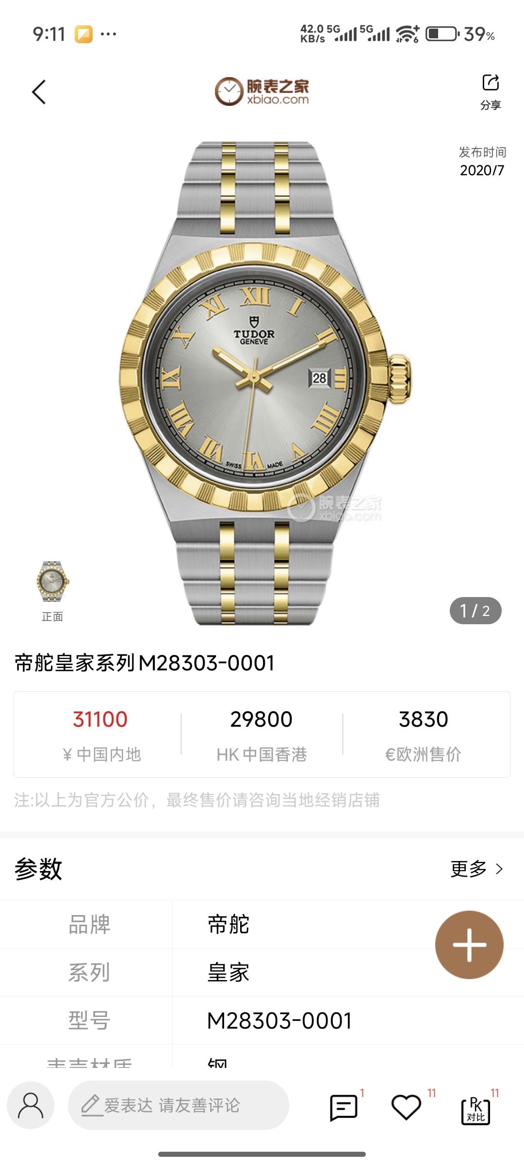 帝舵/Tudor 帝舵皇家系列 m28303-0001 自动上链 28毫米 钢表壳 专柜价:28900.00元 国行全新未使用25年9月卡