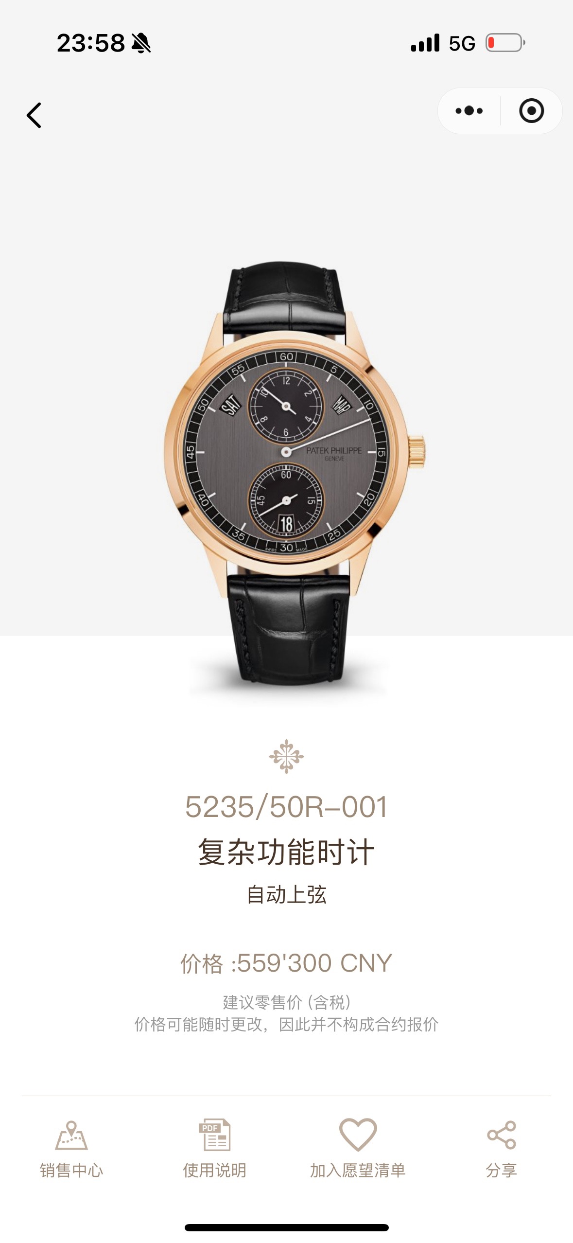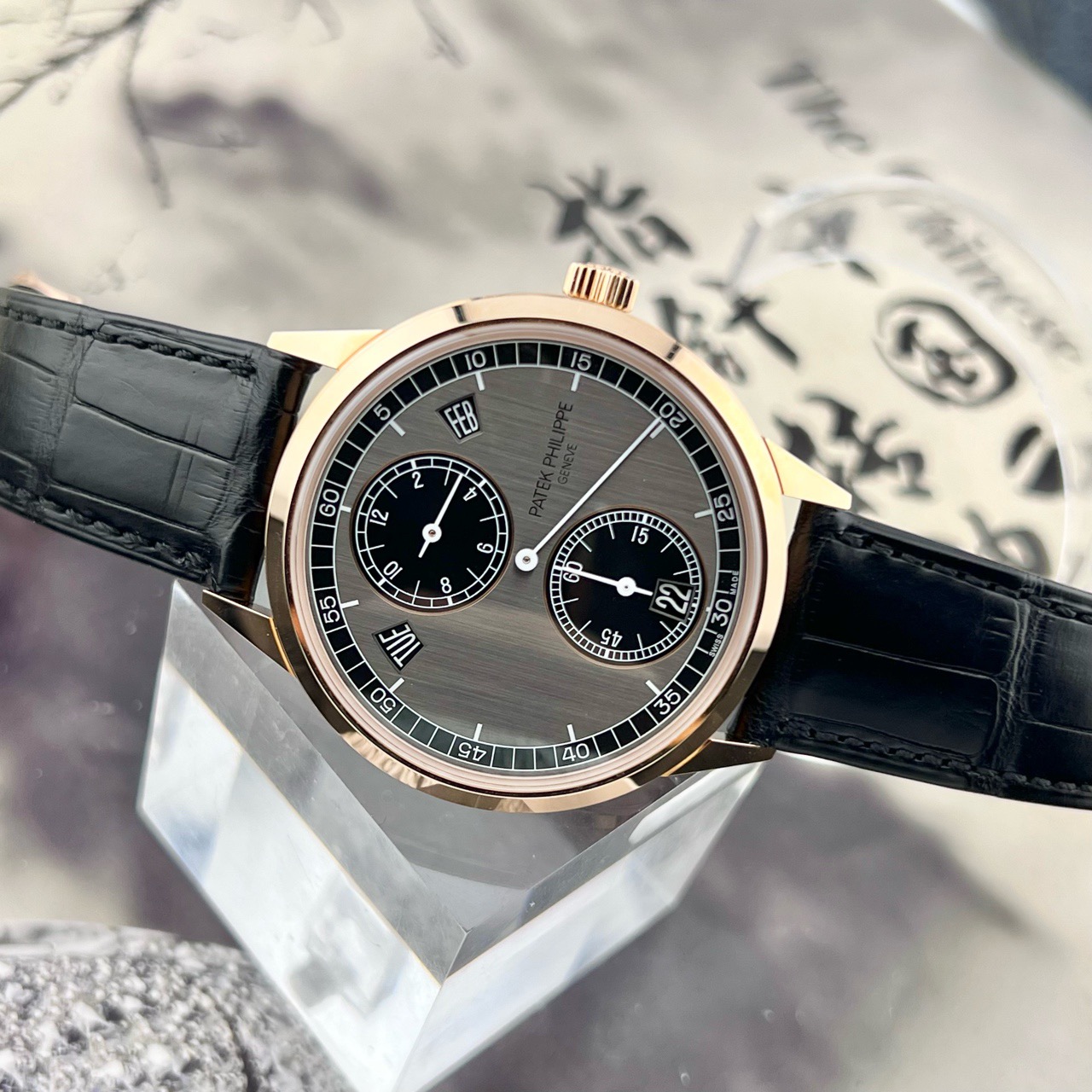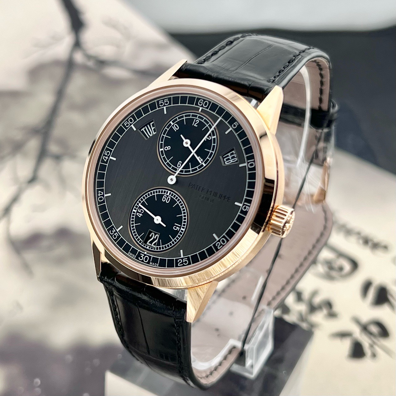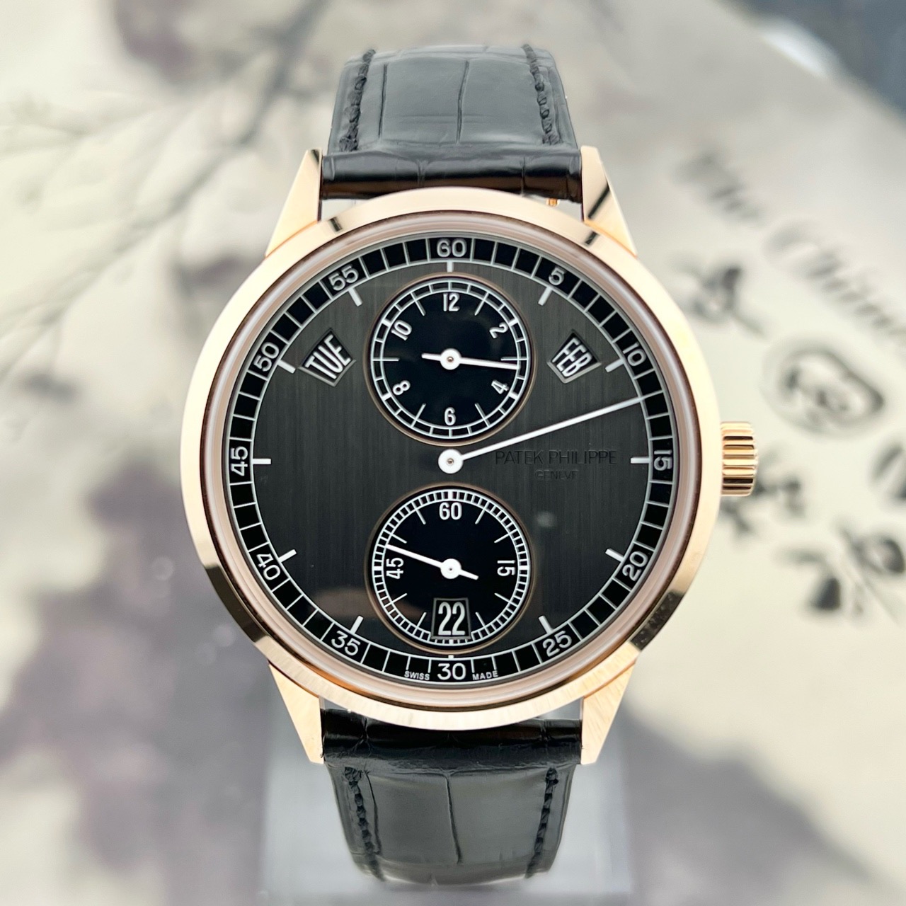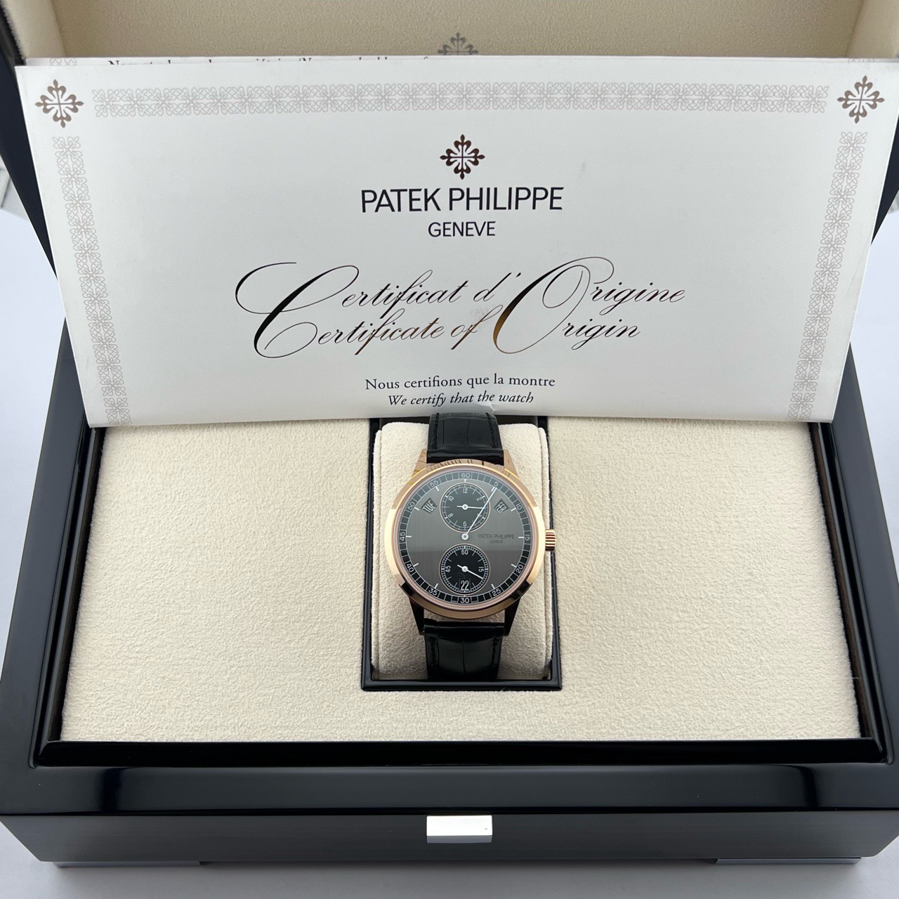 百达翡丽/Patek Philippe 复杂功能时计系列 5235/50R-001 自动机械男士腕表,18k玫瑰金材质,40.5毫米表径,独有的三针一线指针布局,表盘采用石墨色和乌木黑双色设计,专柜价559300,现22年未使用全套好价分享