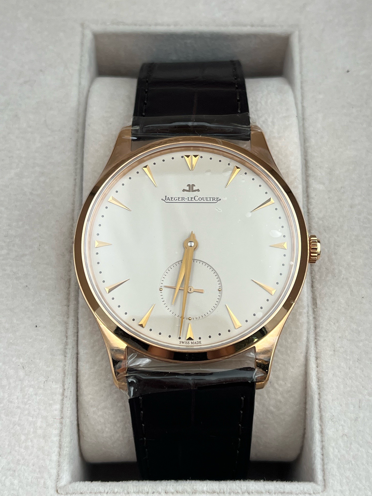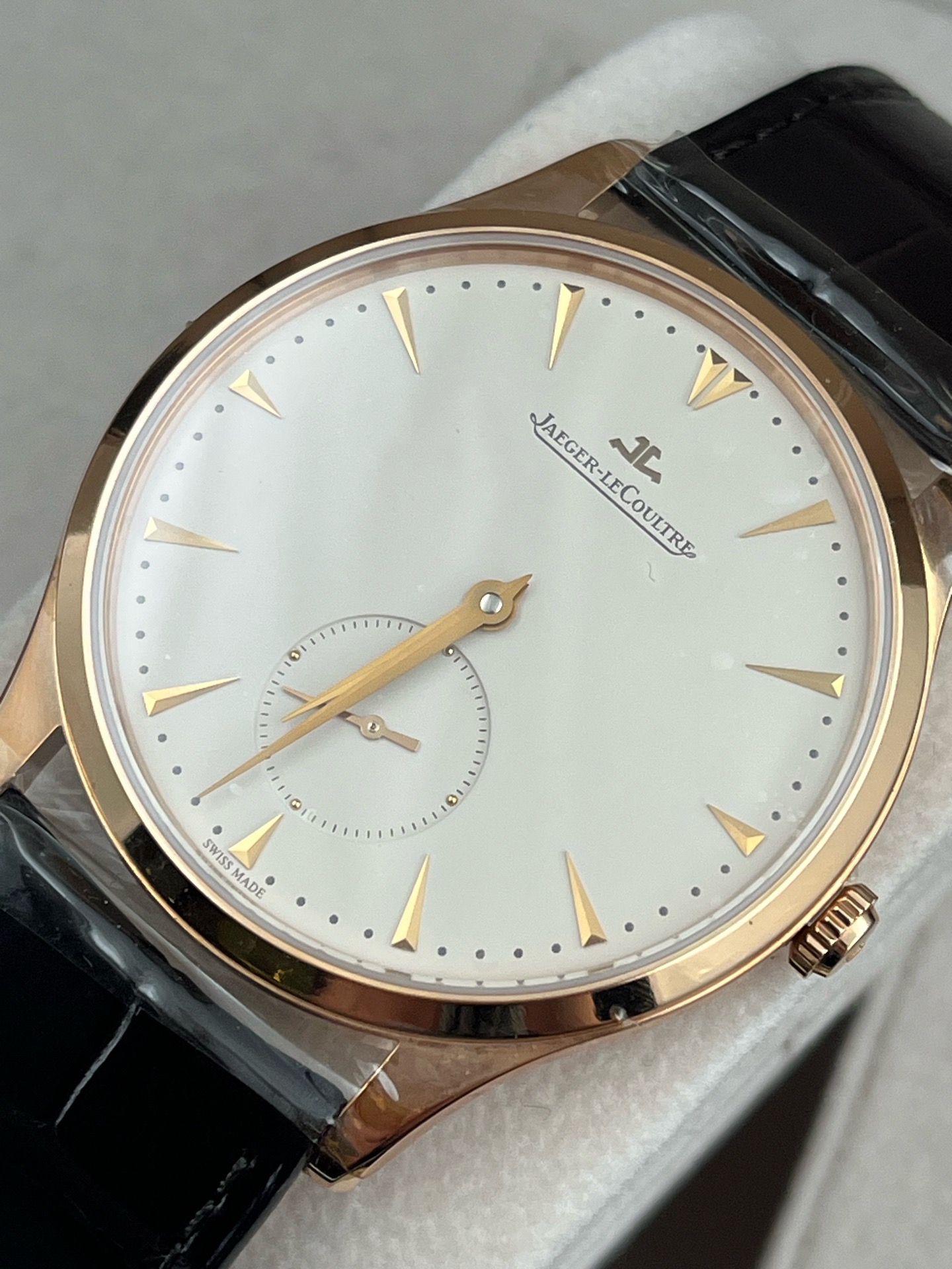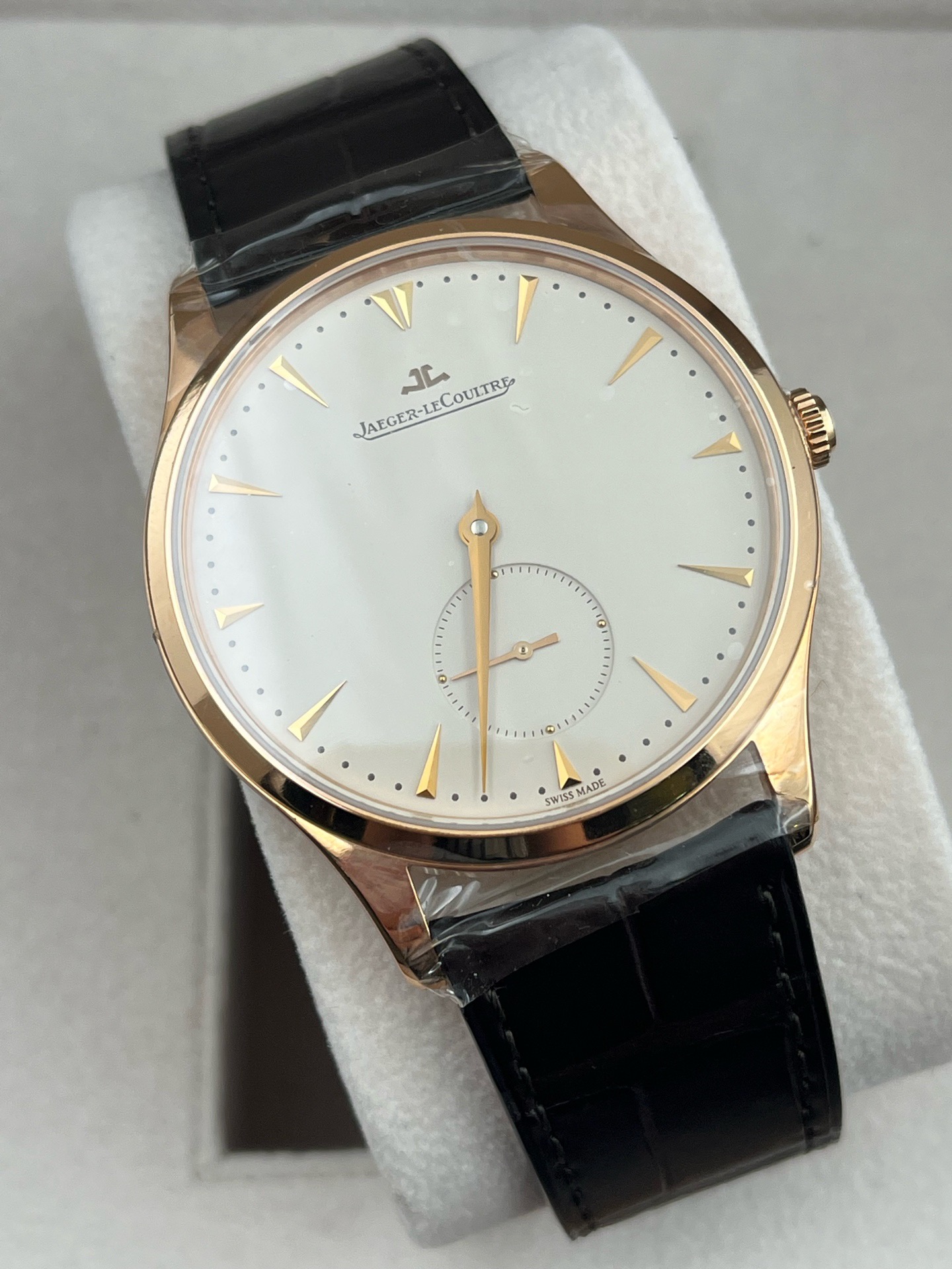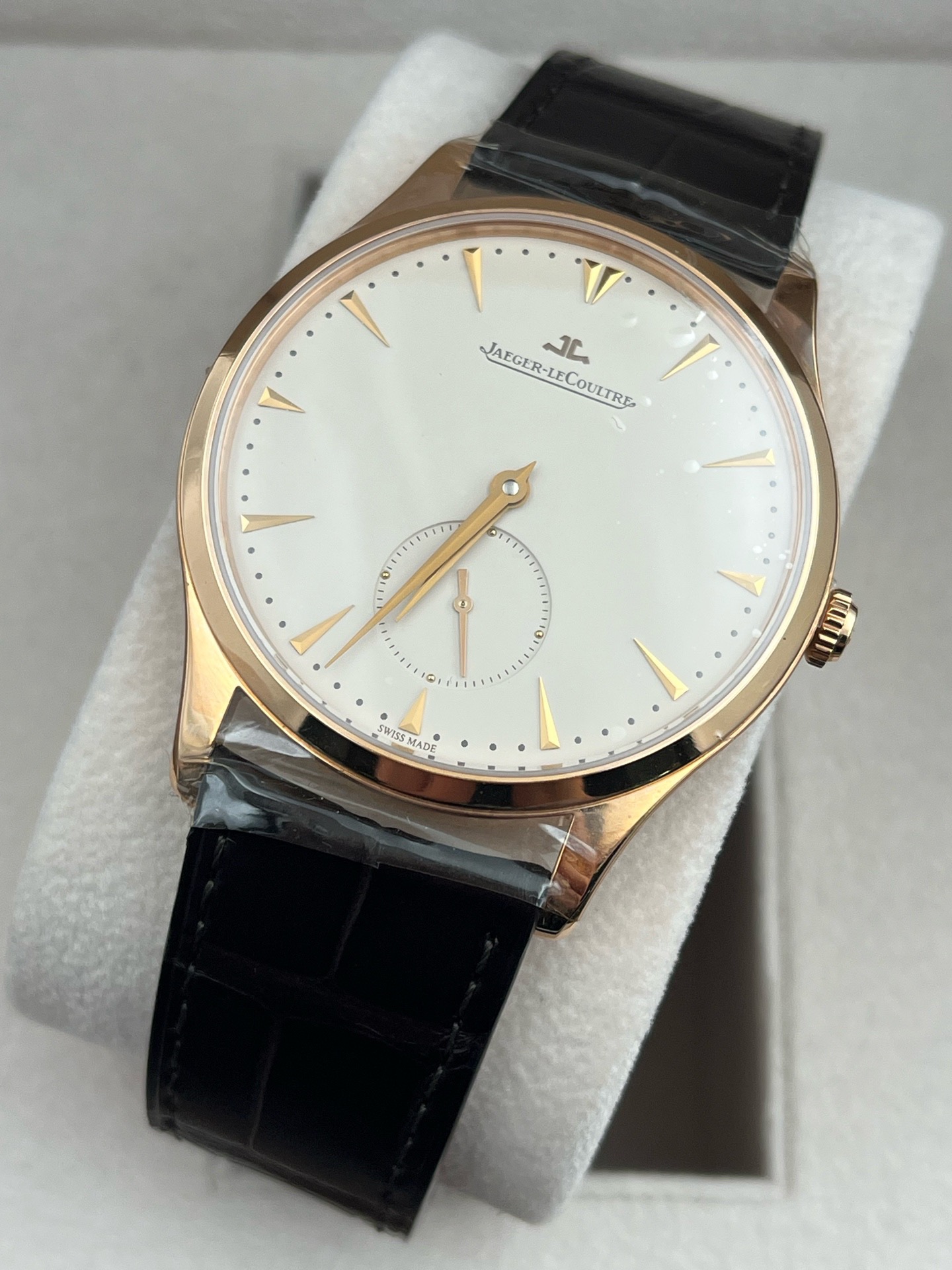 积家大师系列1352520、男士自动机械腕表、表径:40毫米、材质:18K玫瑰金、米色表盘、小秒针设计、18K玫瑰金针扣、全新全套附件、整表库存全新未使用品、商务休闲腕表、原价112000