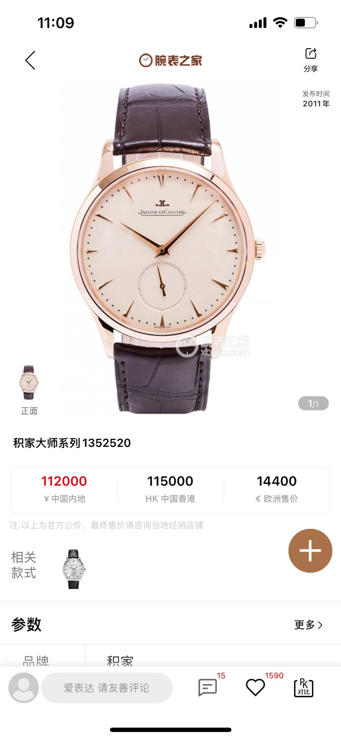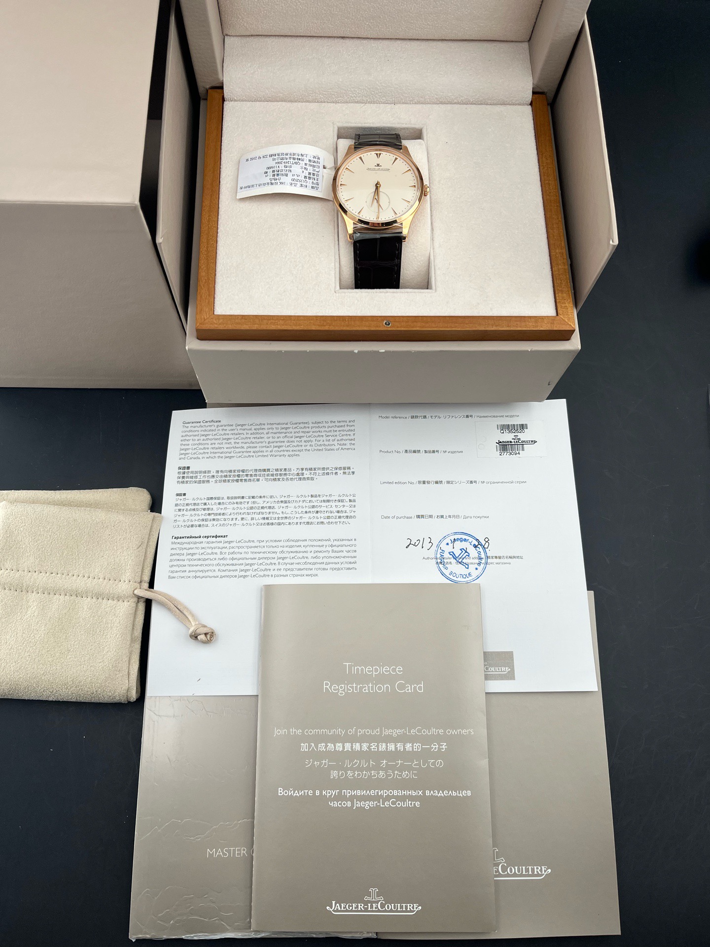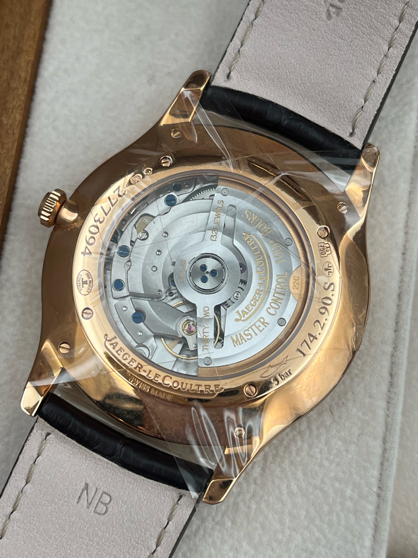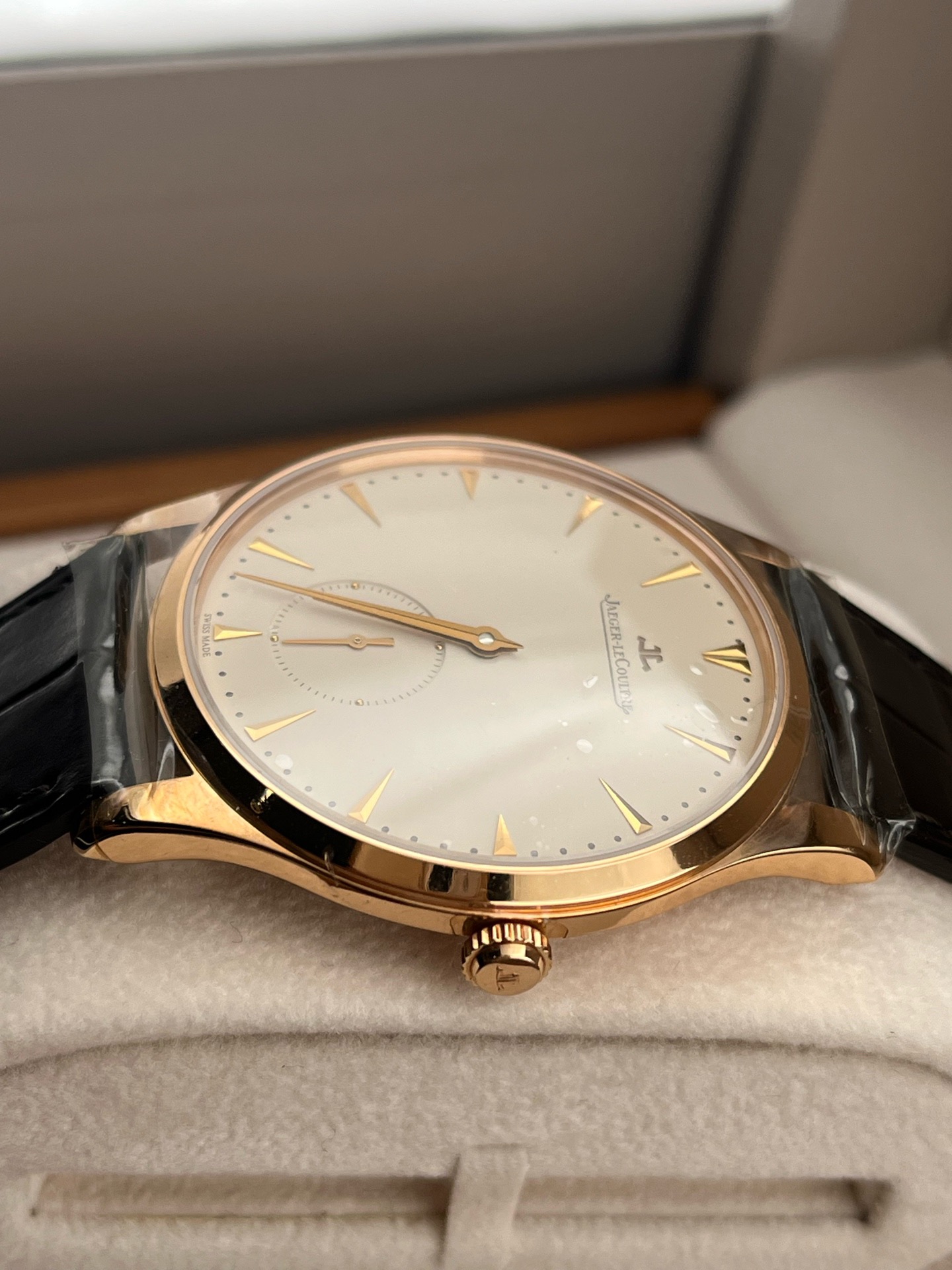 积家大师系列1352520、男士自动机械腕表、表径:40毫米、材质:18K玫瑰金、米色表盘、小秒针设计、18K玫瑰金针扣、全新全套附件、整表库存全新未使用品、商务休闲腕表、原价112000