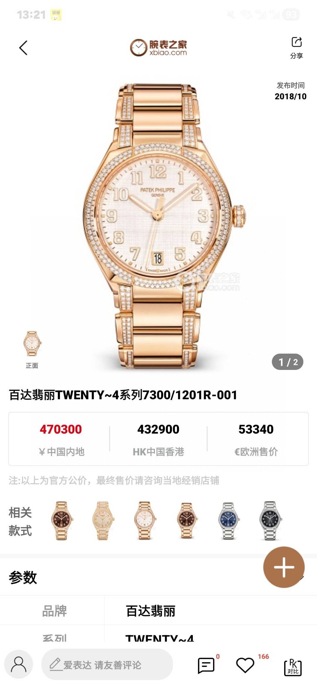 公价 4703000 百达翡丽TWENTY~4系列 型号7300/1201R-001 自动机械 36mm表径 18k玫瑰金材质 日期 显示功能