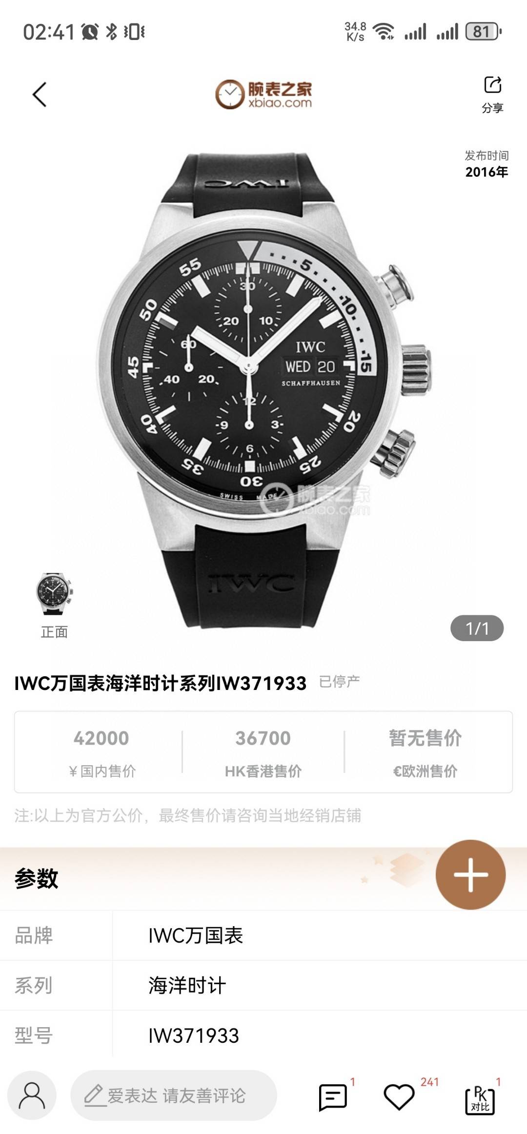 公价42000万国海洋时计系列 型号IW371933自动机械42mm表径 钢材质 日期 星期显示功能 单表 价格️议 欢迎转发操作!!!