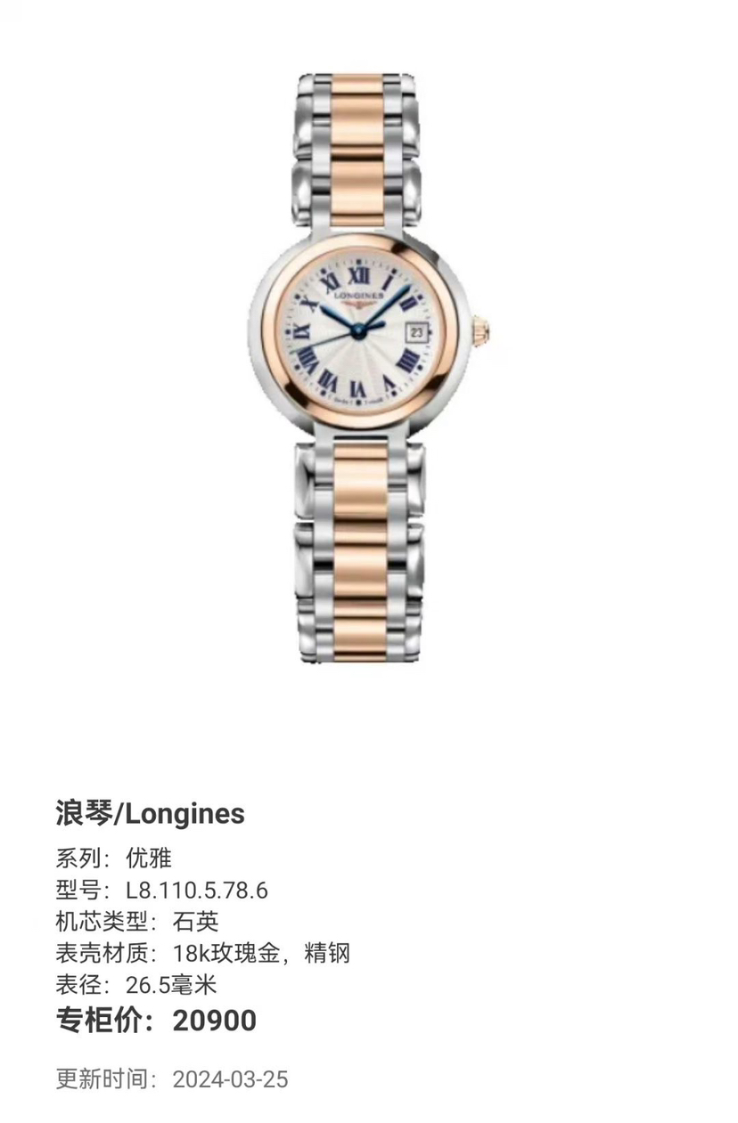 浪琴/Longines 心月 L8.110.5.78.6 石英女表 18k玫瑰金,精钢 26.5毫米 全新全套 热门款 专柜价20900 现货