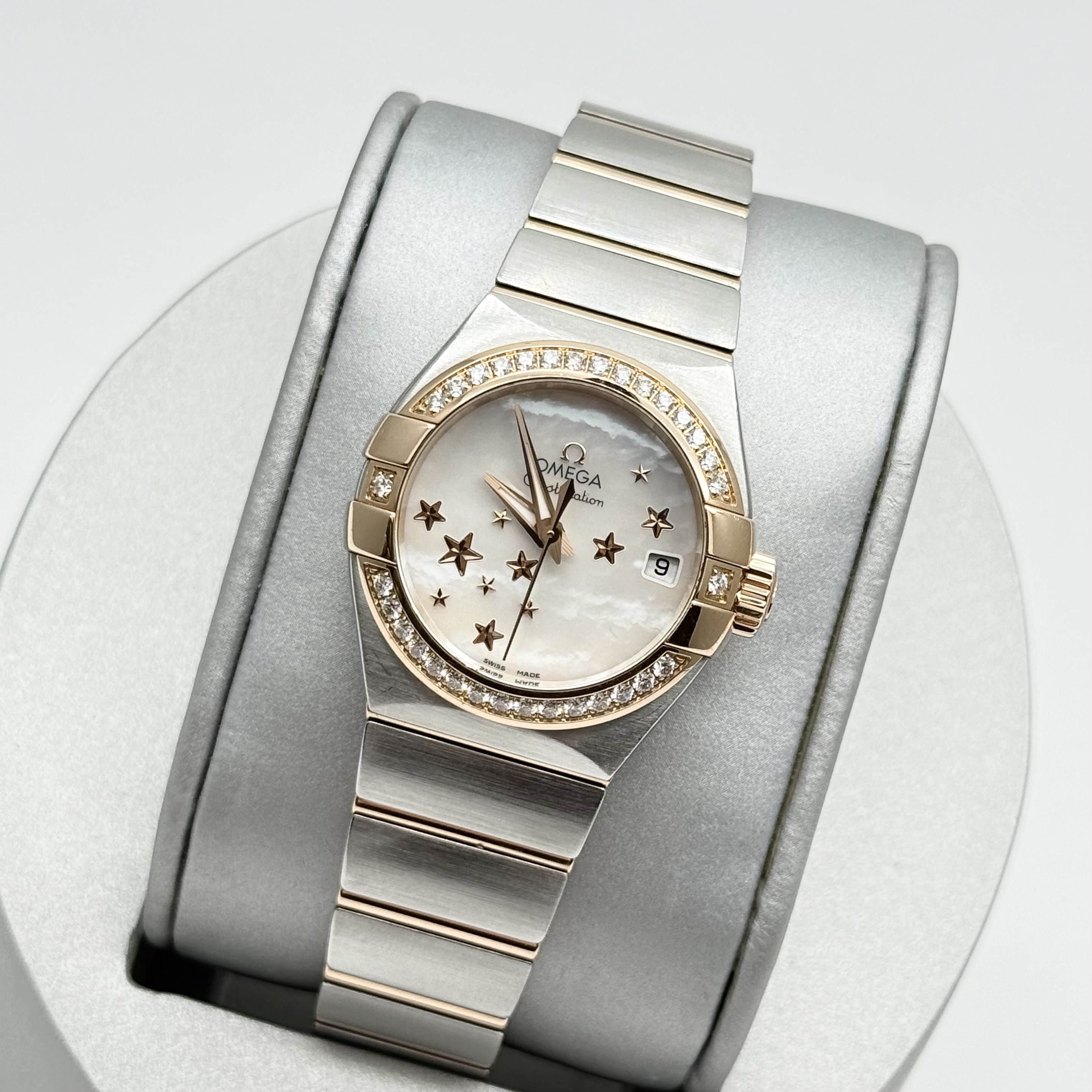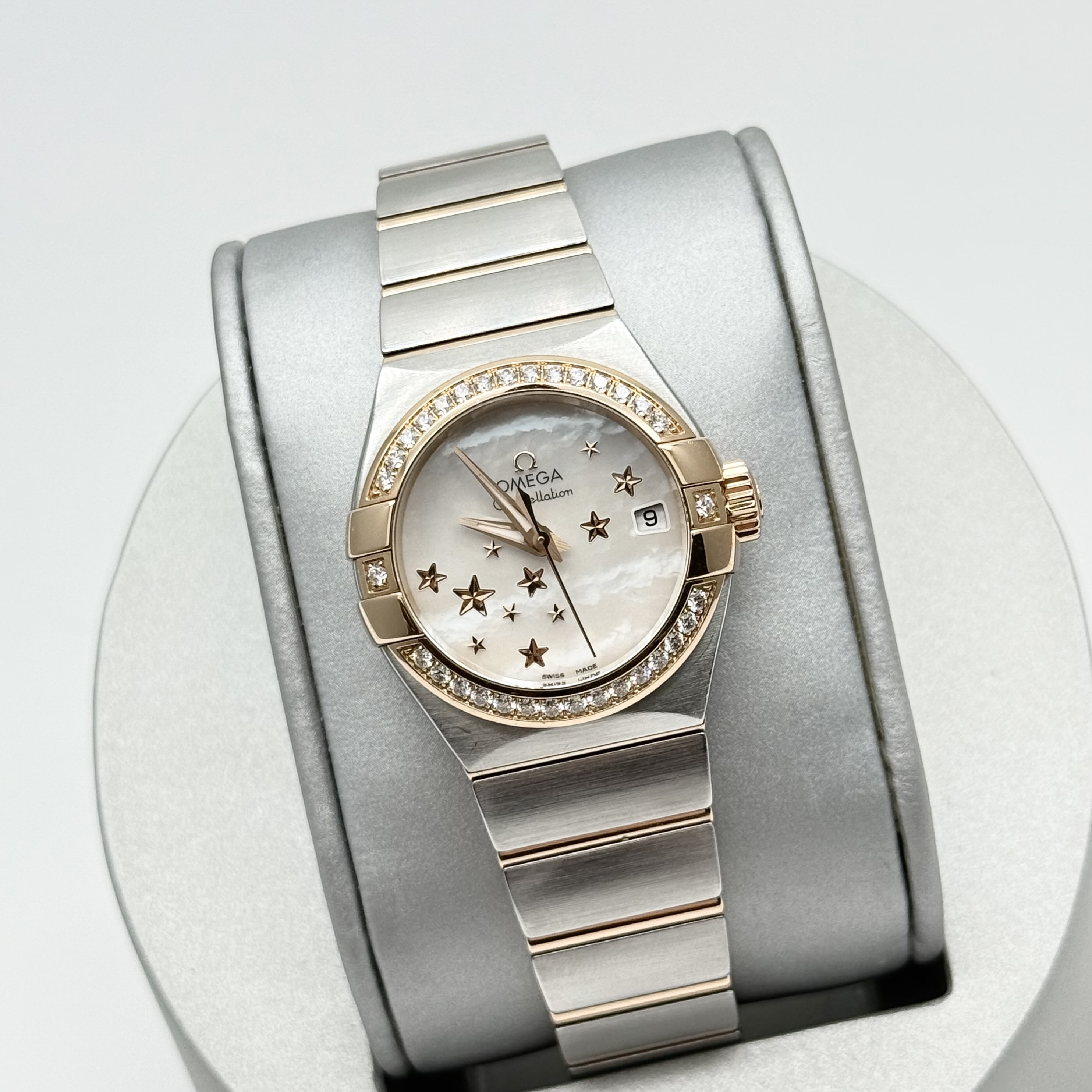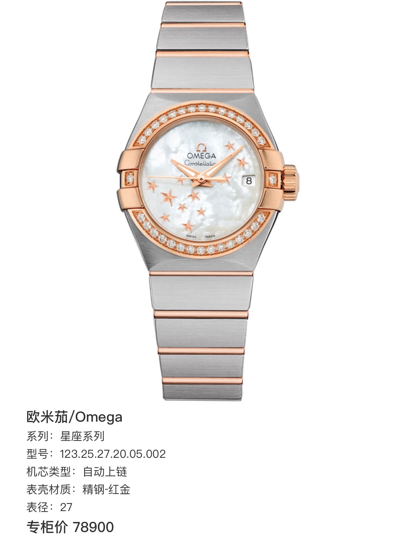 欧米茄 星座 123.25.27.20.05.002 女款自动机械 表径27 外圈18k玫瑰金原镶钻 白贝母星星盘 大三针设计 专柜售价78900 单表现货好价~。
