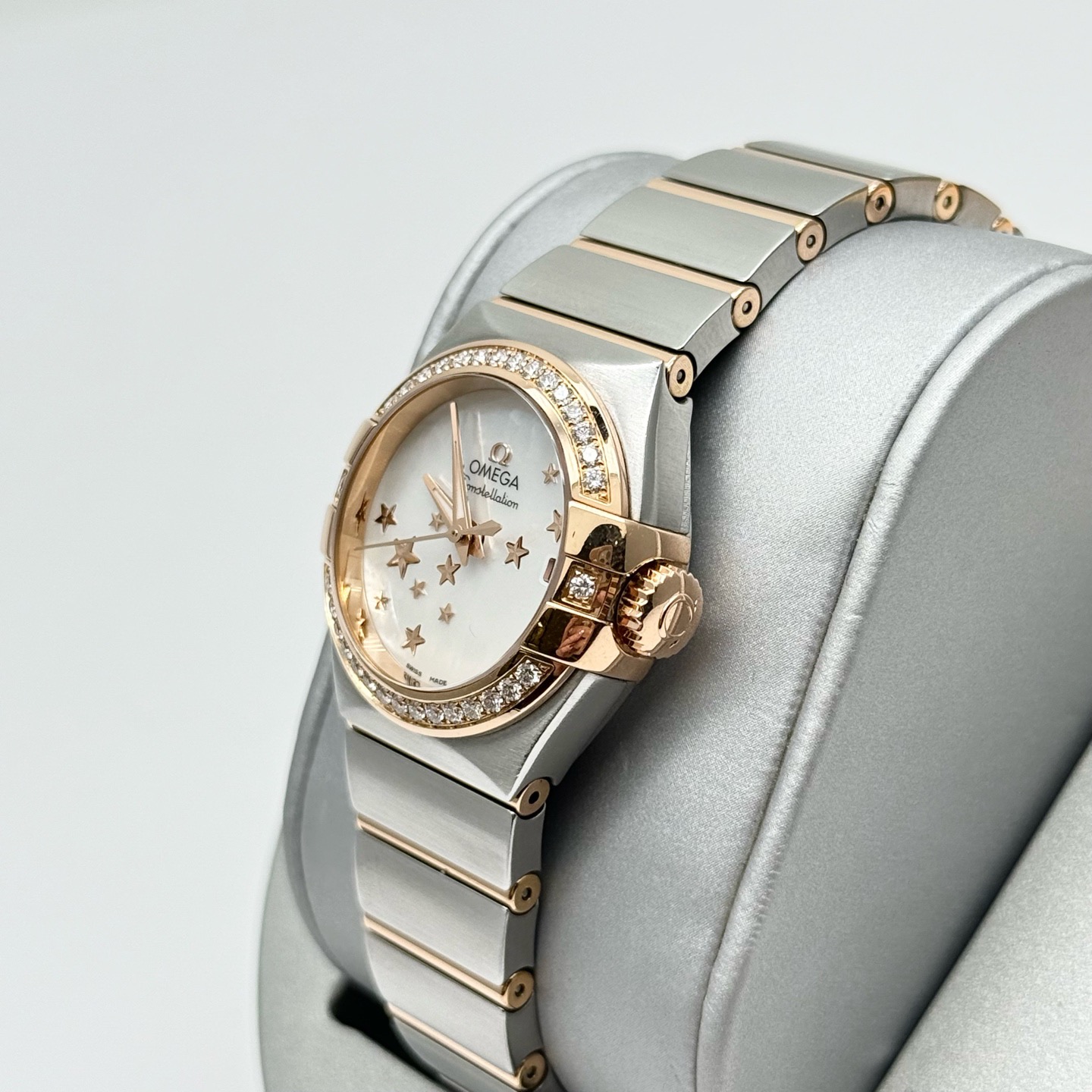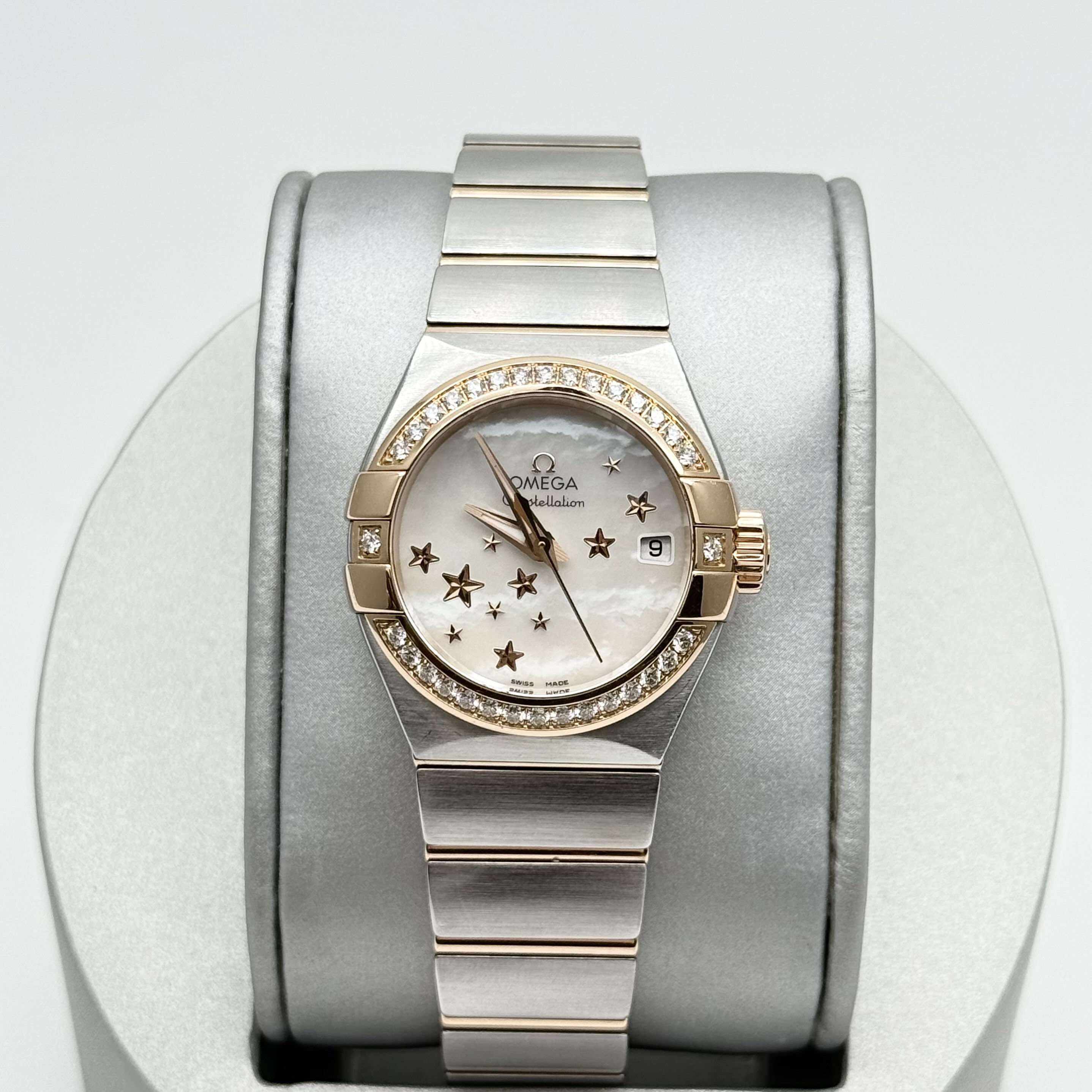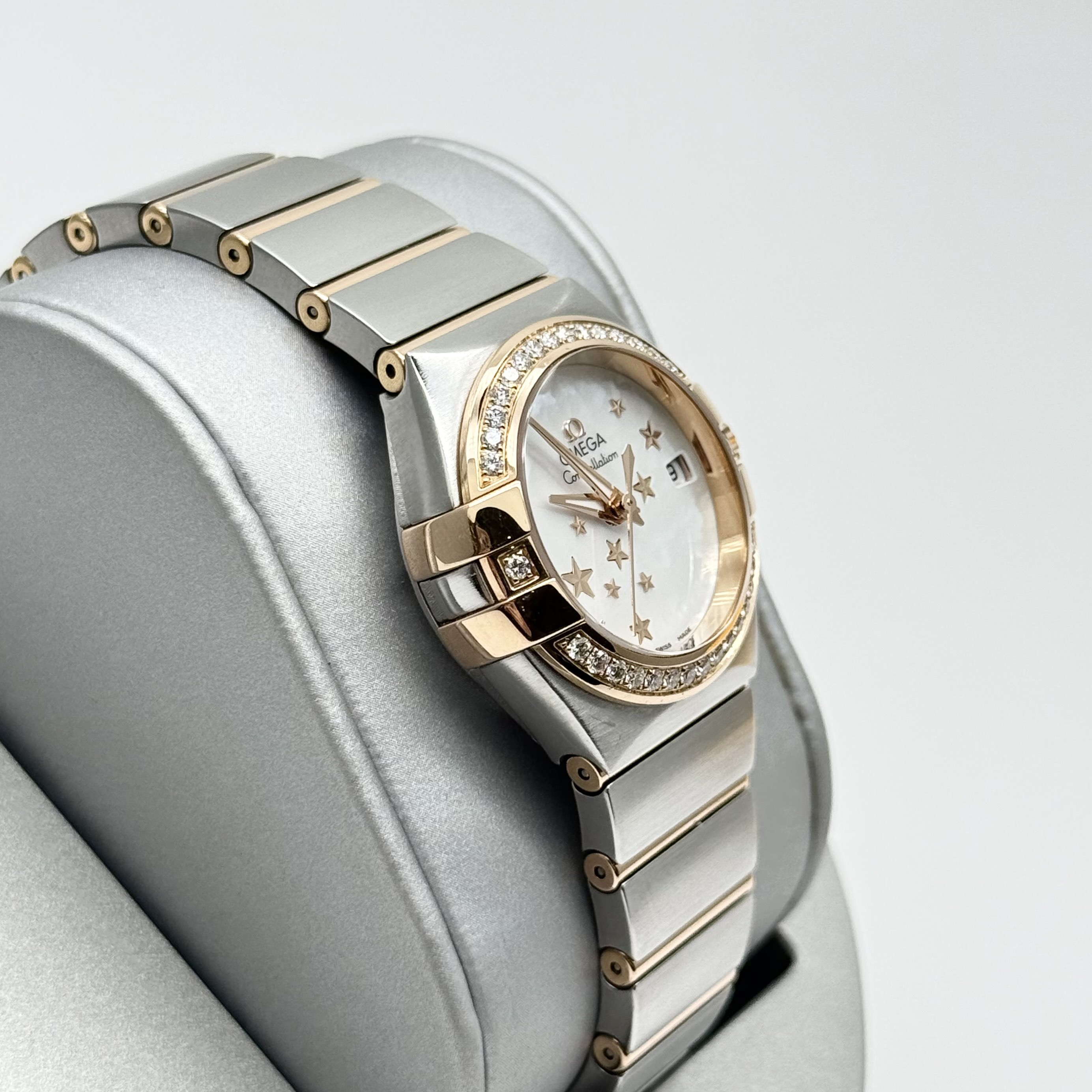 欧米茄 星座 123.25.27.20.05.002 女款自动机械 表径27 外圈18k玫瑰金原镶钻 白贝母星星盘 大三针设计 专柜售价78900 单表现货好价~。