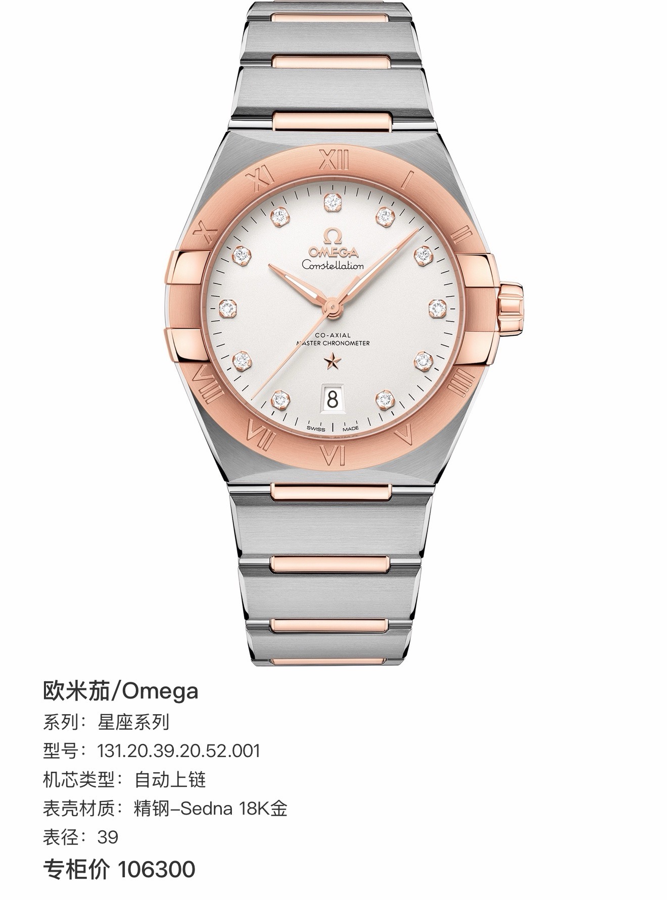 欧米茄/Omega 星座系列 131.20.39.20.52.001 自动上链 精钢‑Sedna 18K金 表径39mm,2023年10月购入,专柜价106300,现好价