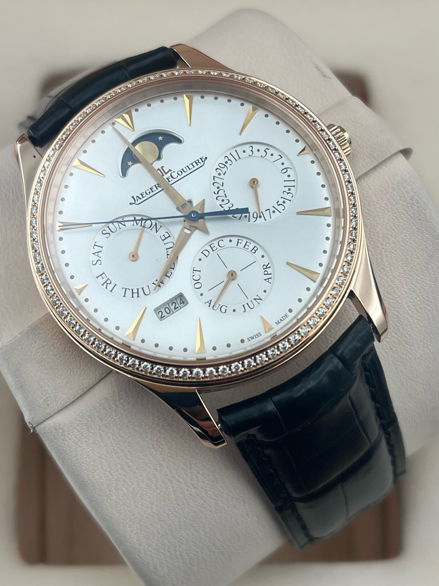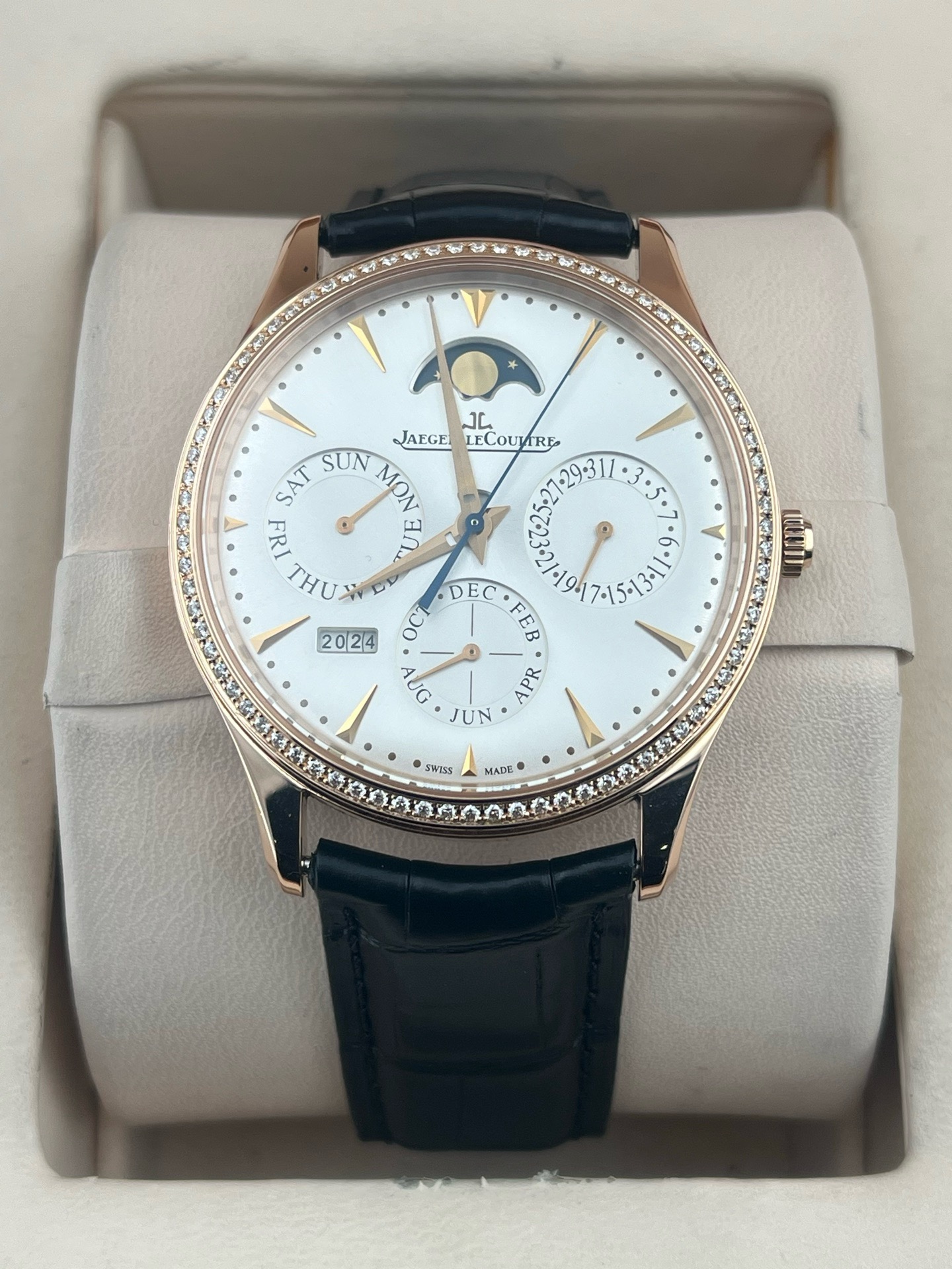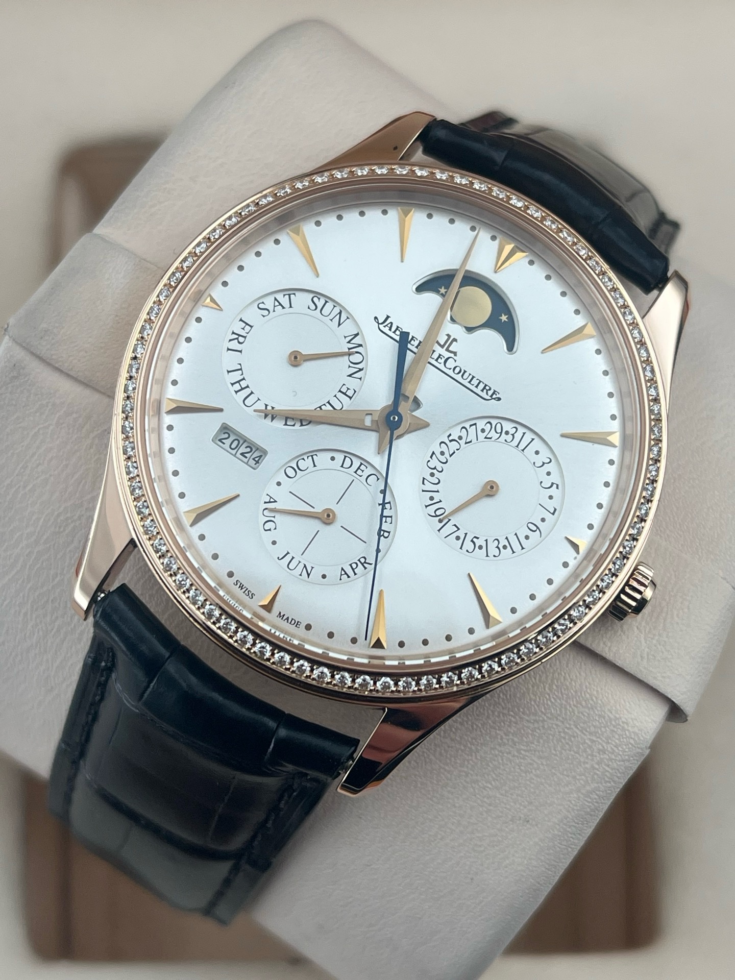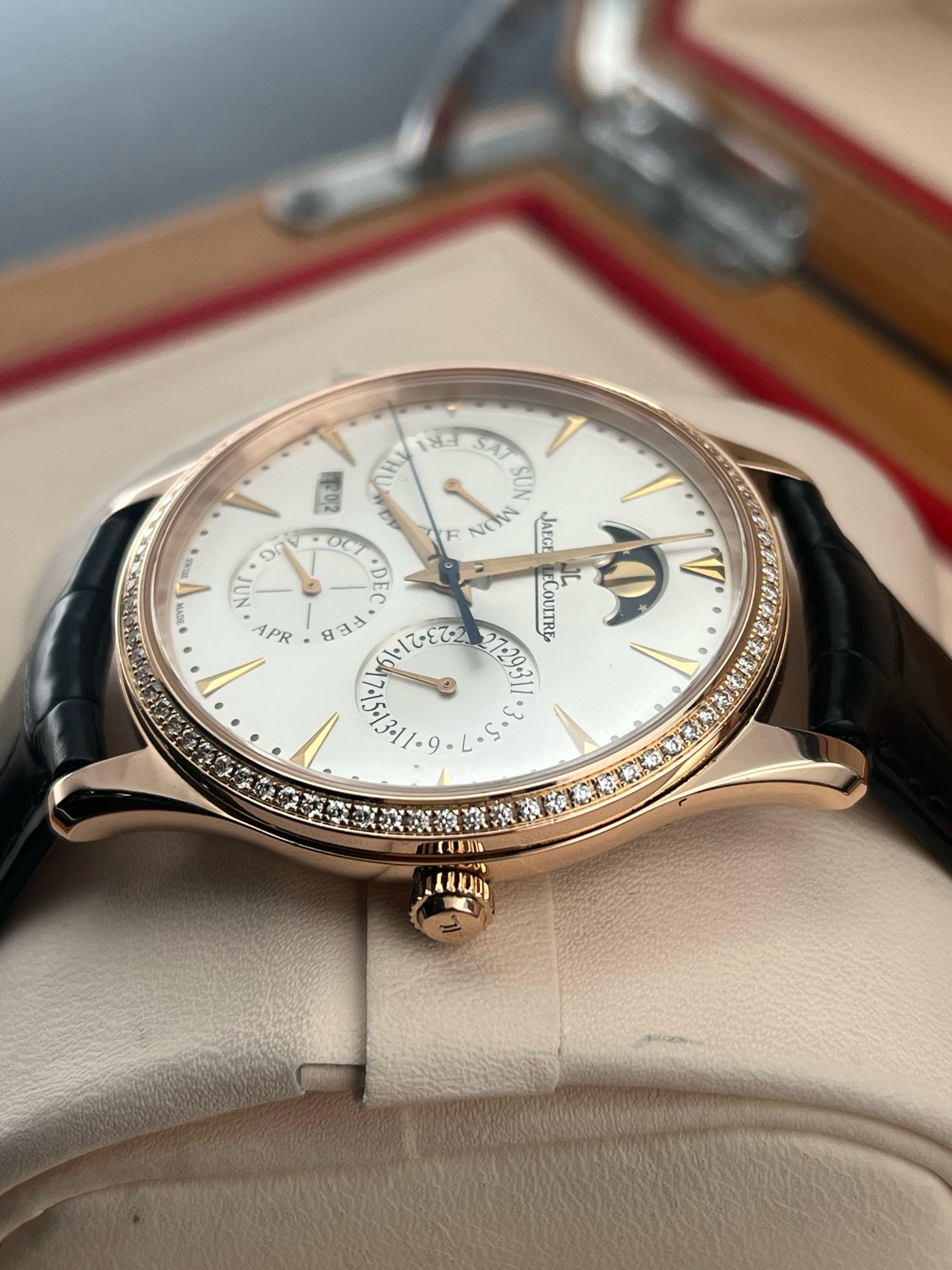 积家大师系列1302501(万年历)、男士自动机械腕表、表径:39毫米、材质:18K玫瑰金/皮带、银灰色表盘、锥形刻度、日期星期月份年历显示、月相功能、新成色、商务休闲腕表、原价375000