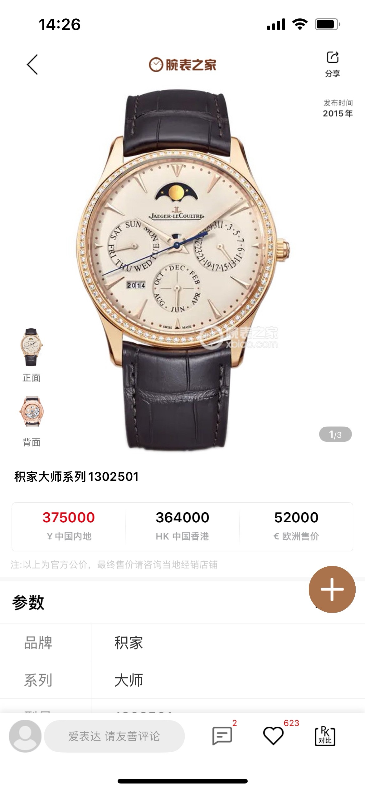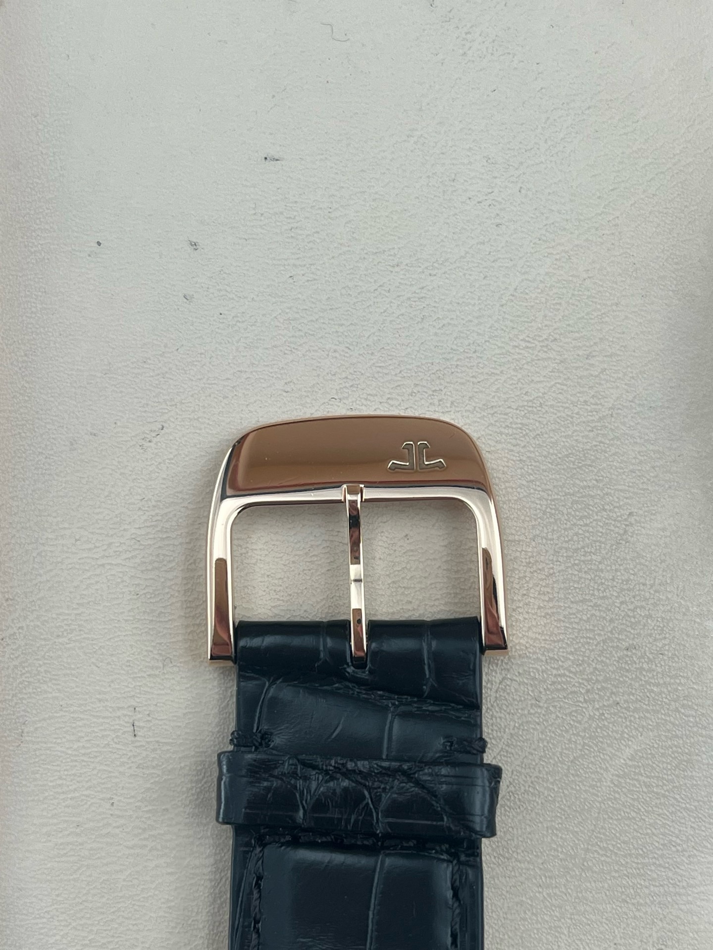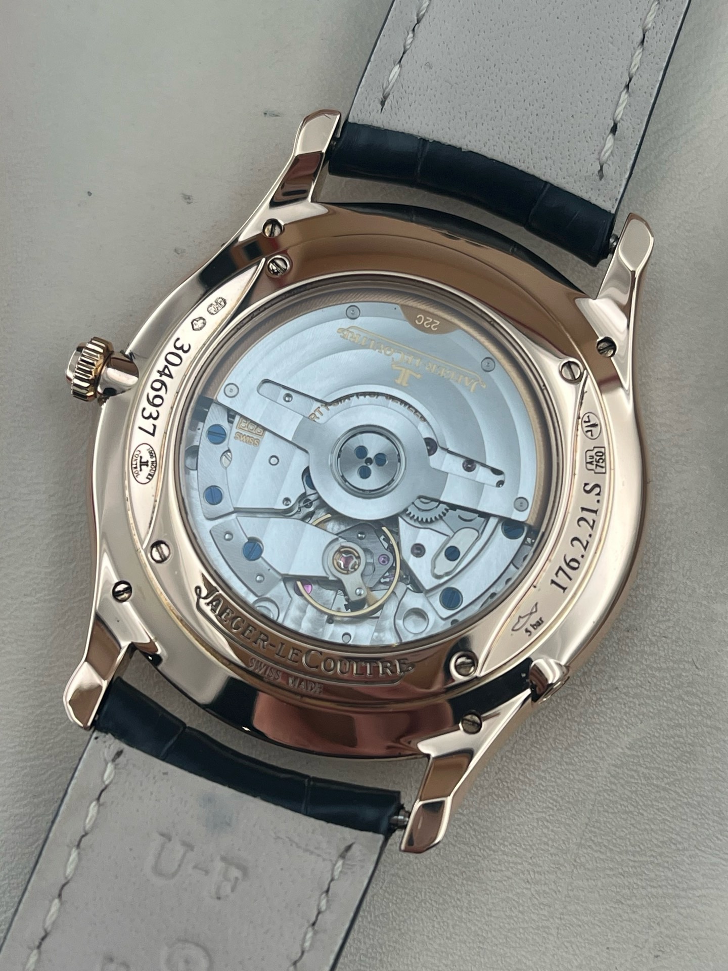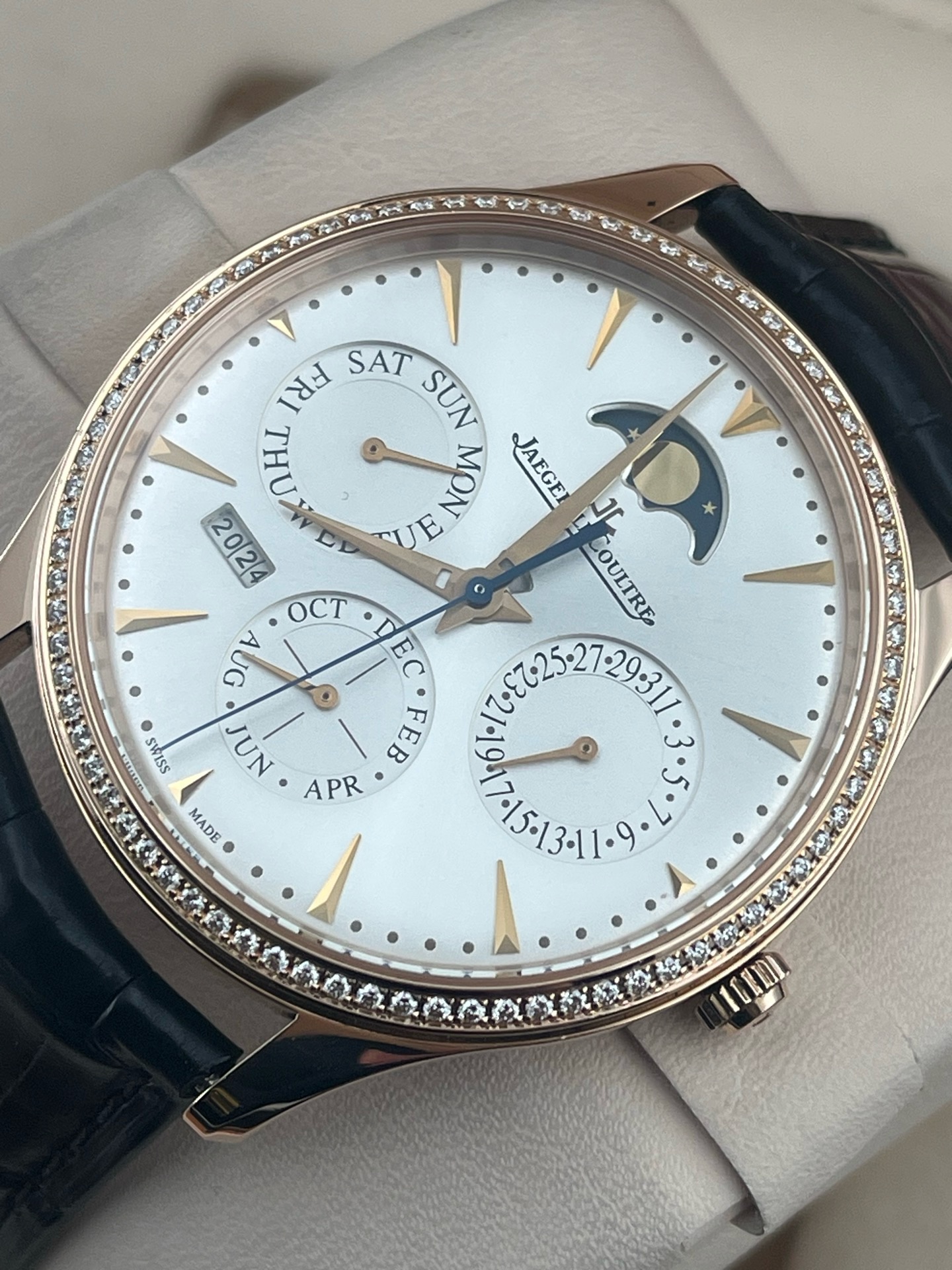 积家大师系列1302501(万年历)、男士自动机械腕表、表径:39毫米、材质:18K玫瑰金/皮带、银灰色表盘、锥形刻度、日期星期月份年历显示、月相功能、新成色、商务休闲腕表、原价375000