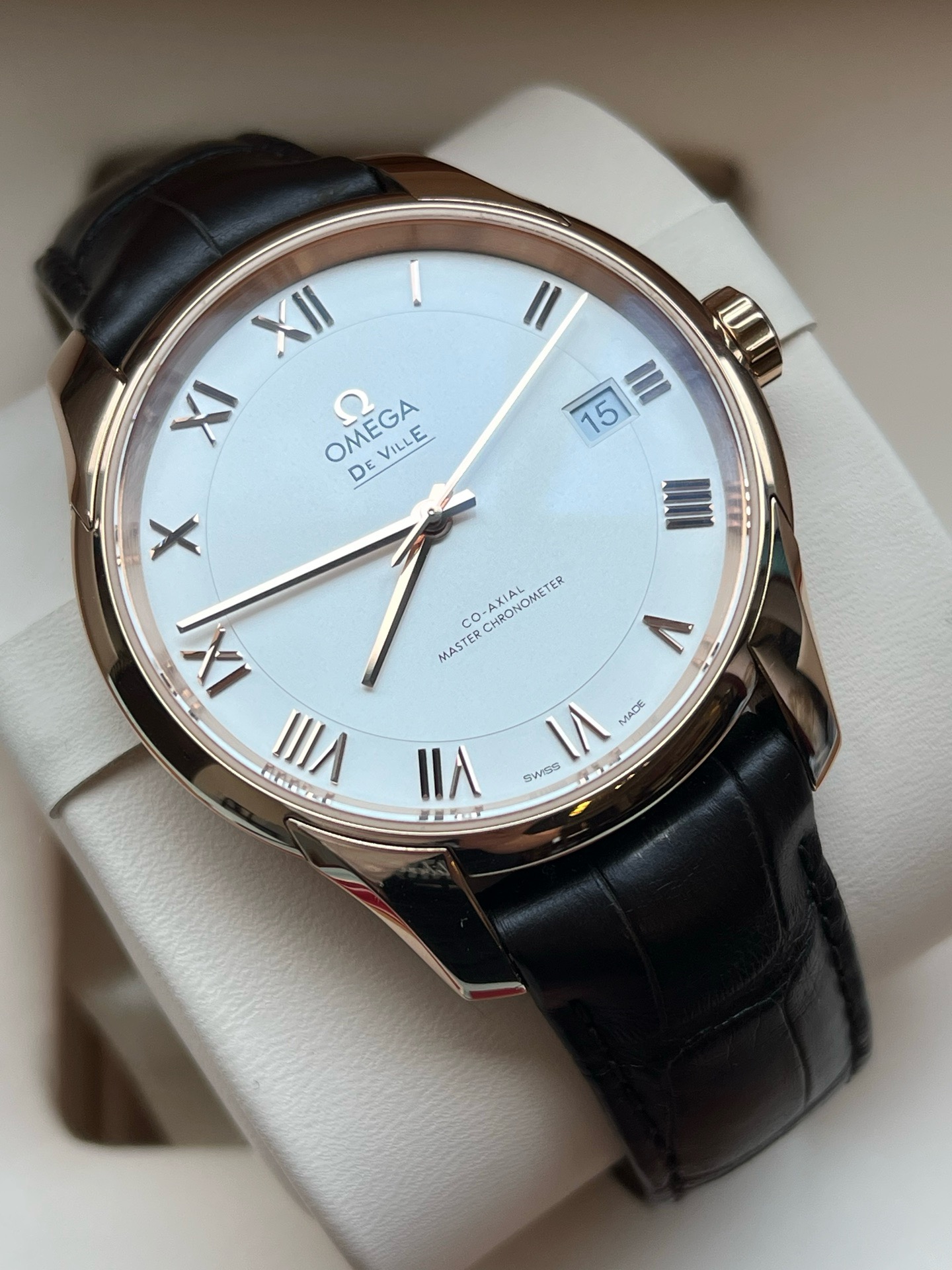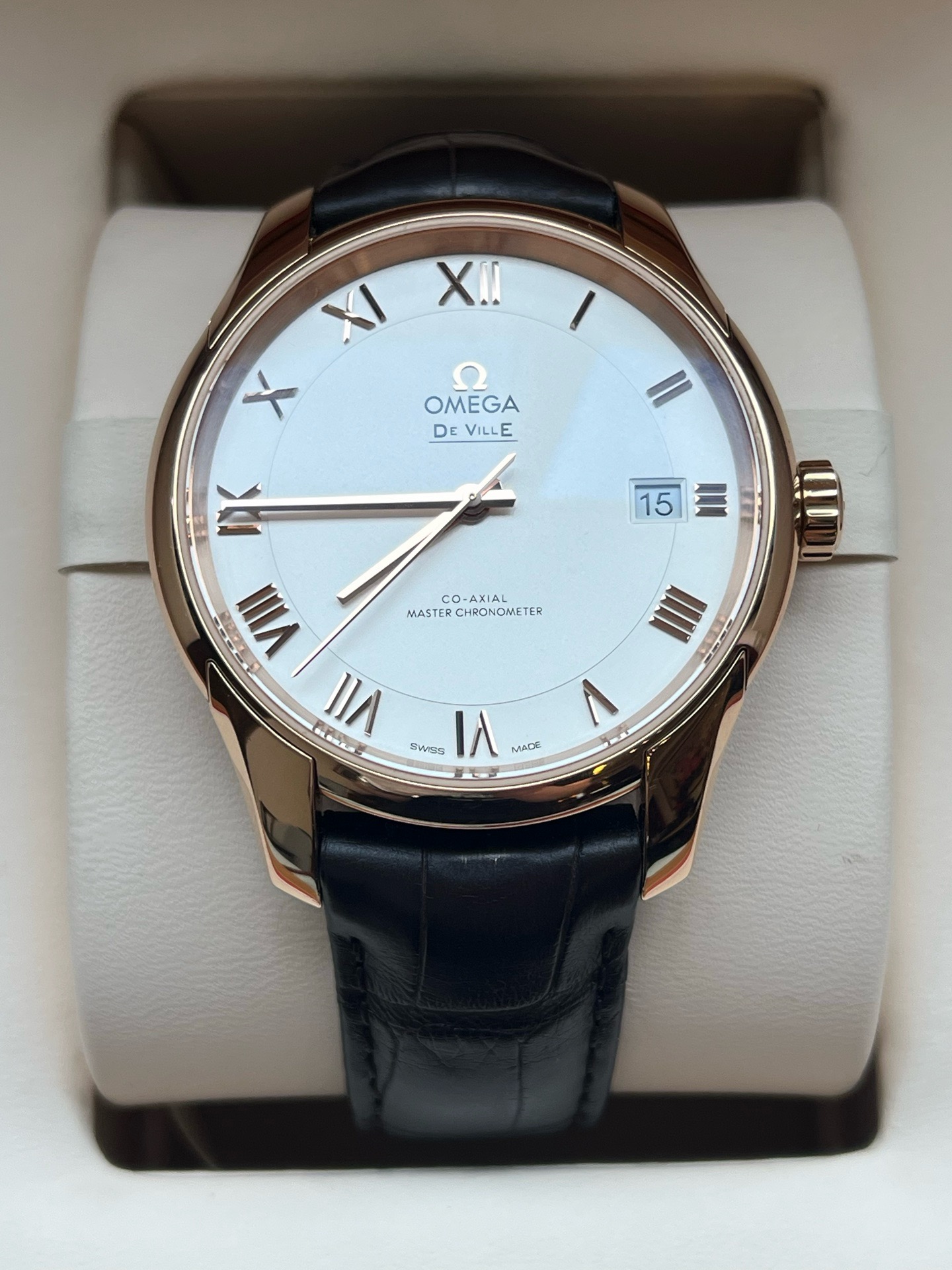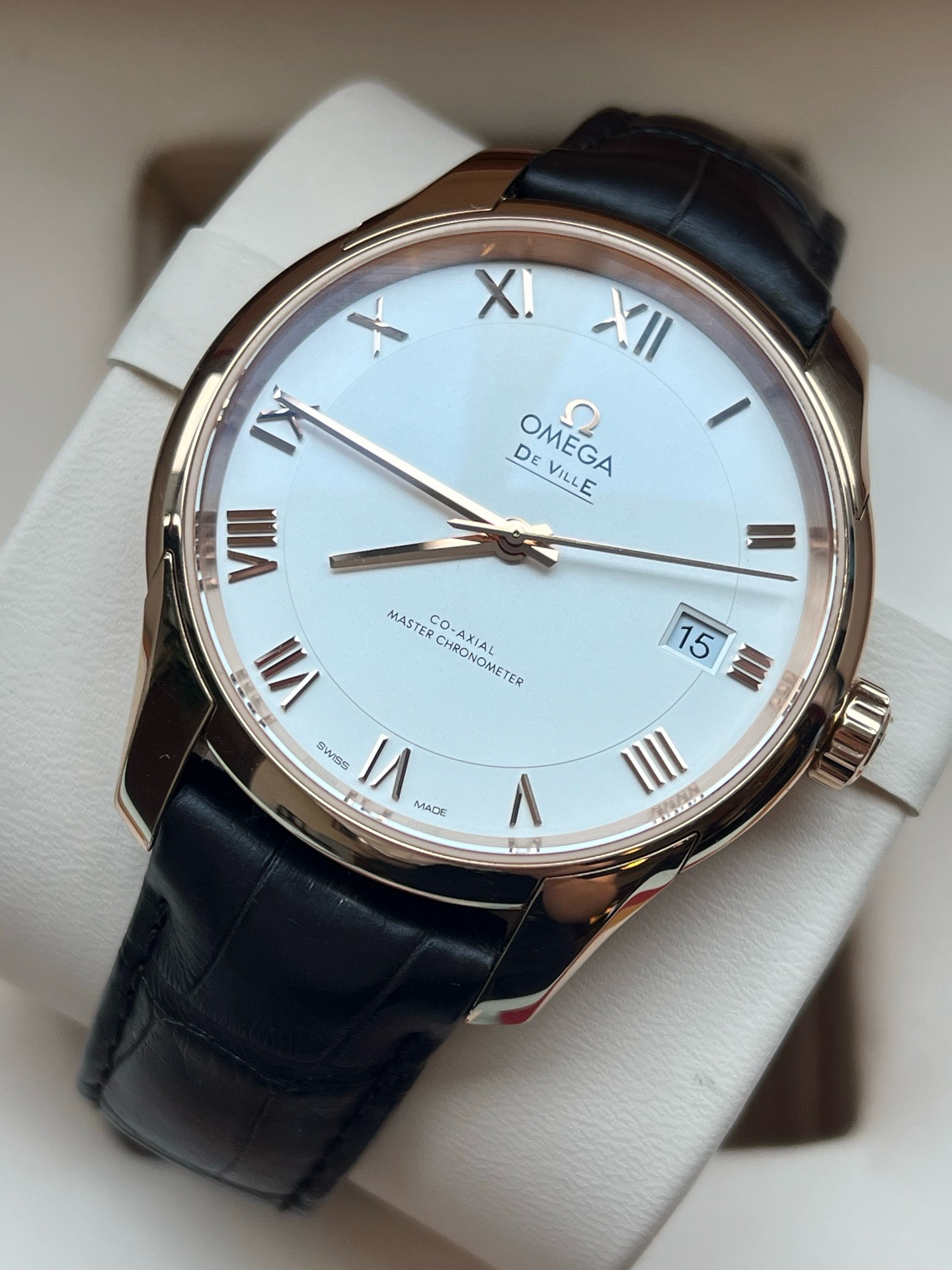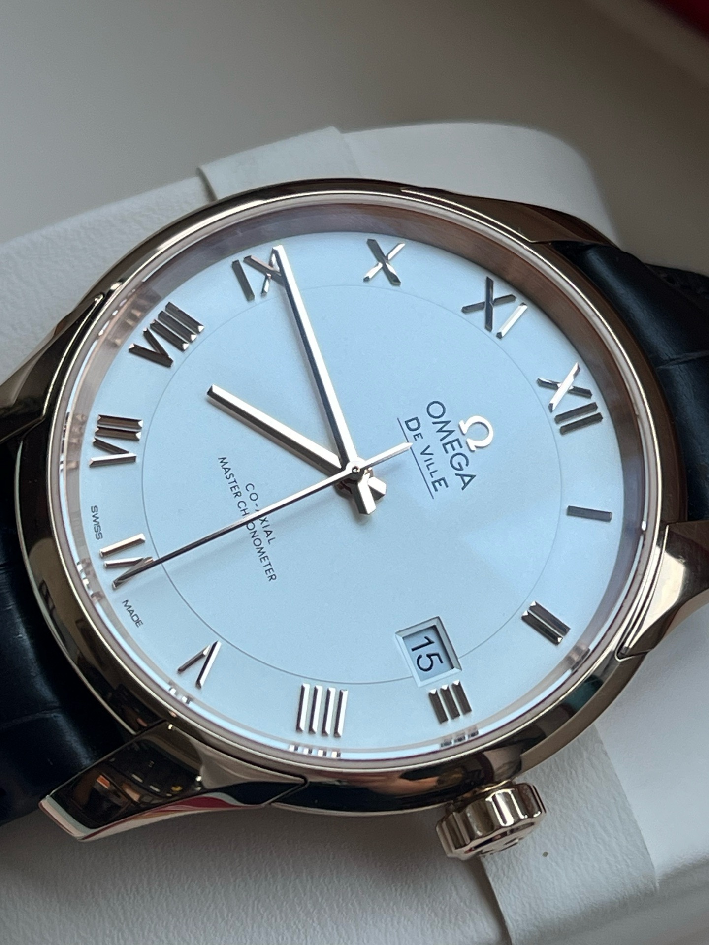 欧米茄碟飞系列433.53.41.21.02.001、男士自动机械腕表、表径:41mm、材质:皮带/18K玫瑰金、白色表盘、罗马数字刻度、日期显示、防磁功能、2019年全套附件、整表,新成色、原价:158500