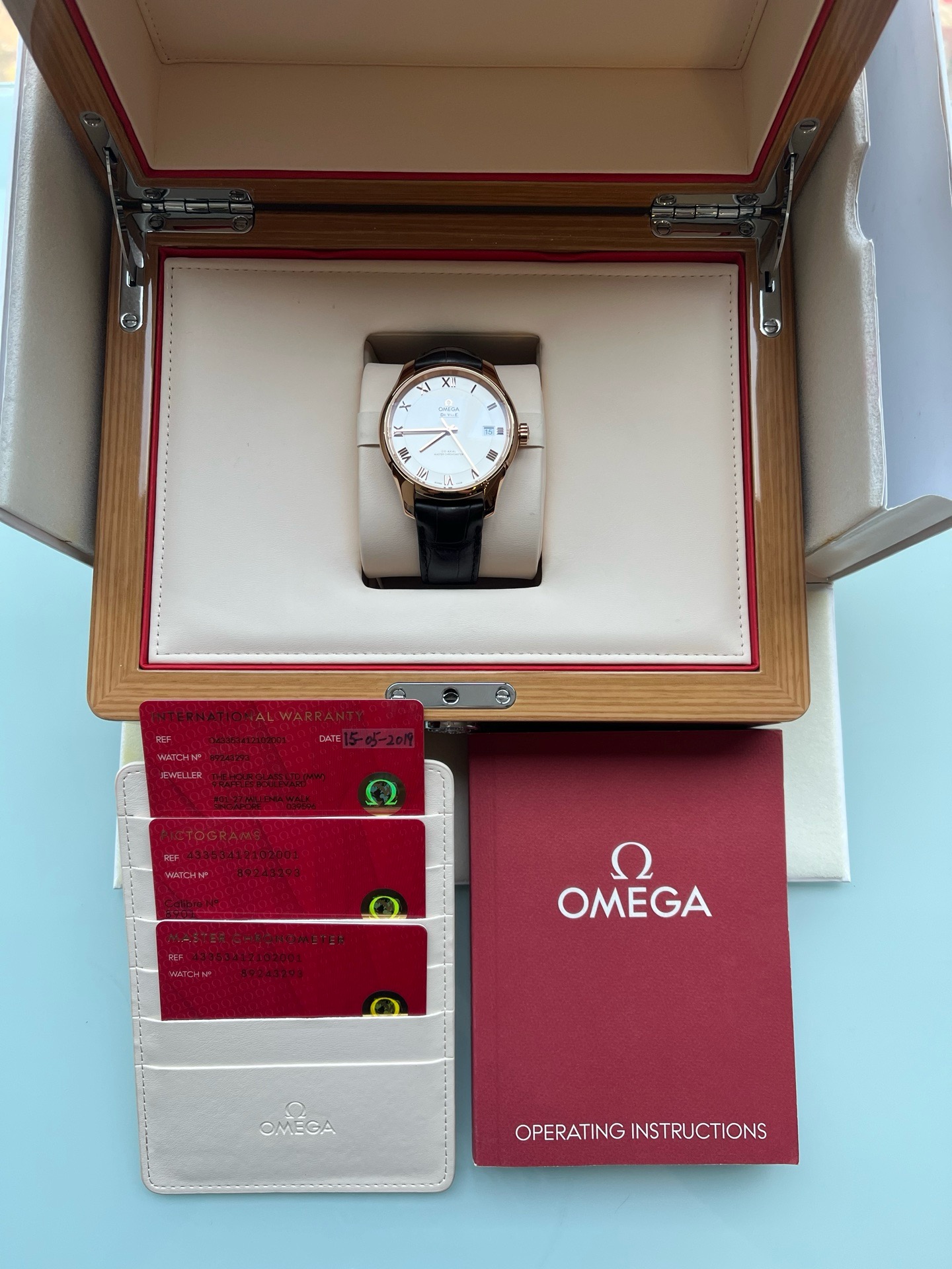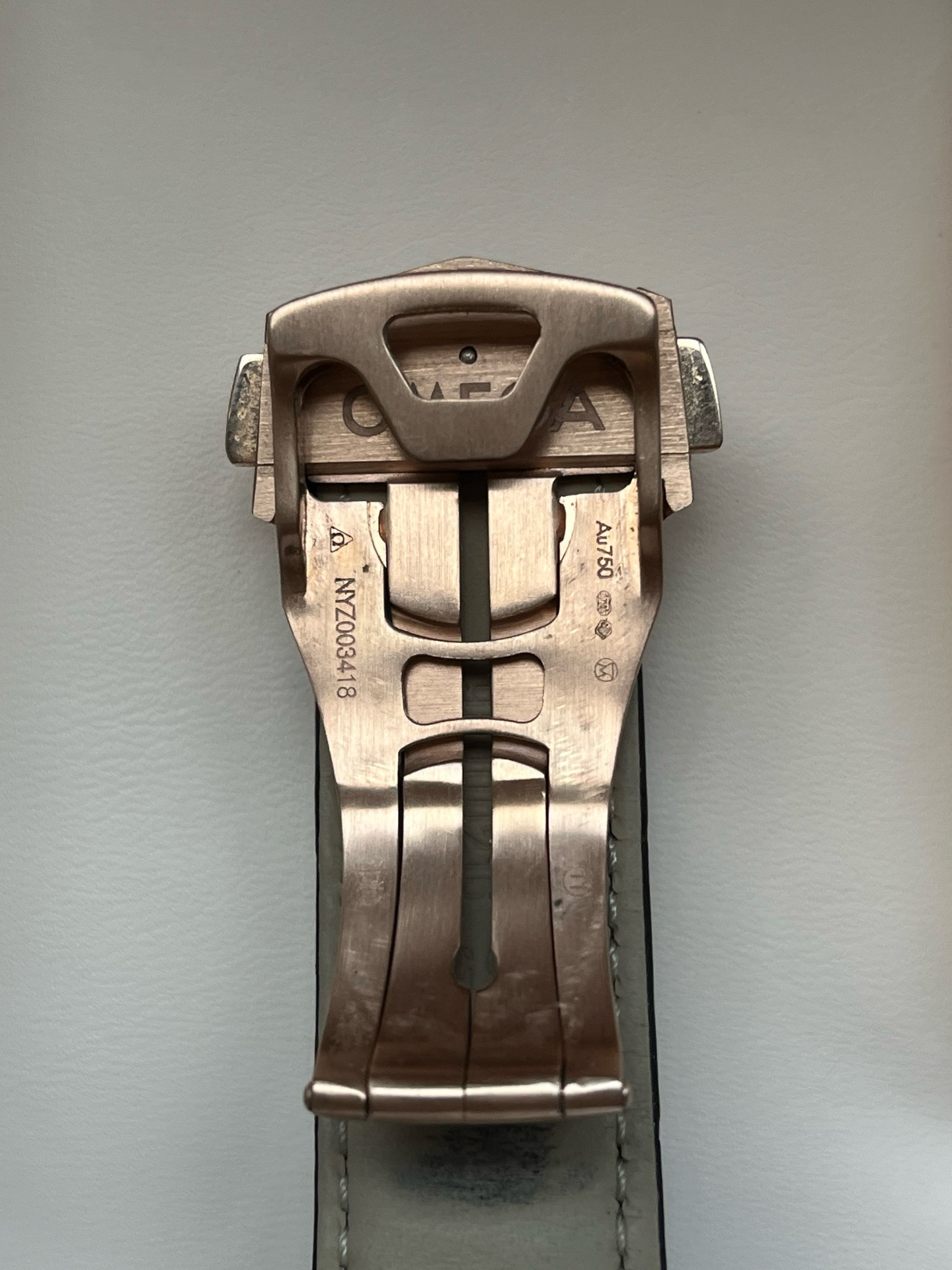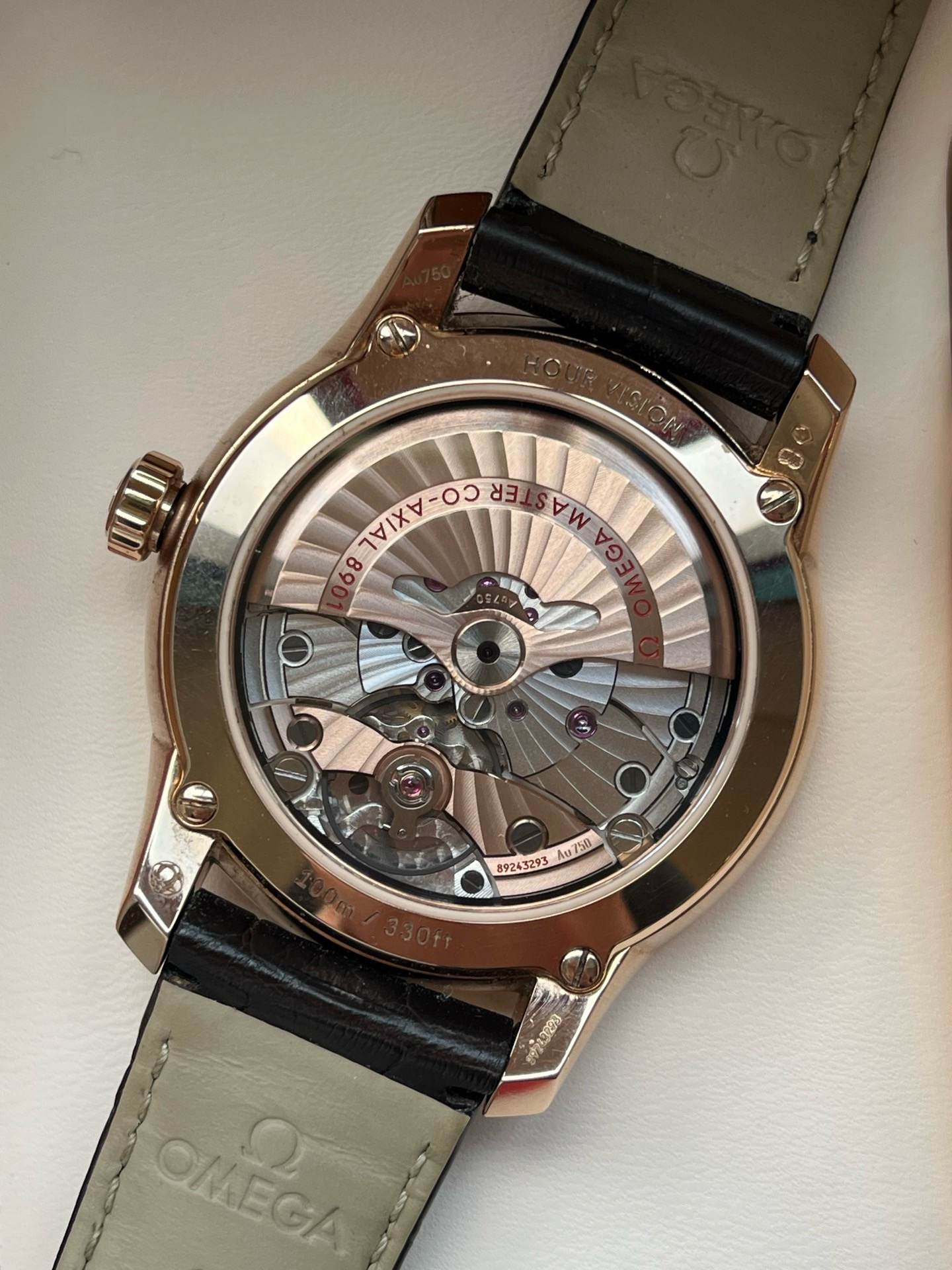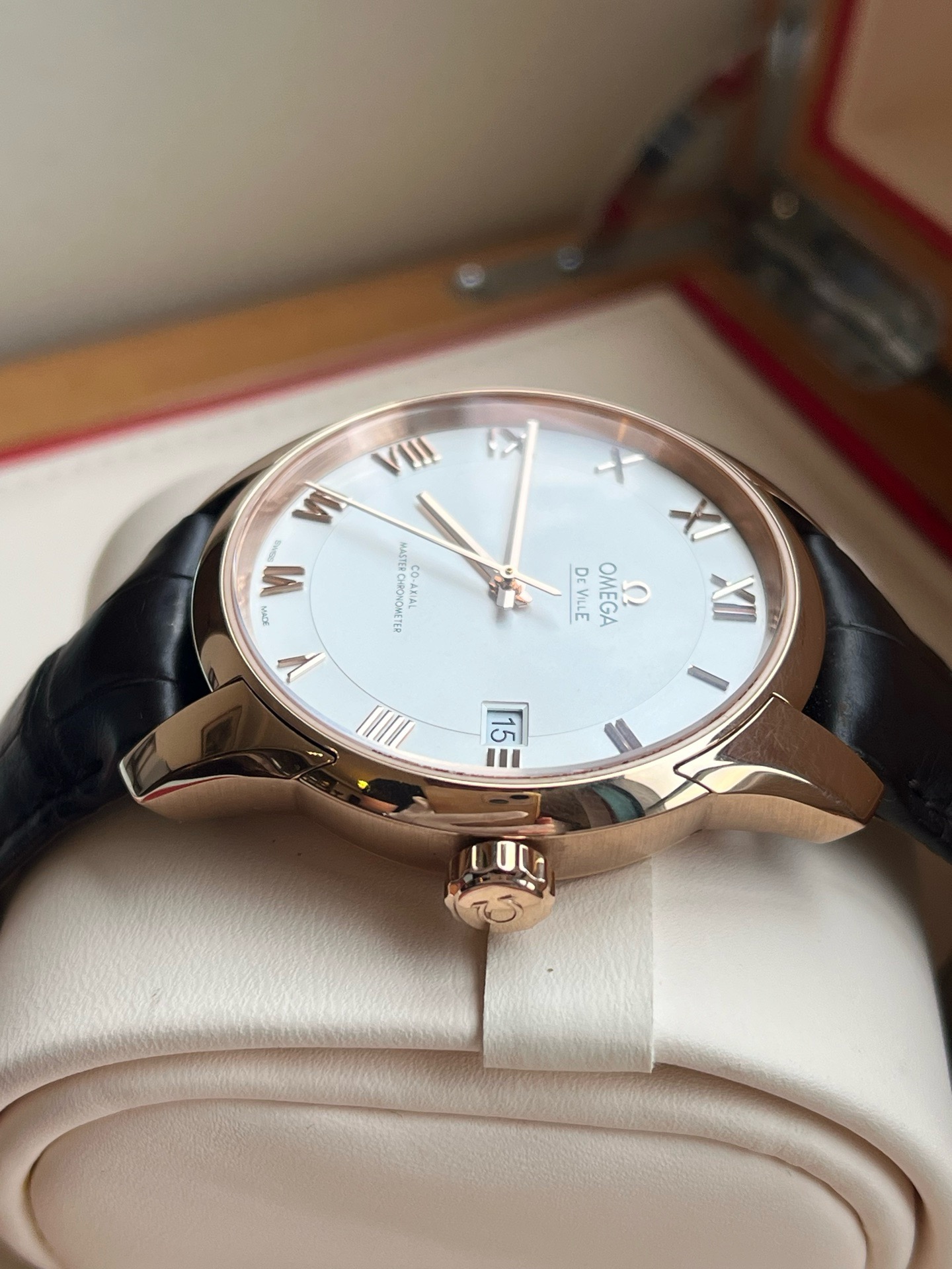 欧米茄碟飞系列433.53.41.21.02.001、男士自动机械腕表、表径:41mm、材质:皮带/18K玫瑰金、白色表盘、罗马数字刻度、日期显示、防磁功能、2019年全套附件、整表,新成色、原价:158500
